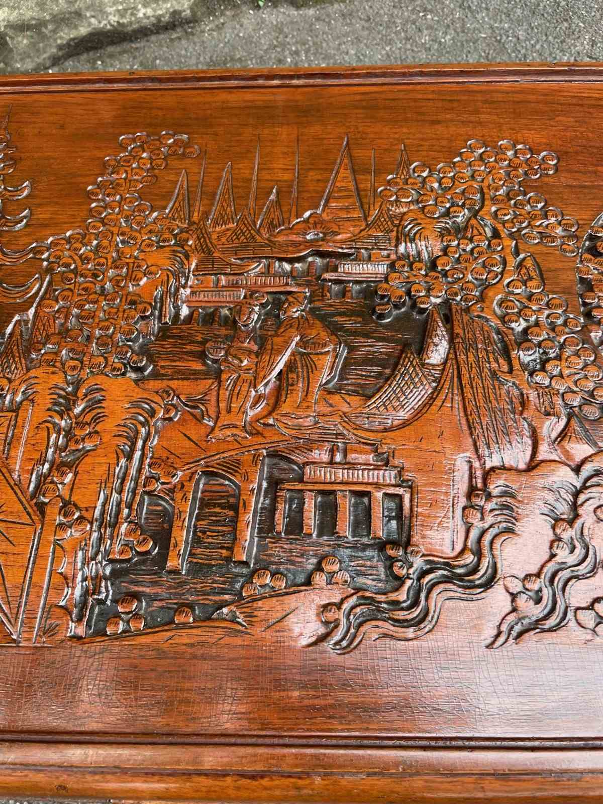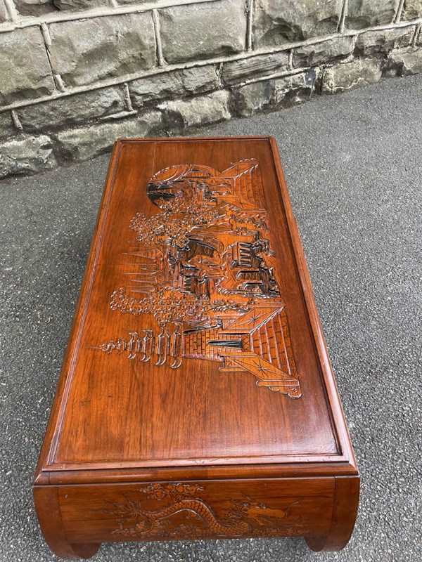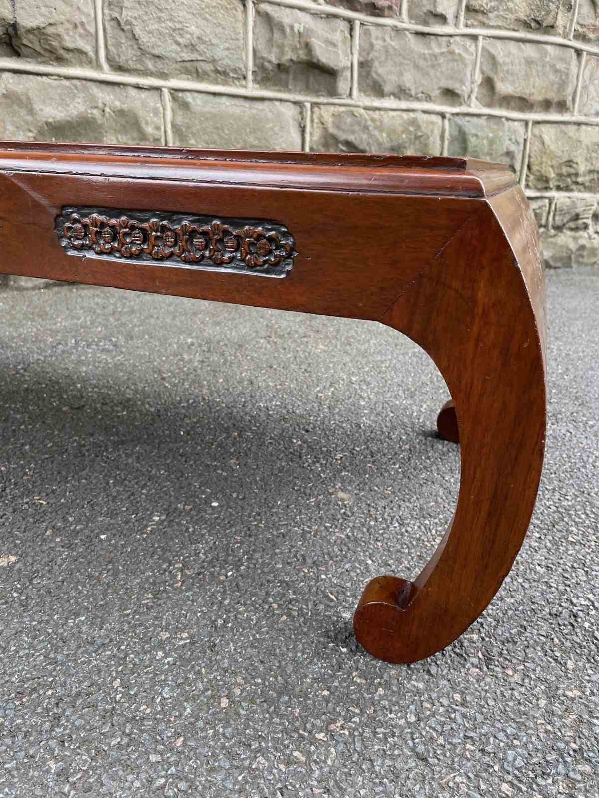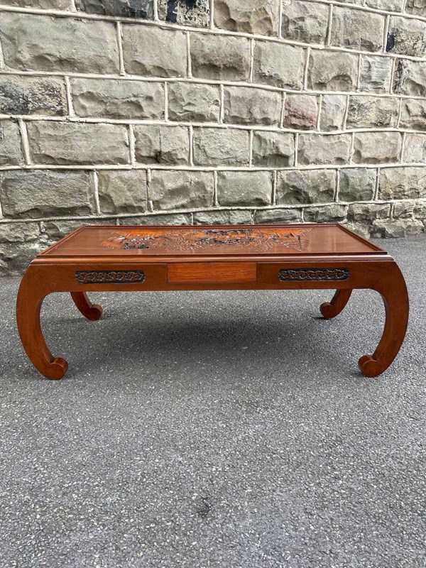 Made from Chinese native hardwood Ideal as a coffee table. Ornate carved top & frieze with curved scrolling legs, central draw.