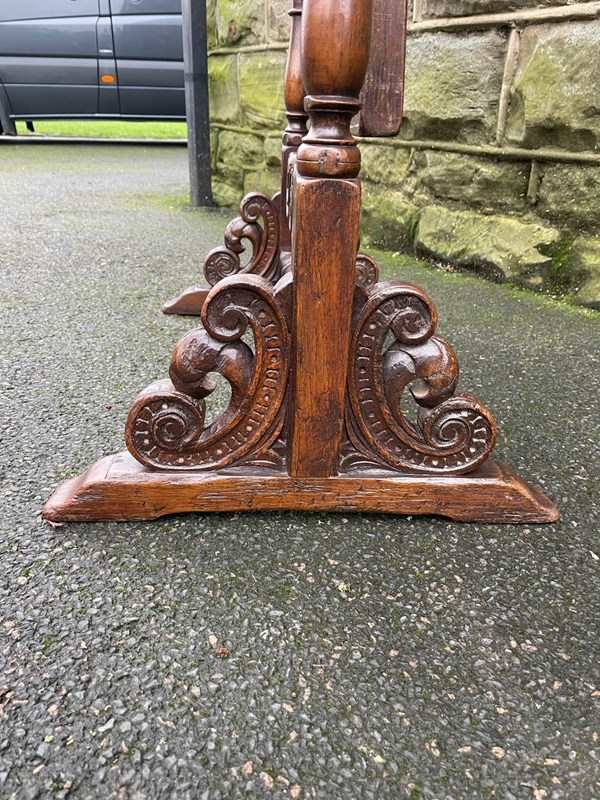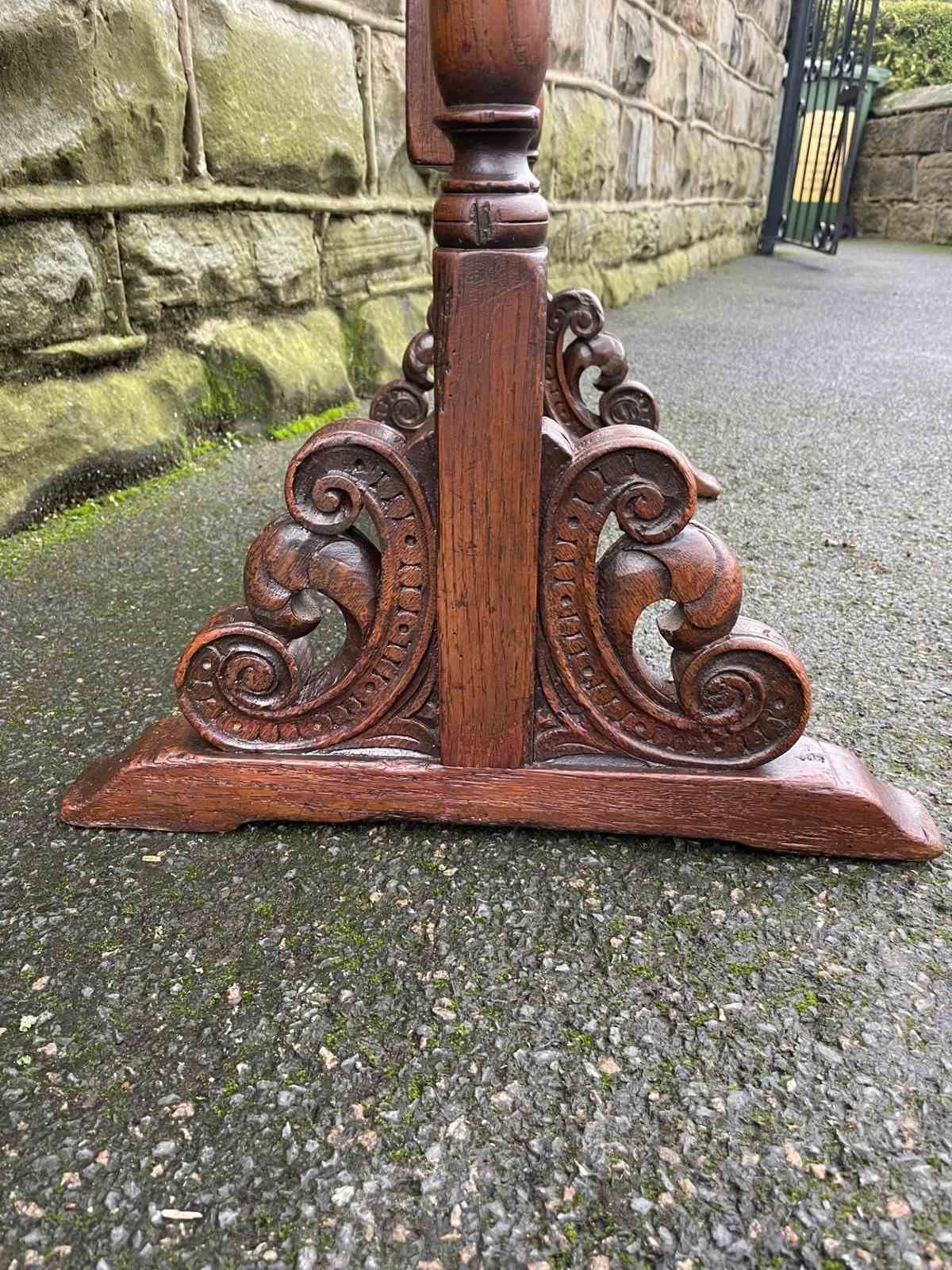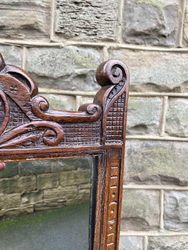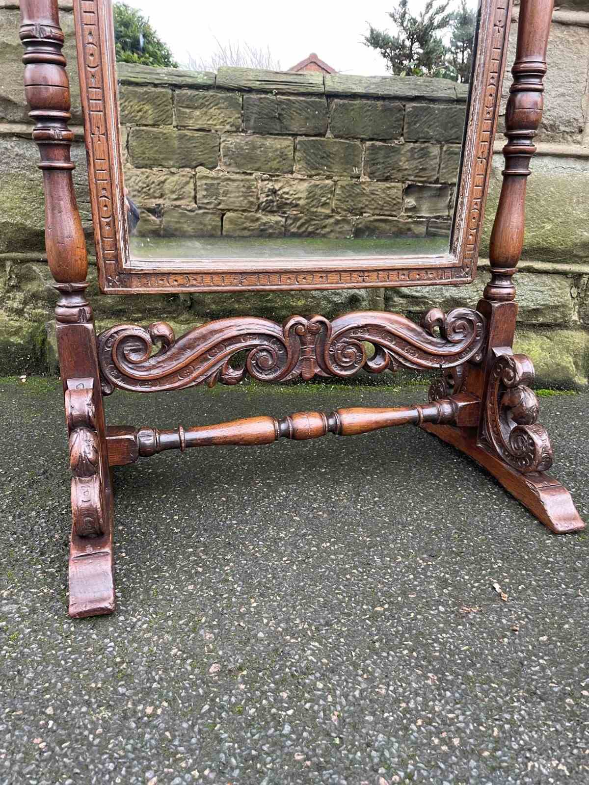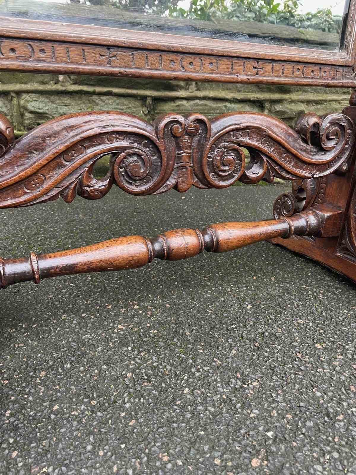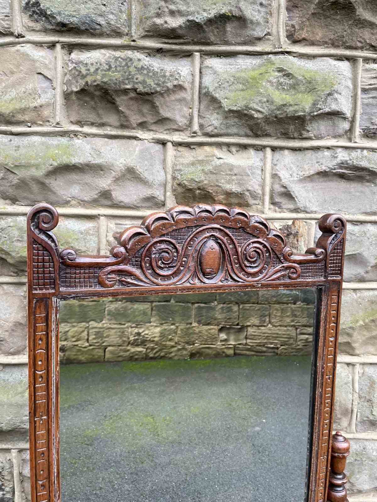 Very decorative mirror, the mirror frame have a carved edge with carved pediment to the top. Supported within 2 turned oak uprights with a carved & turned central stretcher and well carved shaped feet