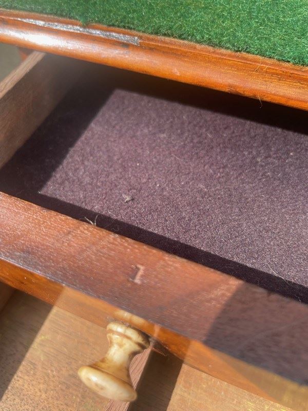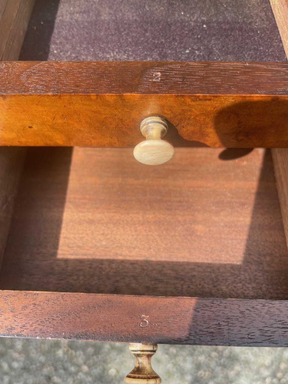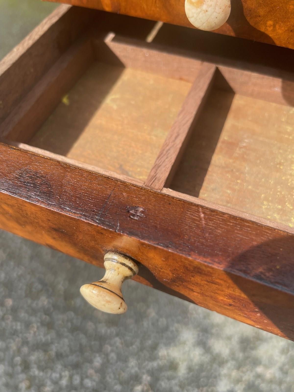 The draws in burr walnut with turned handles, 4 small to one side & 1 larger to the other with series of pinholes for possibly drill bits etc.