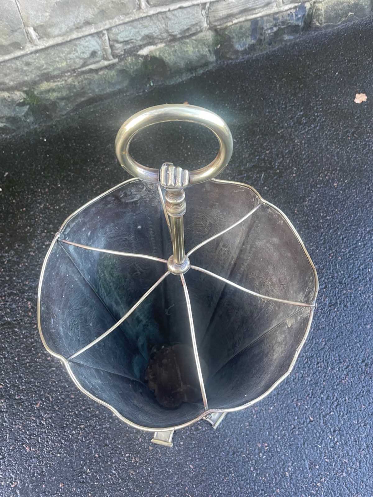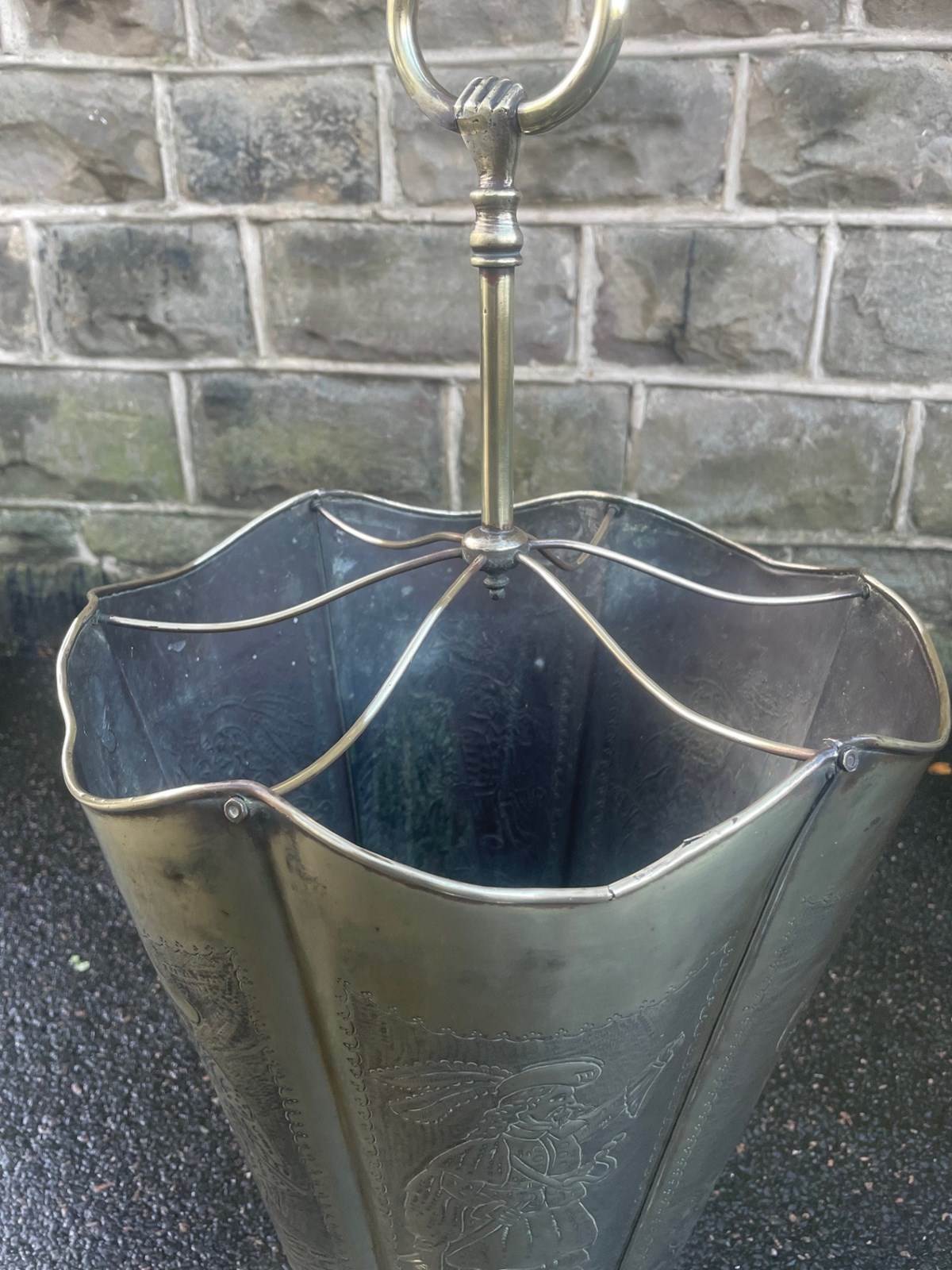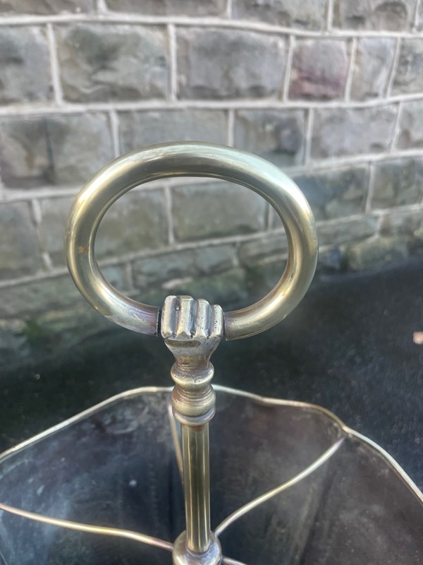 Dating from 1880 in brass & in the form of an umbrella. It has embossed decoration to the sides or cavaliers, shaped divides with brass column a clenched hand holding a brass ring to carry it with.