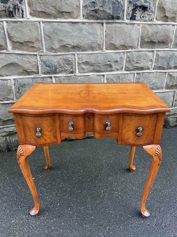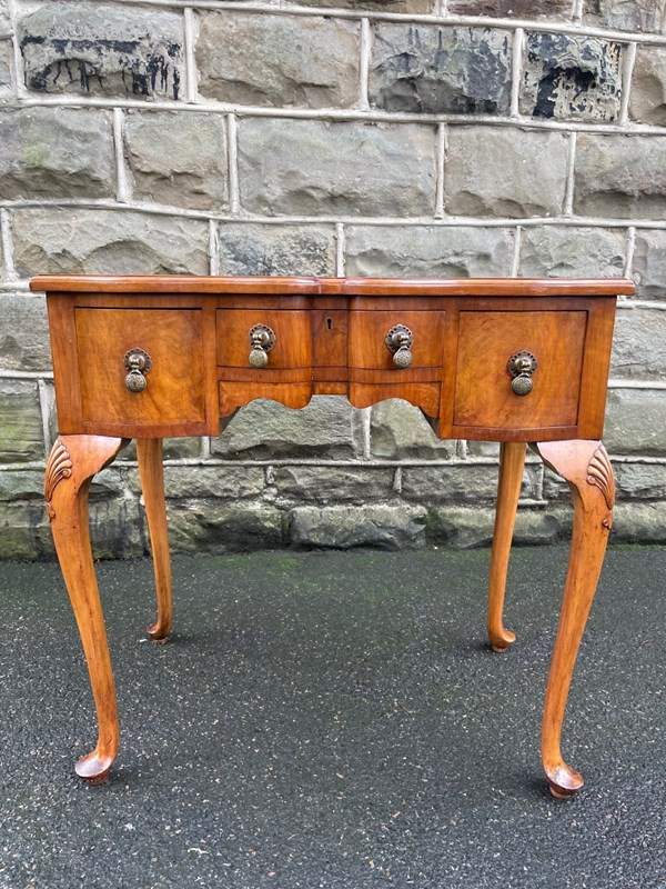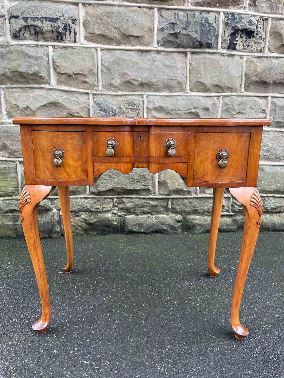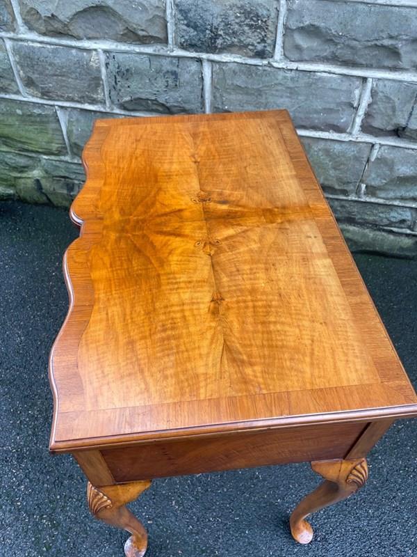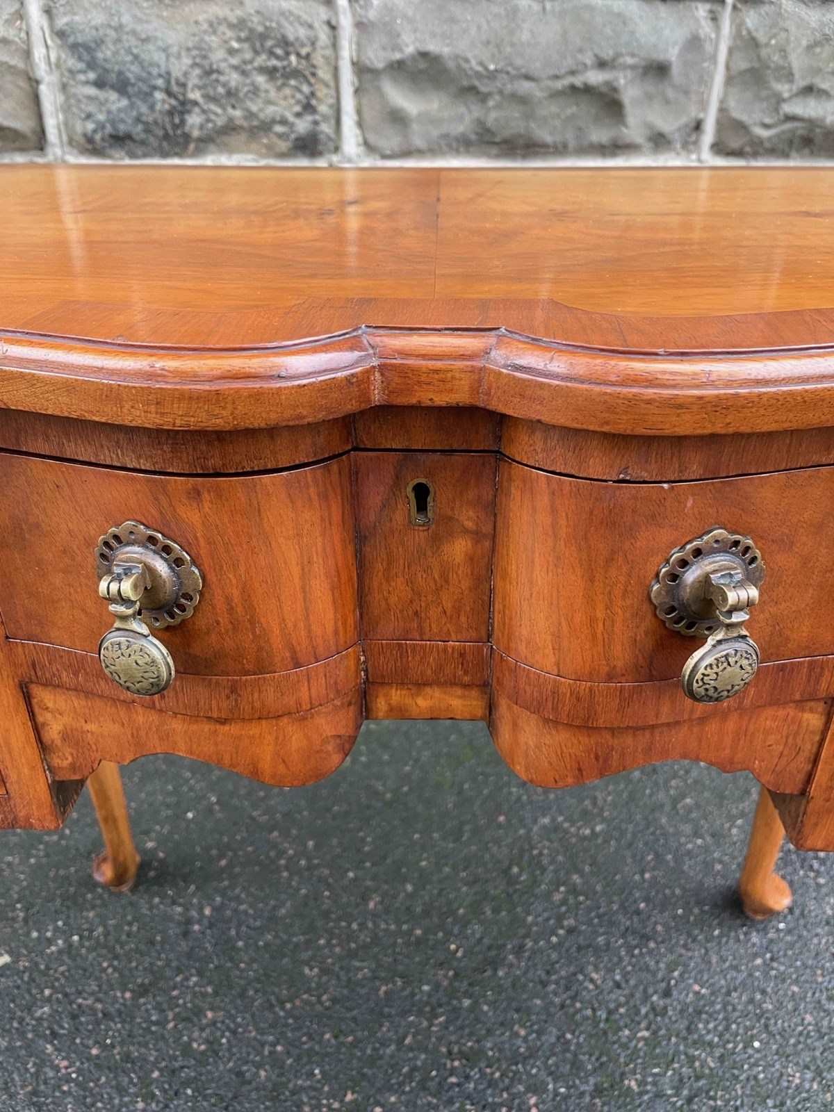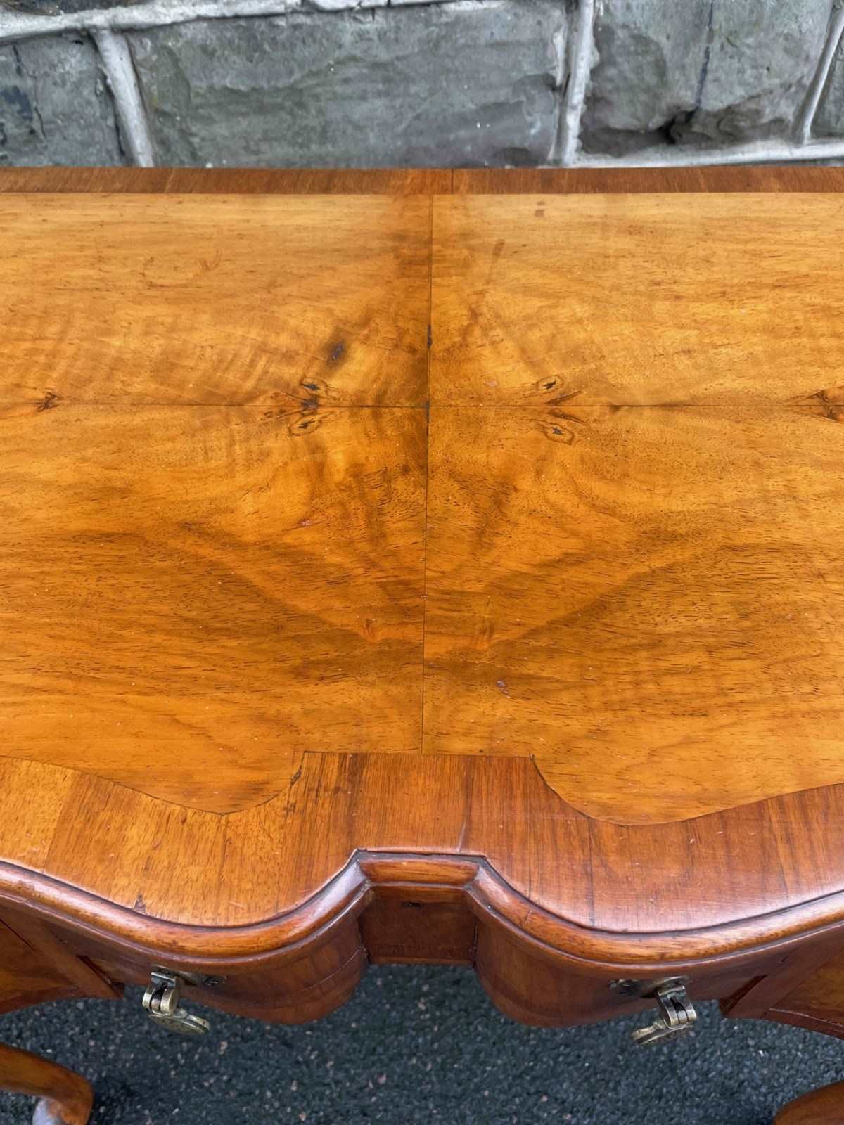In figured walnut, the top having a crossbanded border. It has large central drawer with 2 smaller draws either side, with ornate brass handles. It stands on slender shell carved cabriole legs.