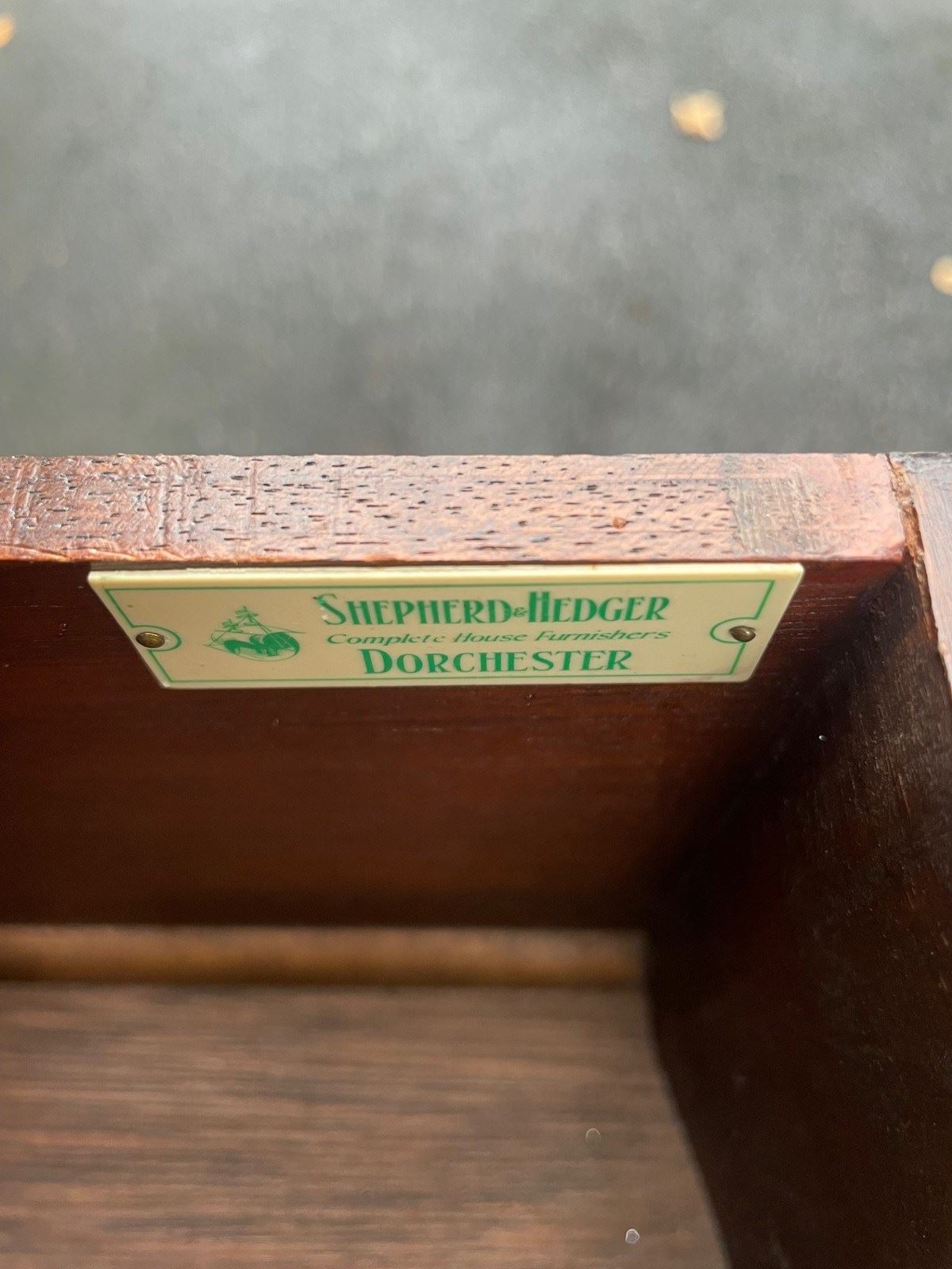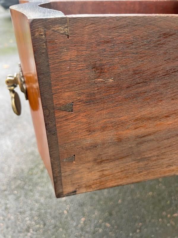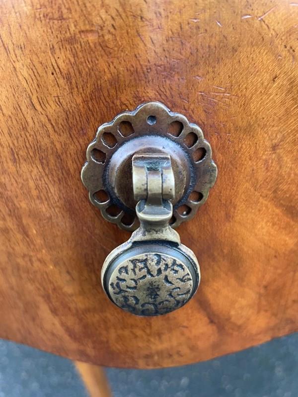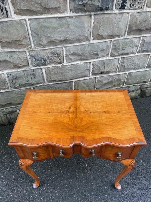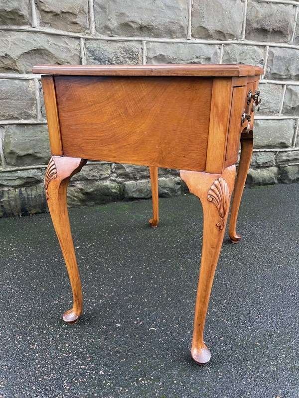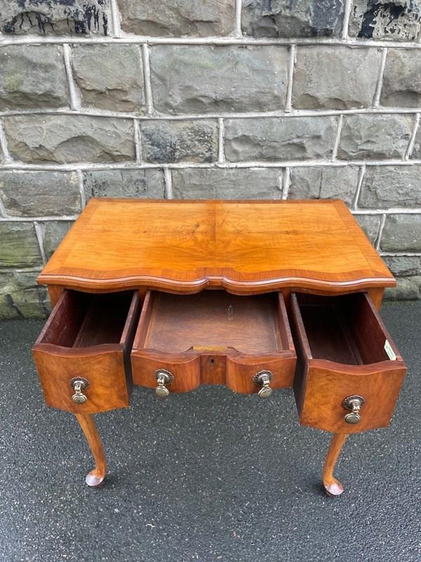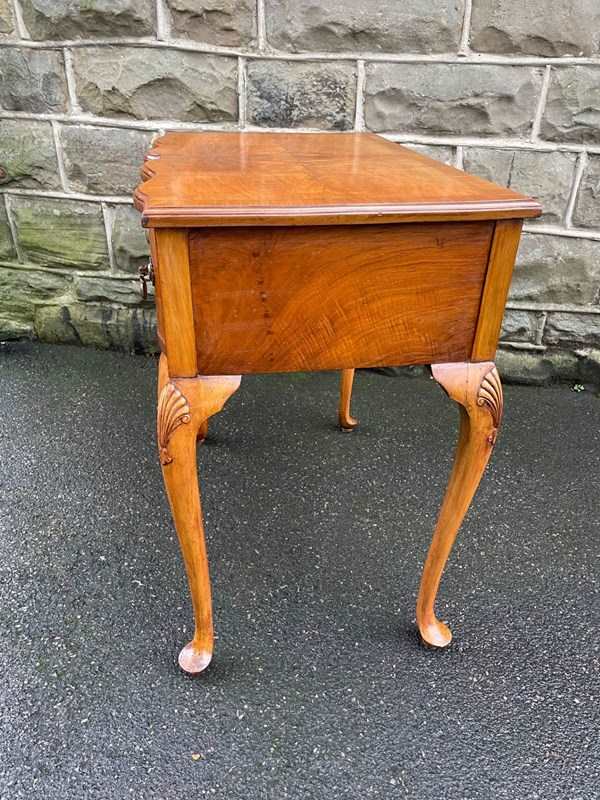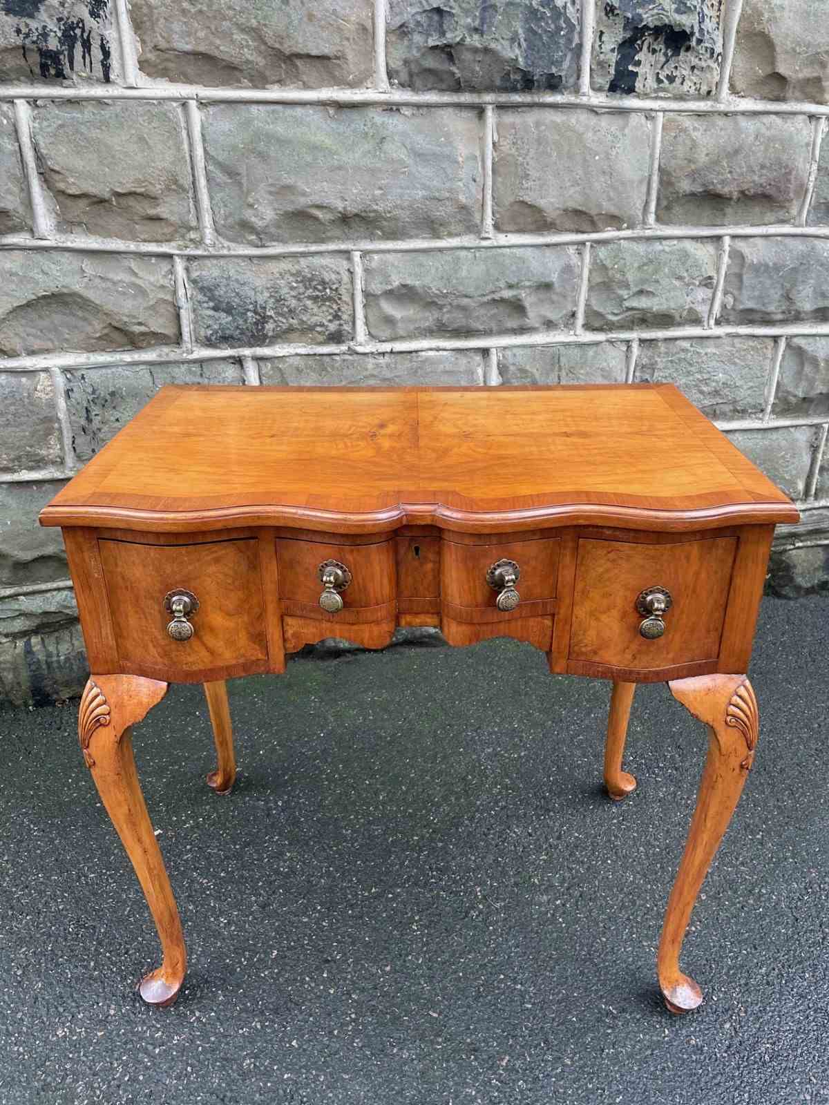 In figured walnut, the top having a crossbanded border. It has large central drawer with 2 smaller draws either side, with ornate brass handles. It stands on slender shell carved cabriole legs.