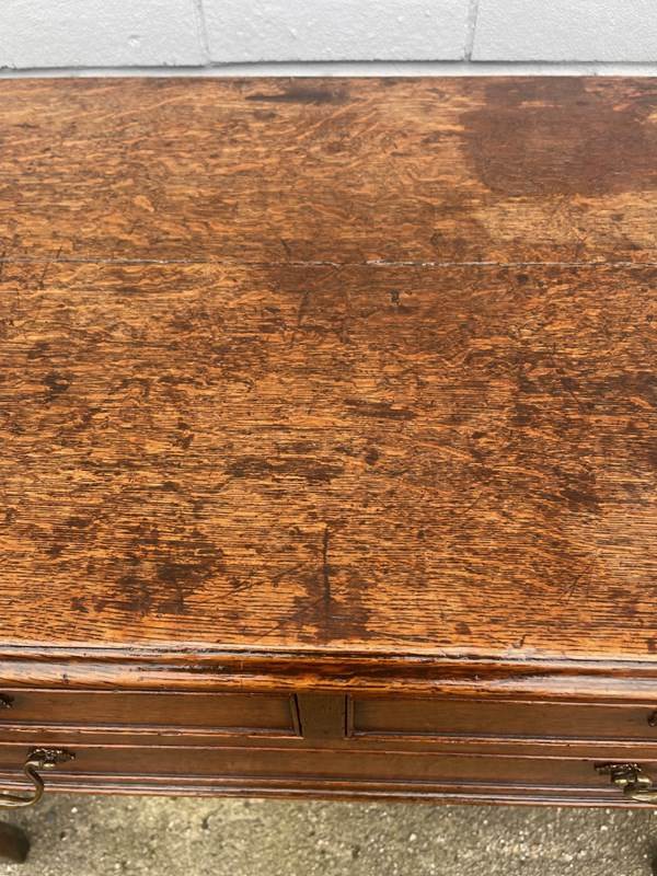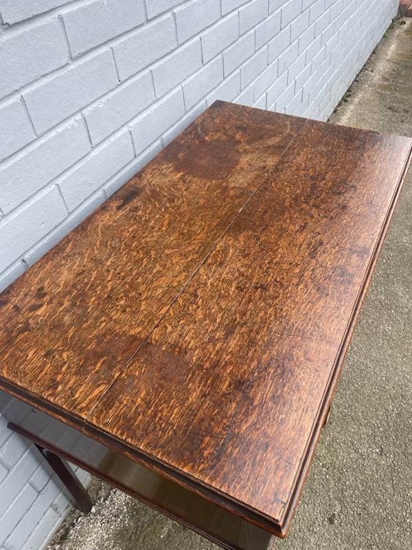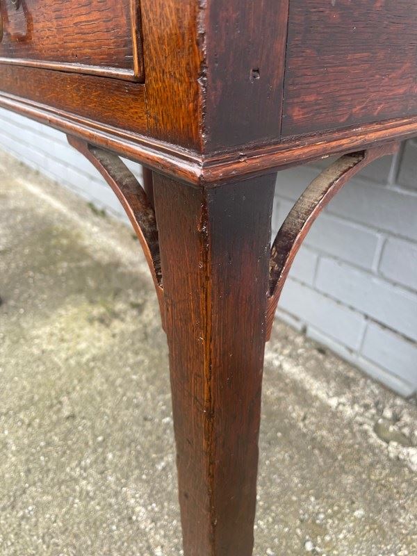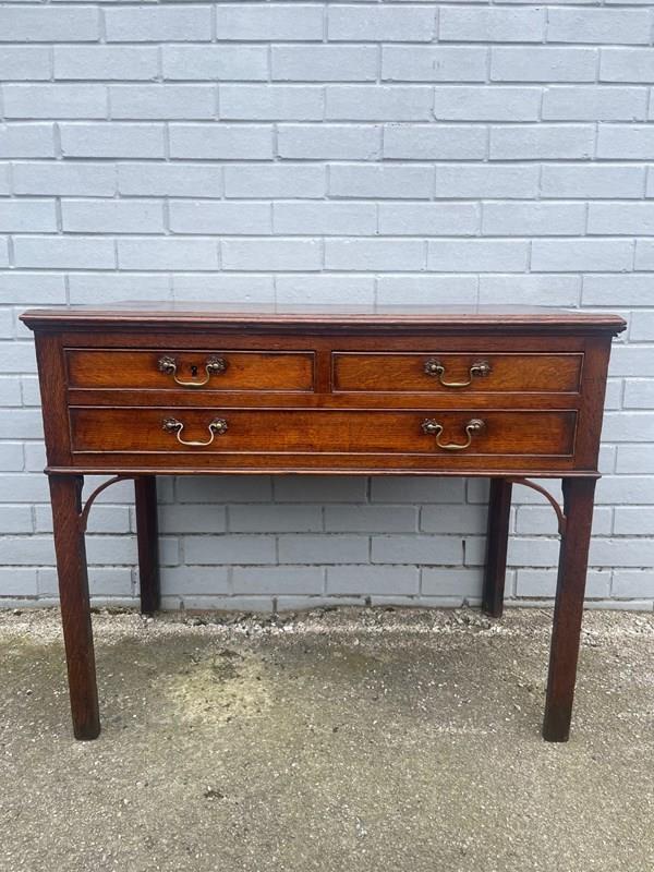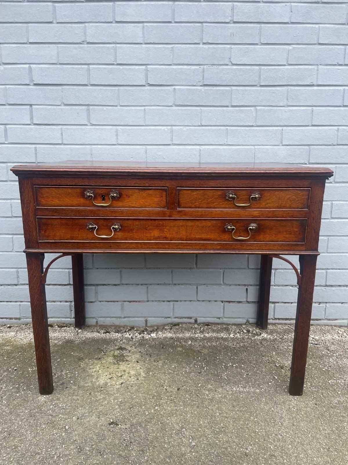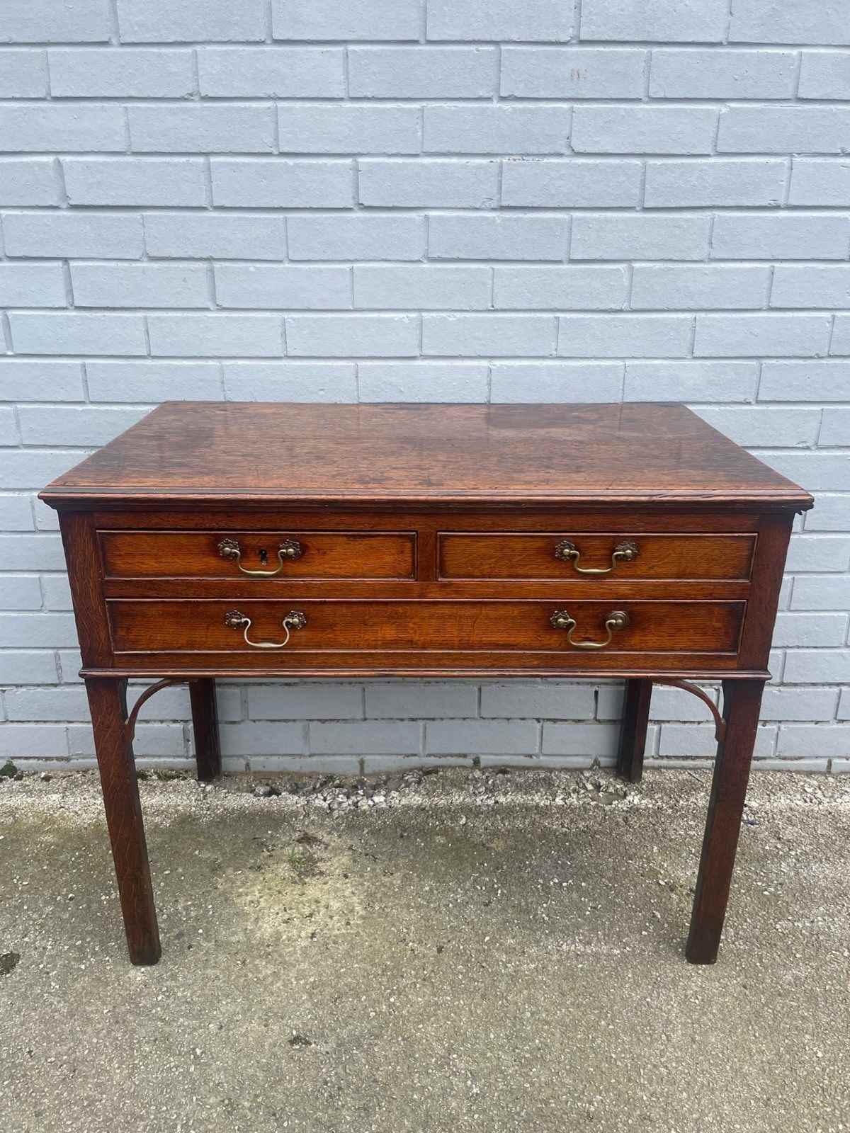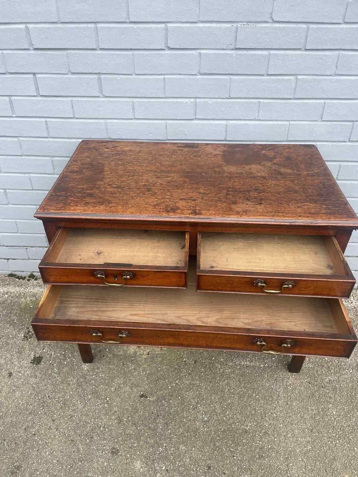 In oak having 2 small draws over a larger single draw with the original brass handles. Standing on on square chamferred legs. Great colour and patina