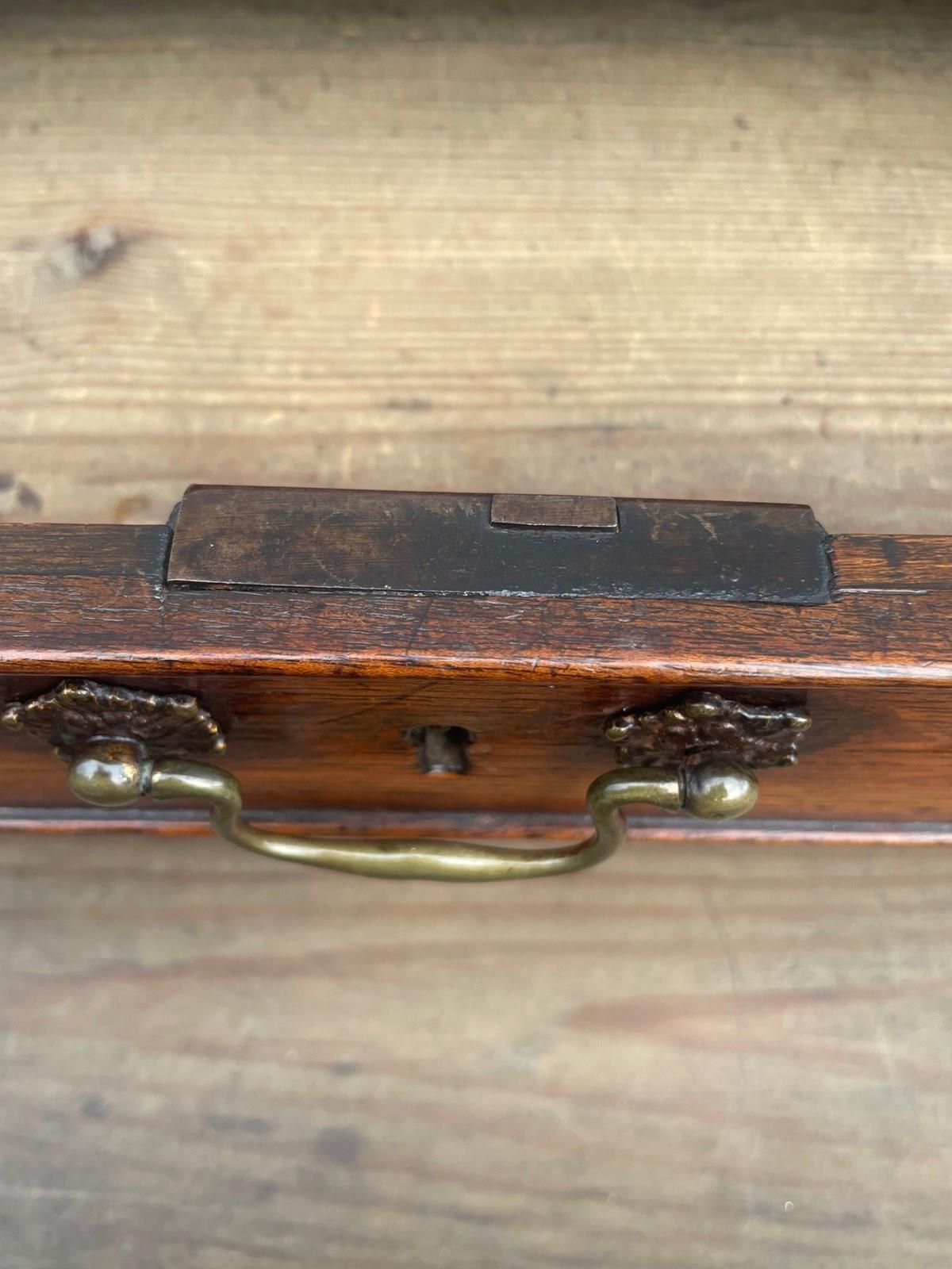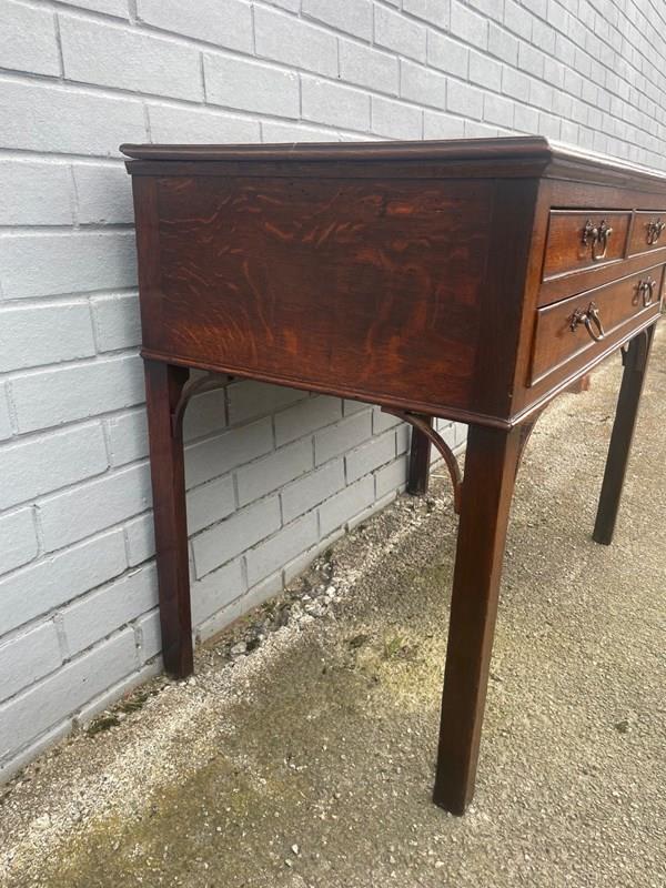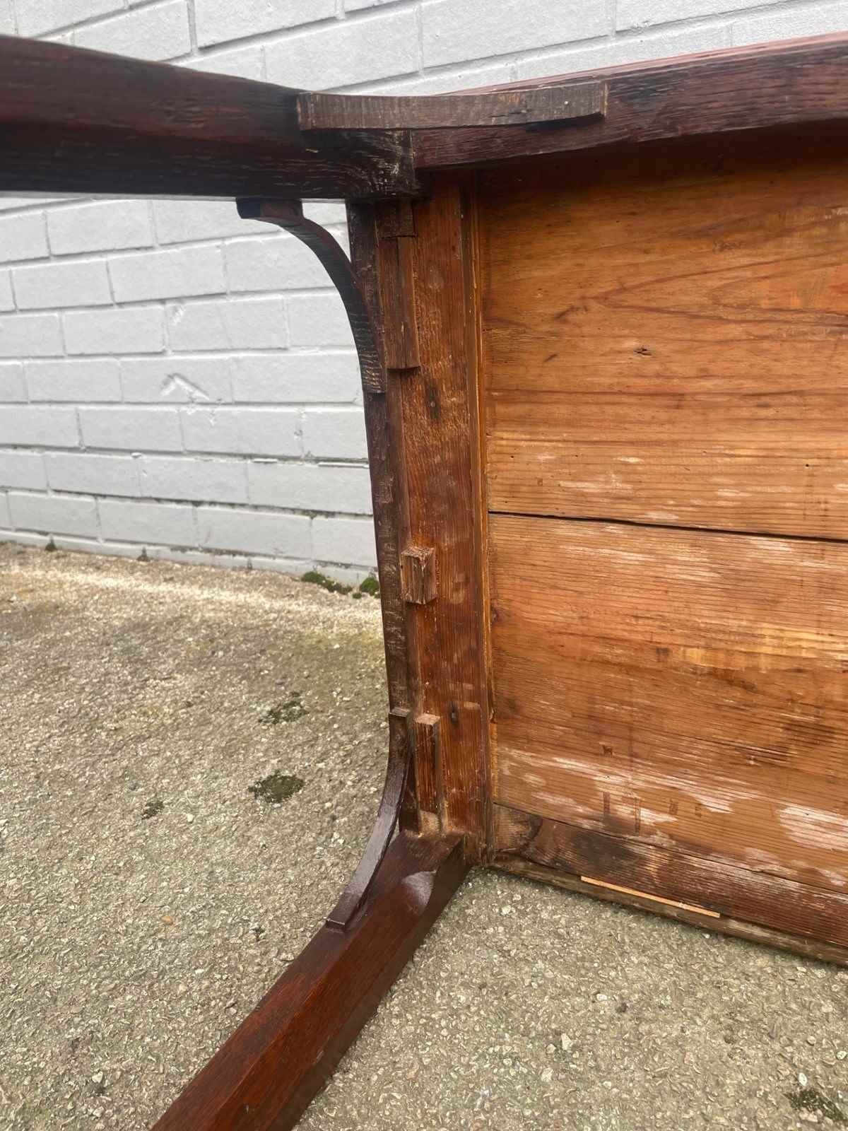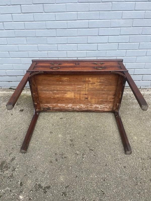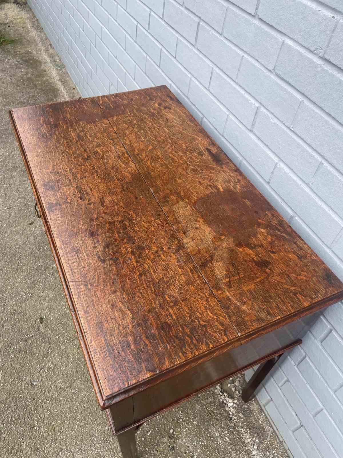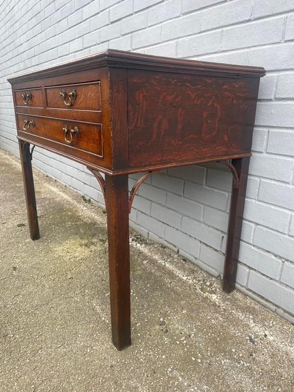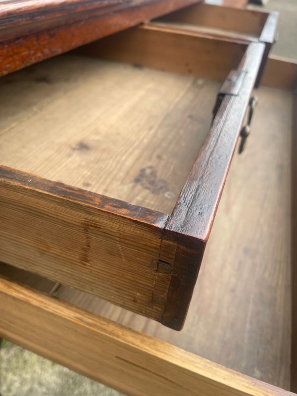 In oak having 2 small draws over a larger single draw with the original brass handles. Standing on on square chamferred legs. Great colour and patina