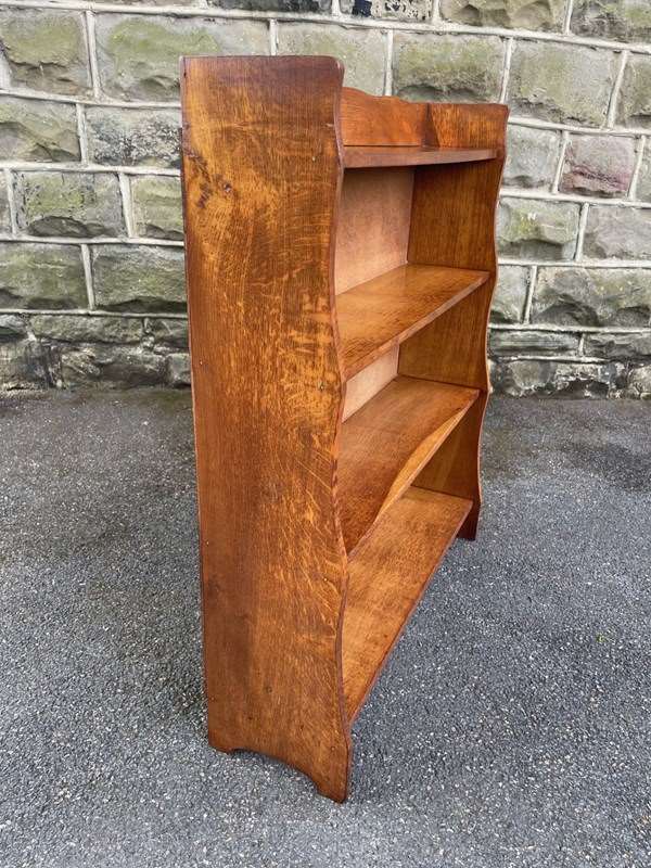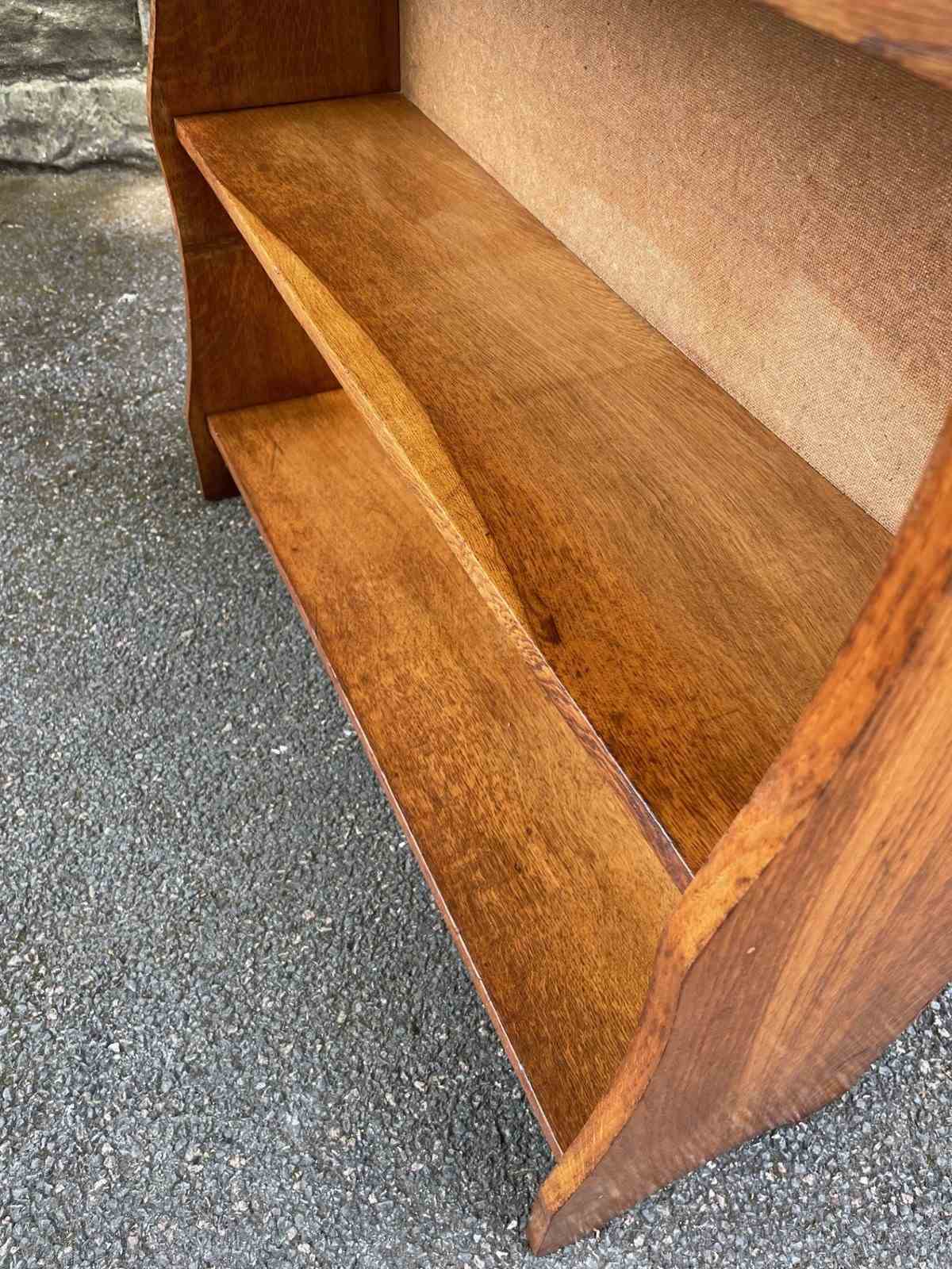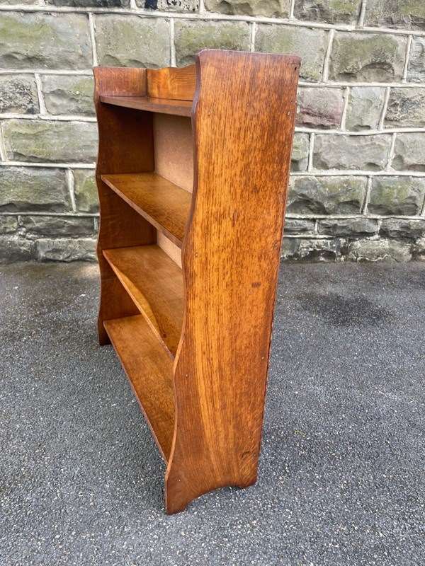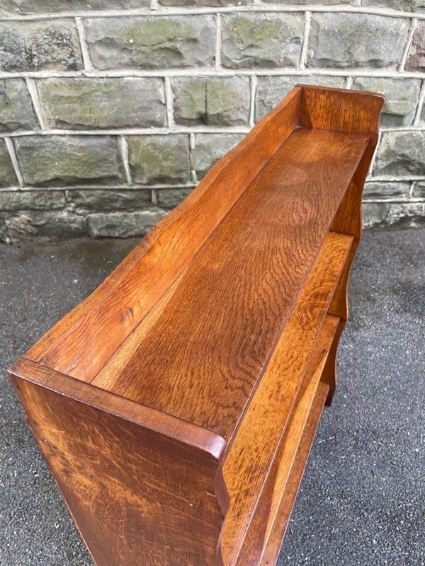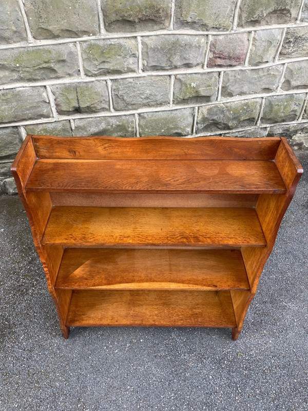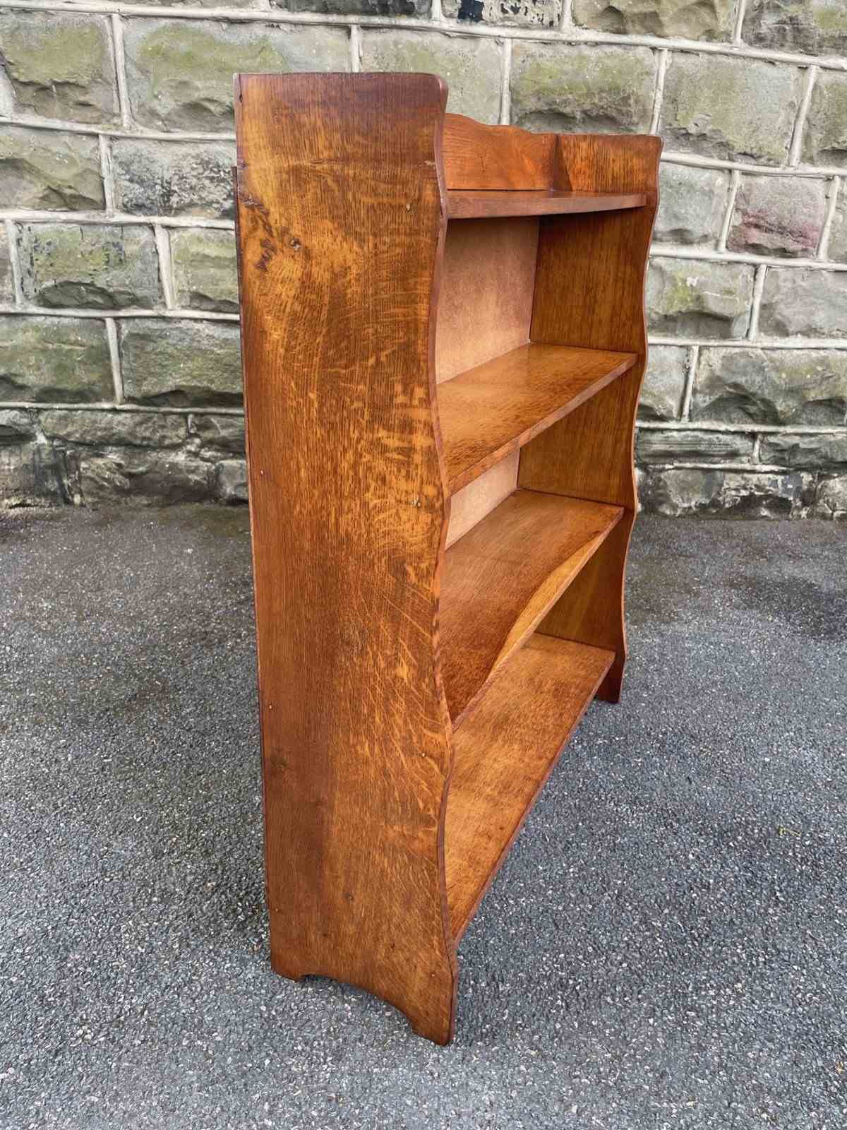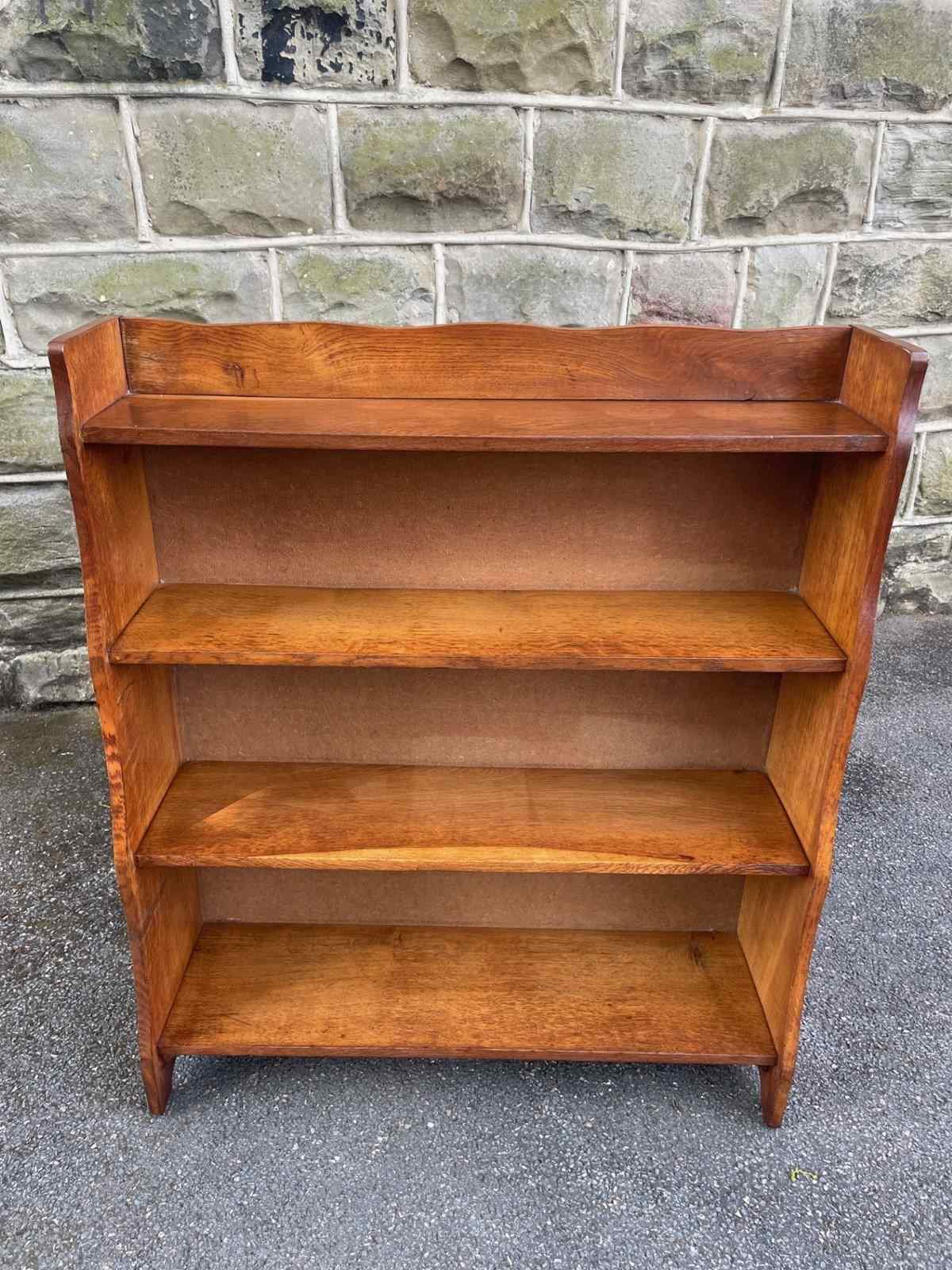 In solid oak which is a light golden colour, raised gallery back, 4 fixed height oak shelves, polished oak sides standing on shaped feet.