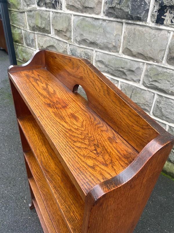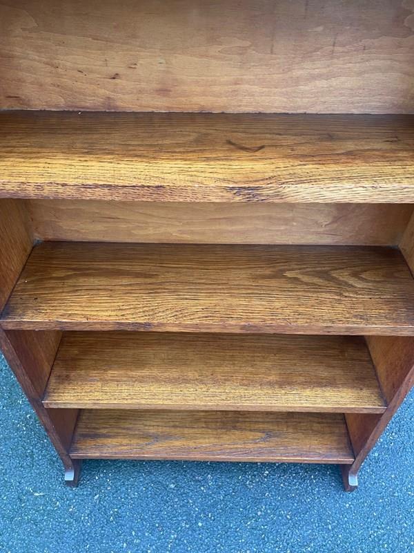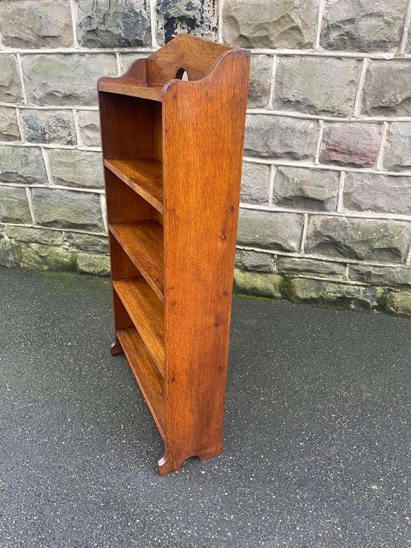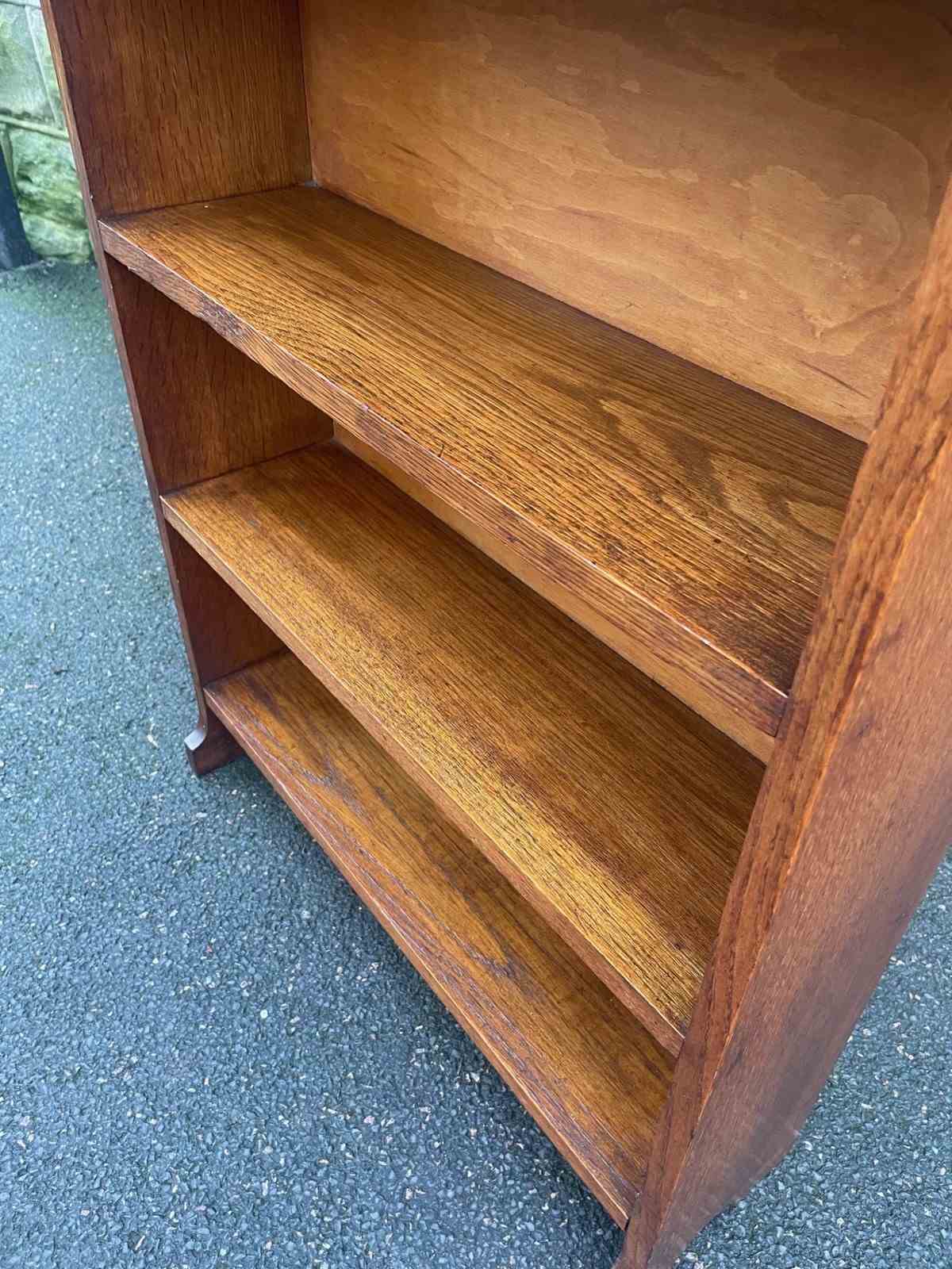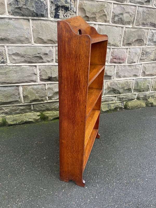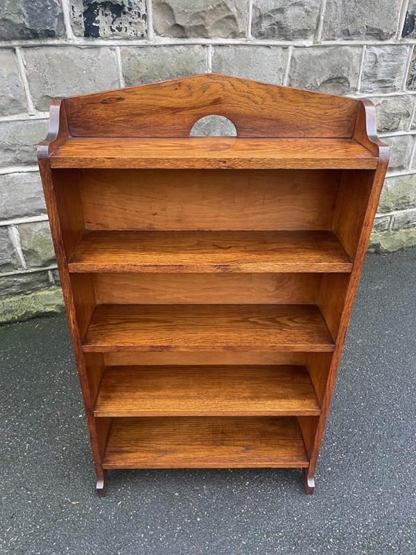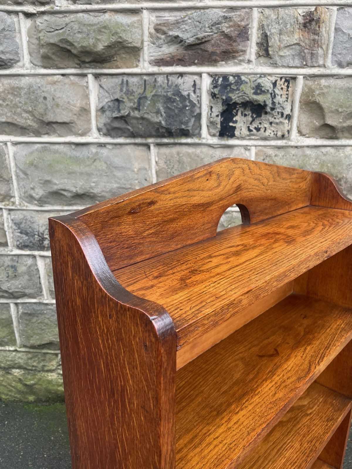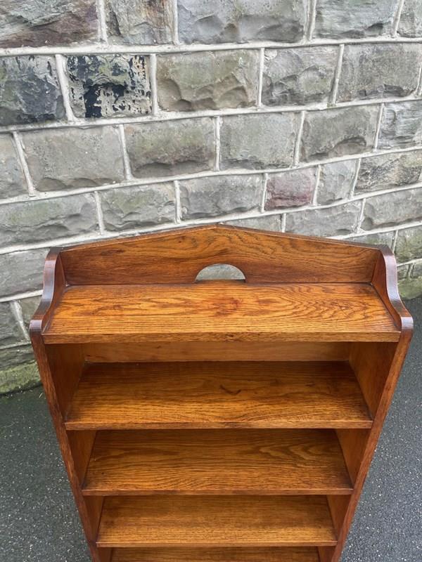 Made from solid oak which is a light golden colour, raised gallery back, 5 fixed height oak shelves with shaped feet. Polished oak sides.