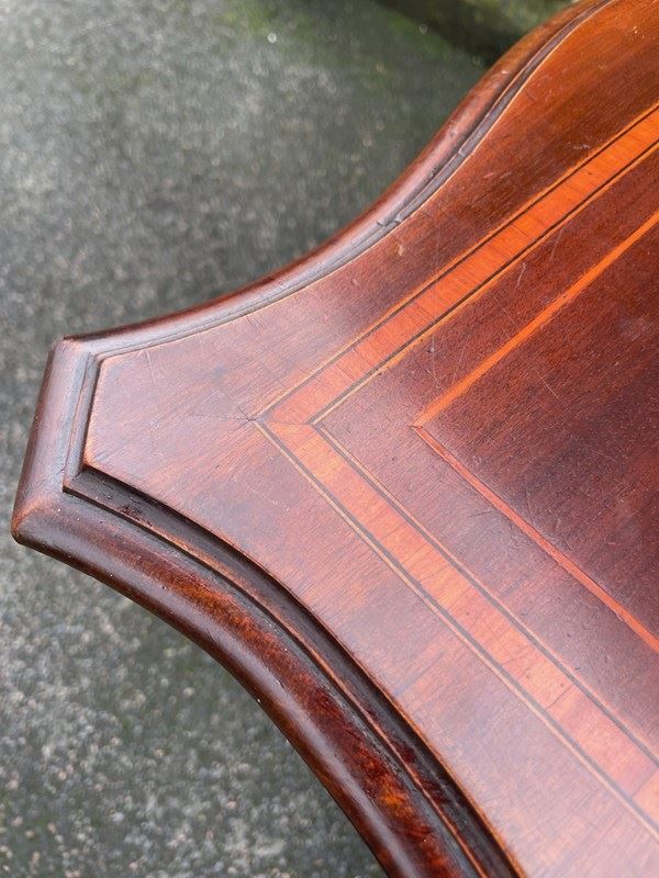In solid mahogany, the shaped top with inlaid satinwood banded decoration. It has mahogany slats to each side with fixed shelves, plinth base with a mahogany cross stretcher base with castors. Revolves around smoothly.