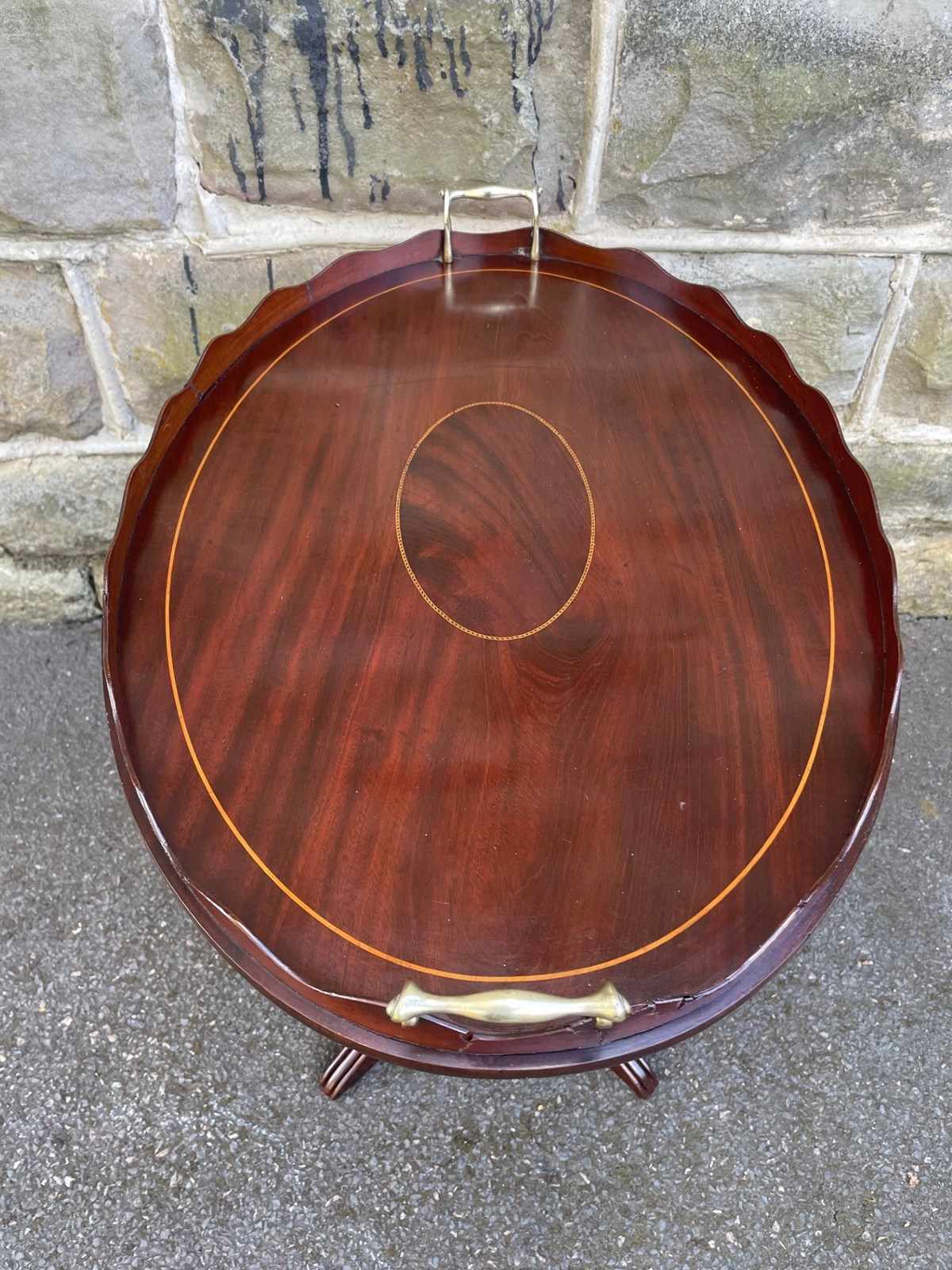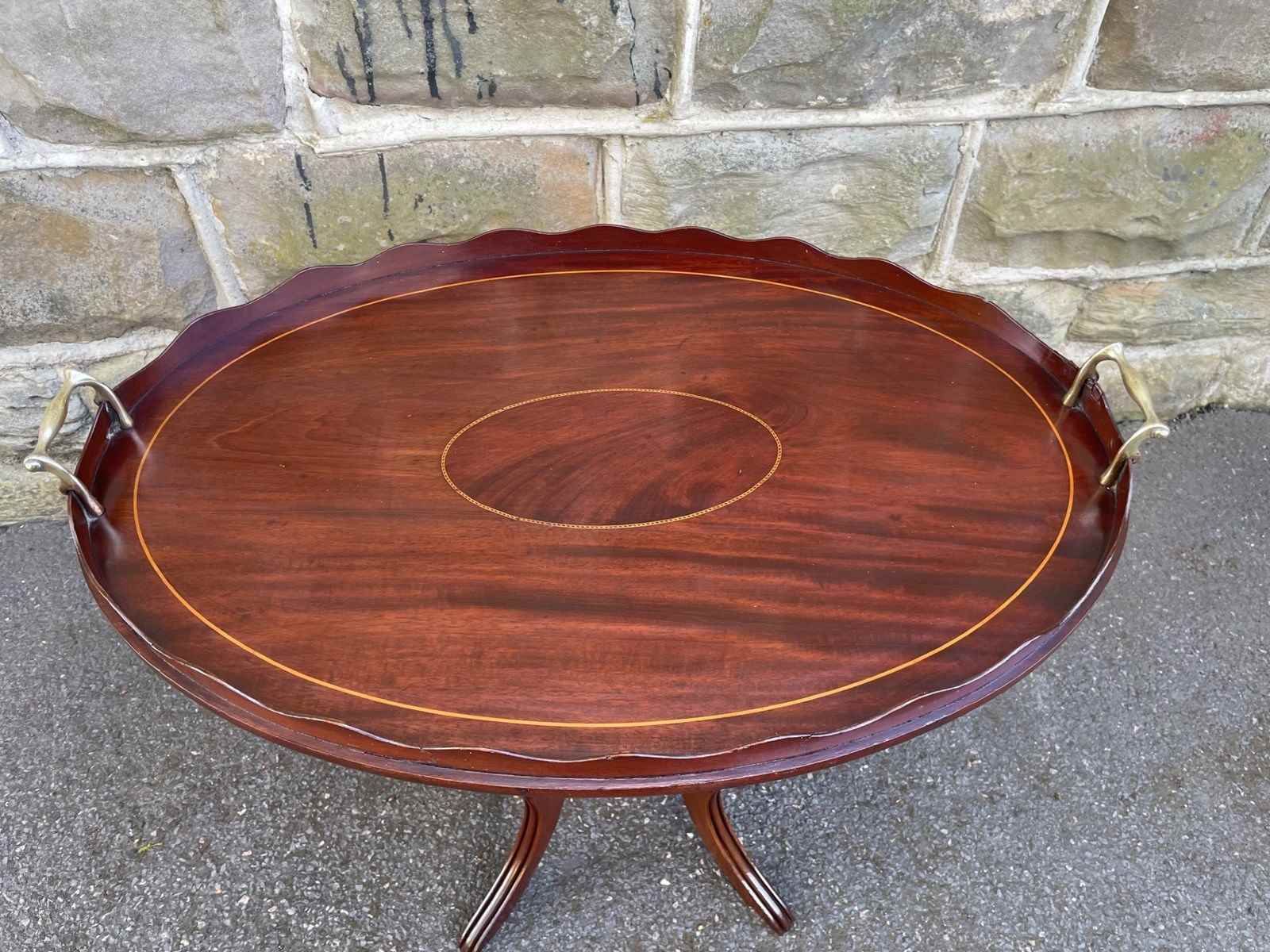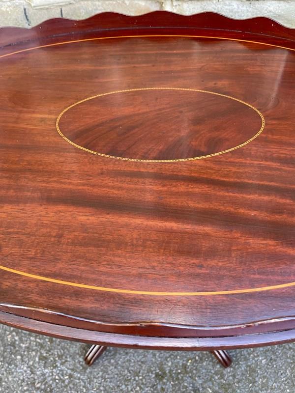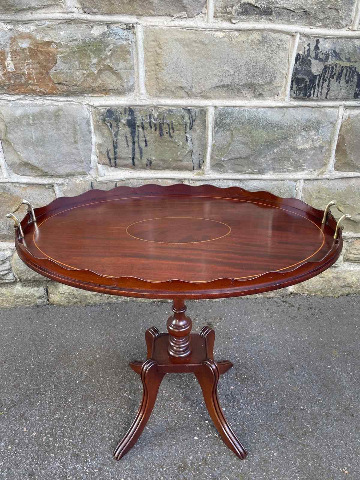 The oval tray top with wavey edge, brass opposing handles and inlaid decoration to the surface. Standing on a turned column with 4 reeded sweeping legs.