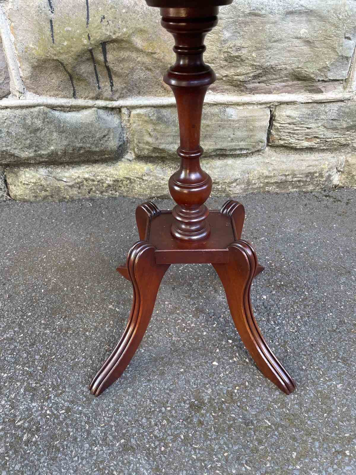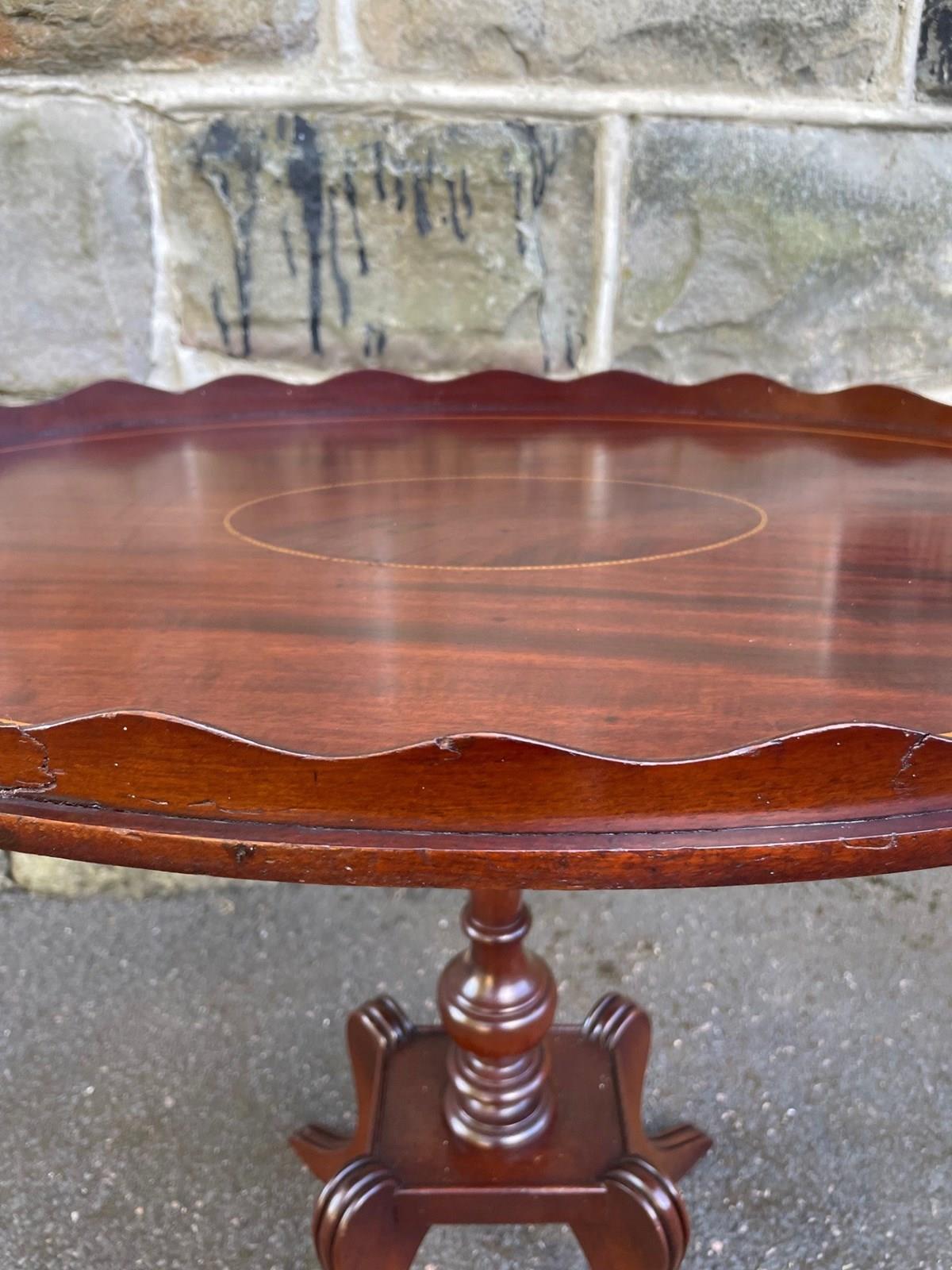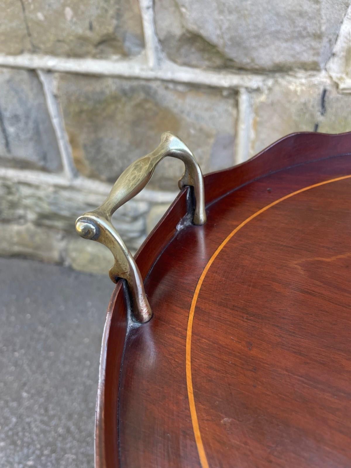 The oval tray top with wavey edge, brass opposing handles and inlaid decoration to the surface. Standing on a turned column with 4 reeded sweeping legs.
