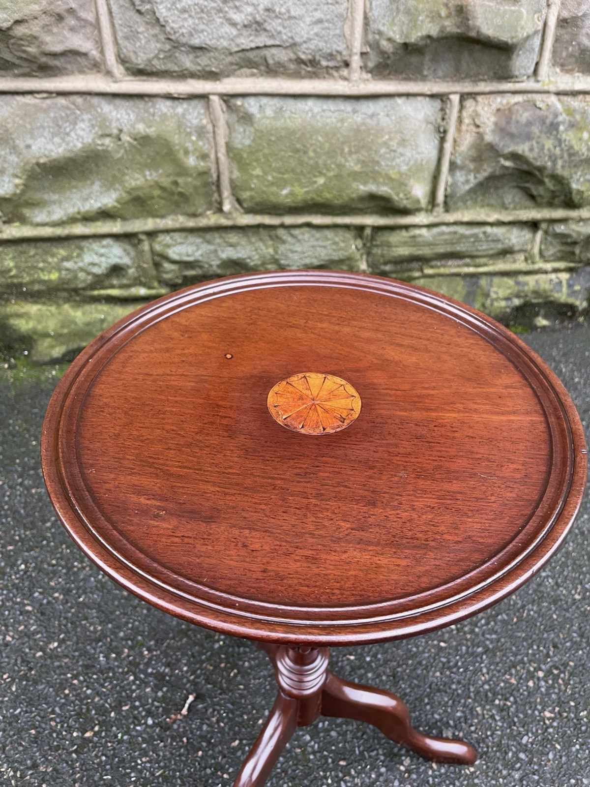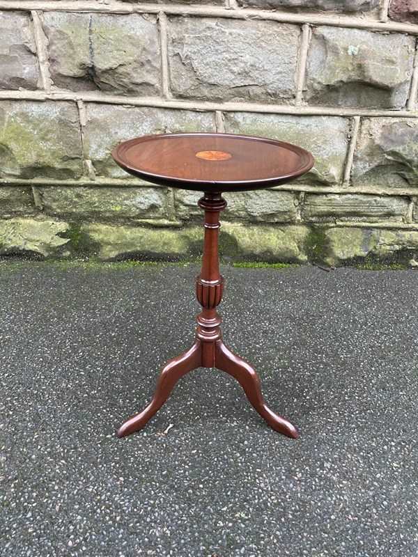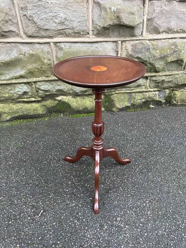 Round dished mahogany top with inlaid centre, upon a turned column with 3 shaped legs.