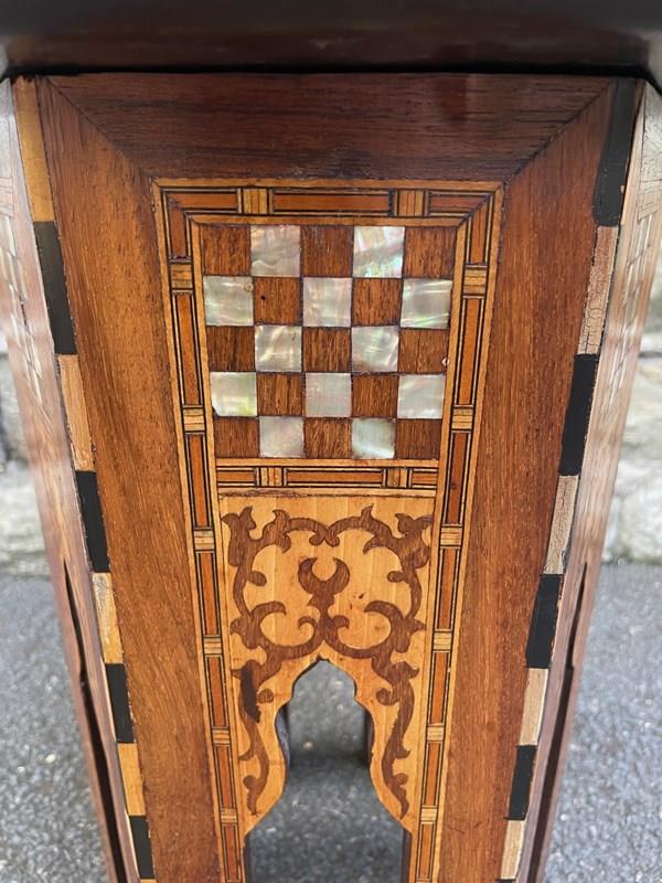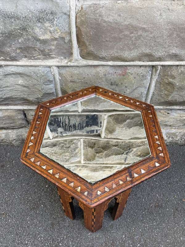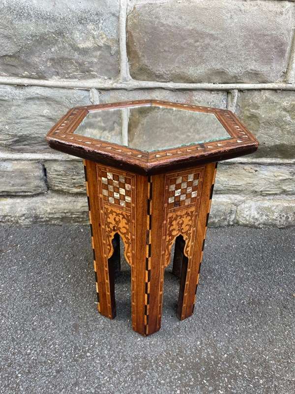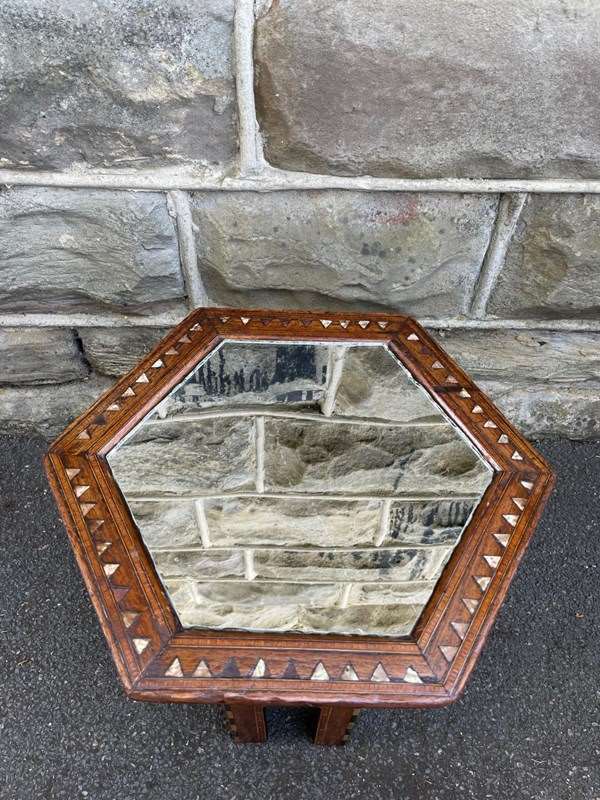 Inlaid Islamic/Moorish decoration with inlaid mother of pearl & satinwood decoration. It has a later inset mirrored centre to the top