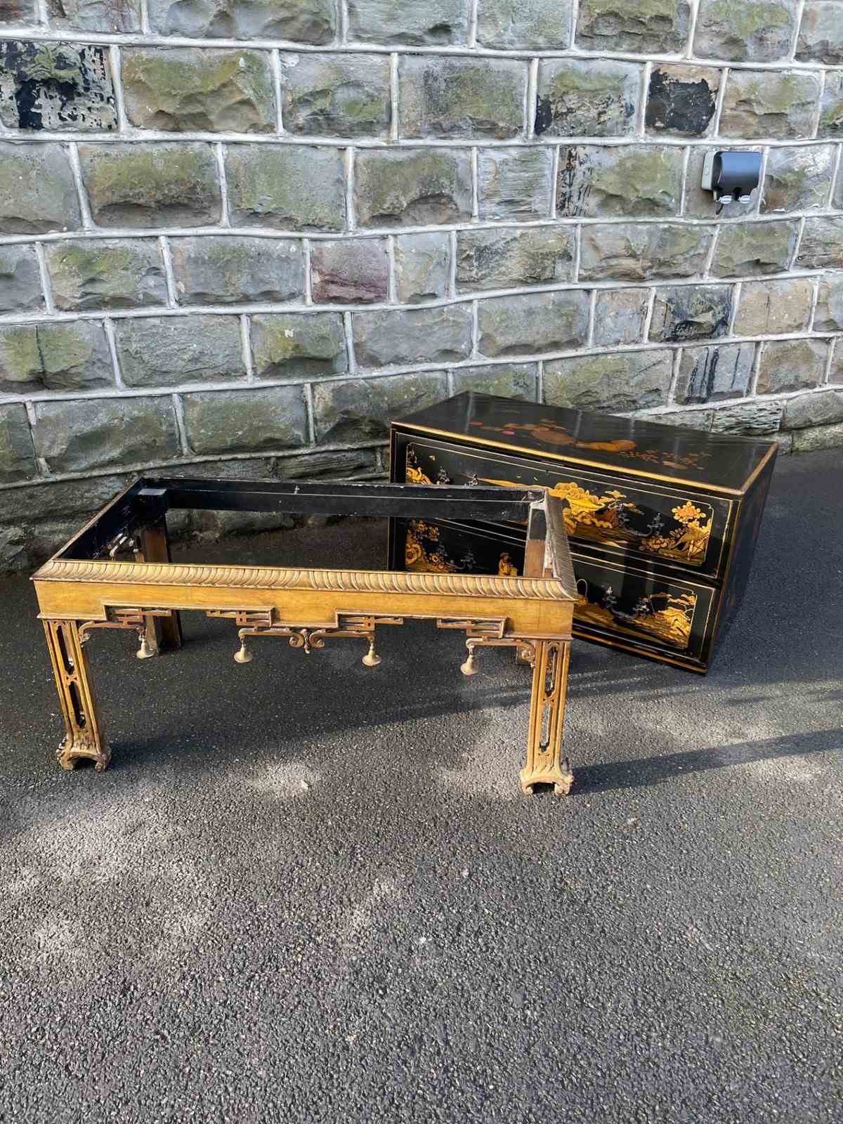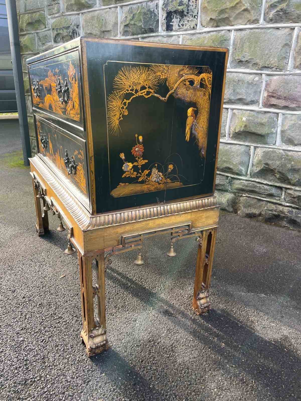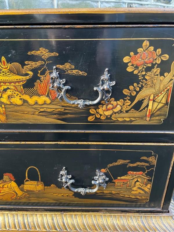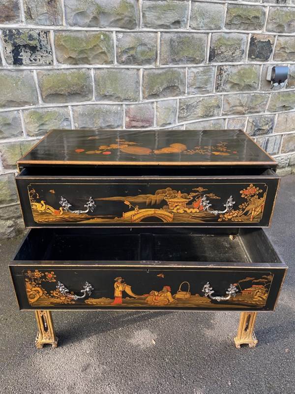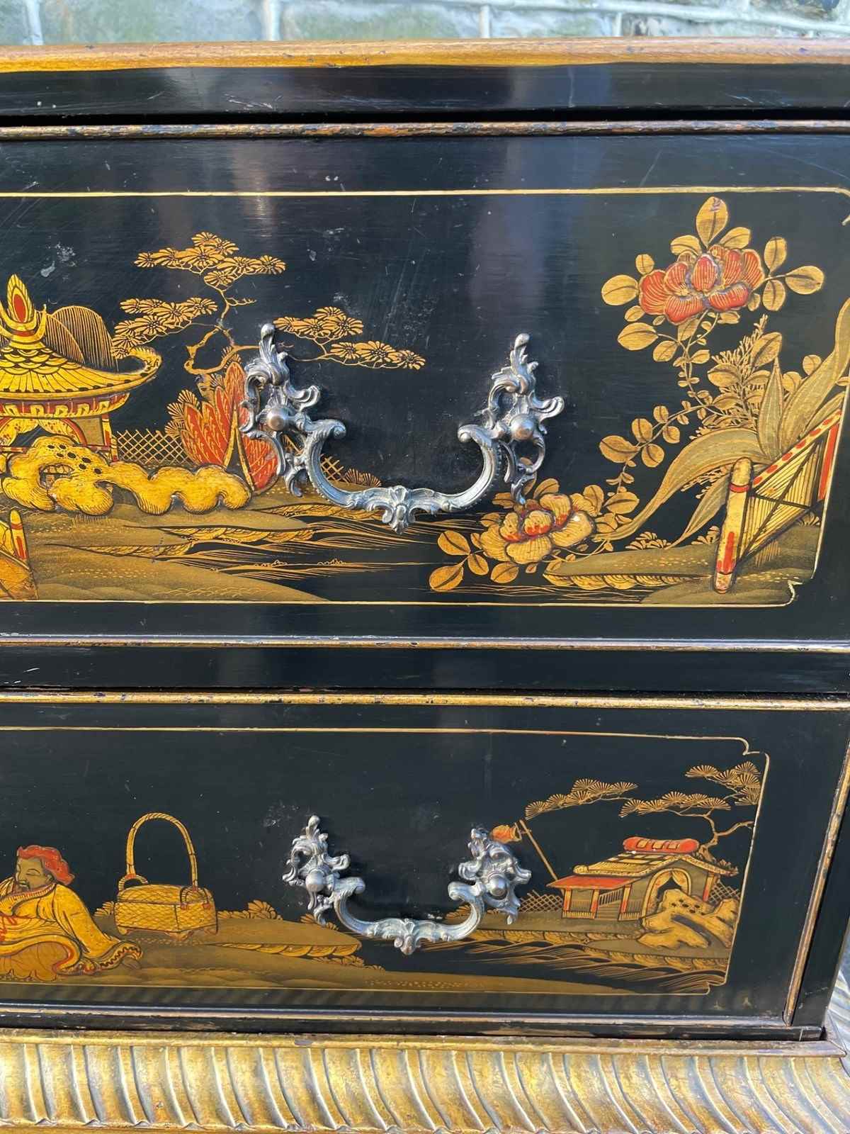 In the Chippendale style dating from 1900. Black lacquered 2 draw chest with gilt chinoiserie decoration, ornate brass handles, brass locks (no key), standing on its original gilt decoration standing.