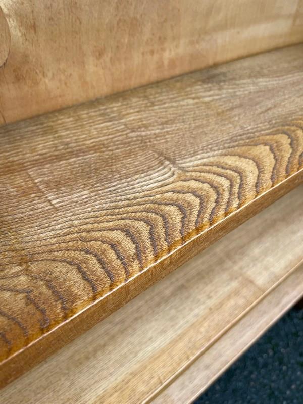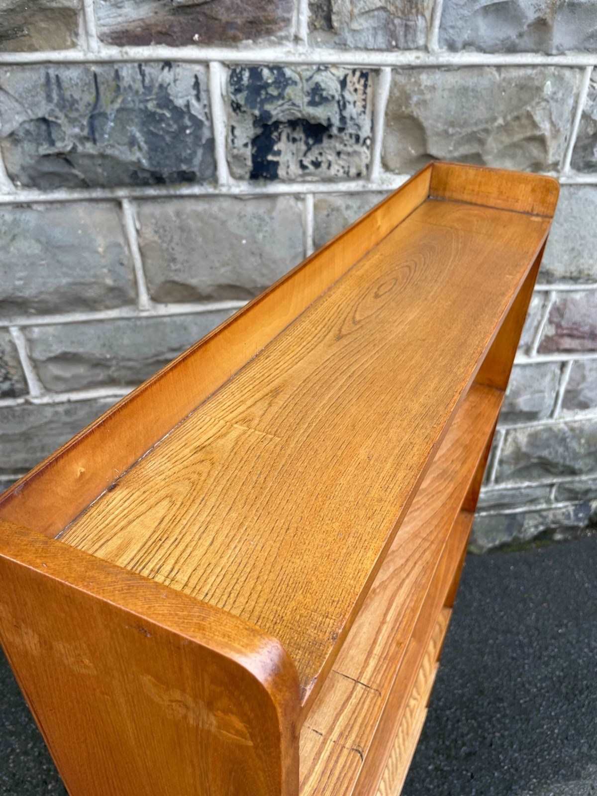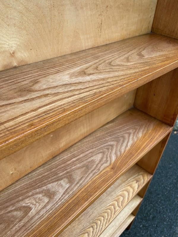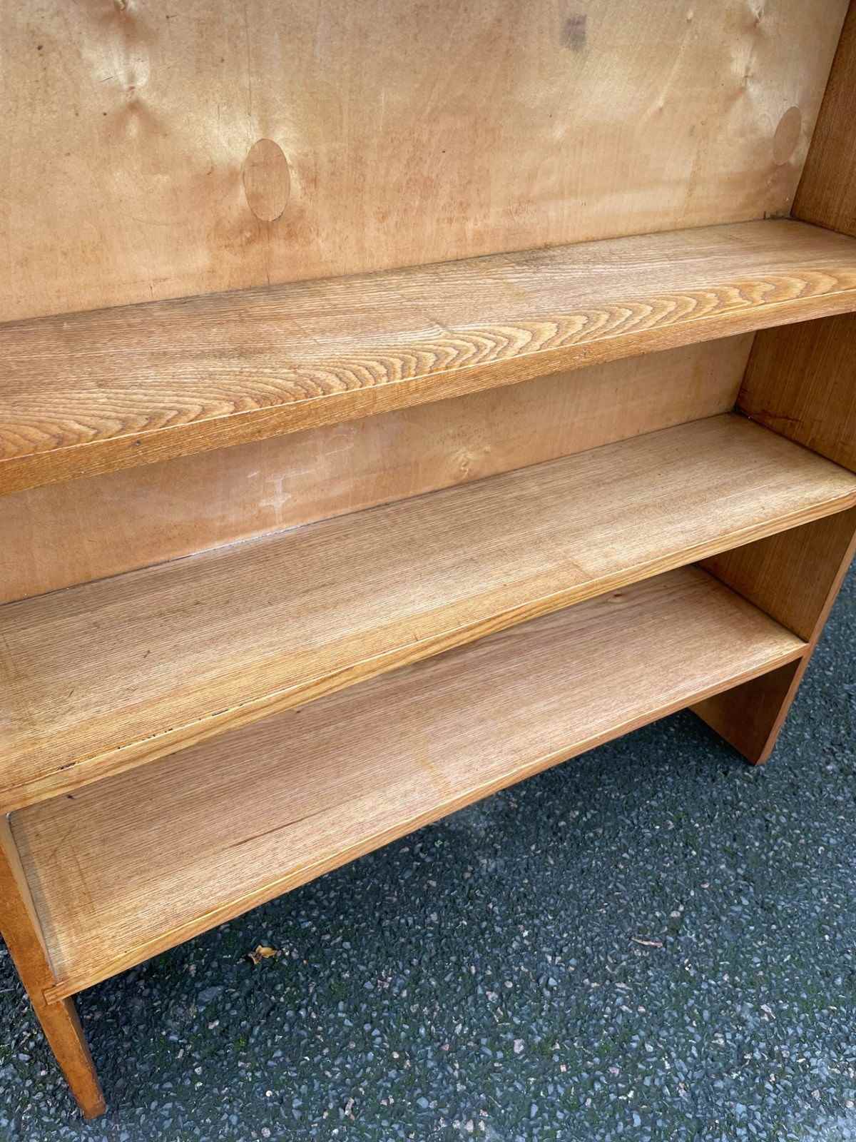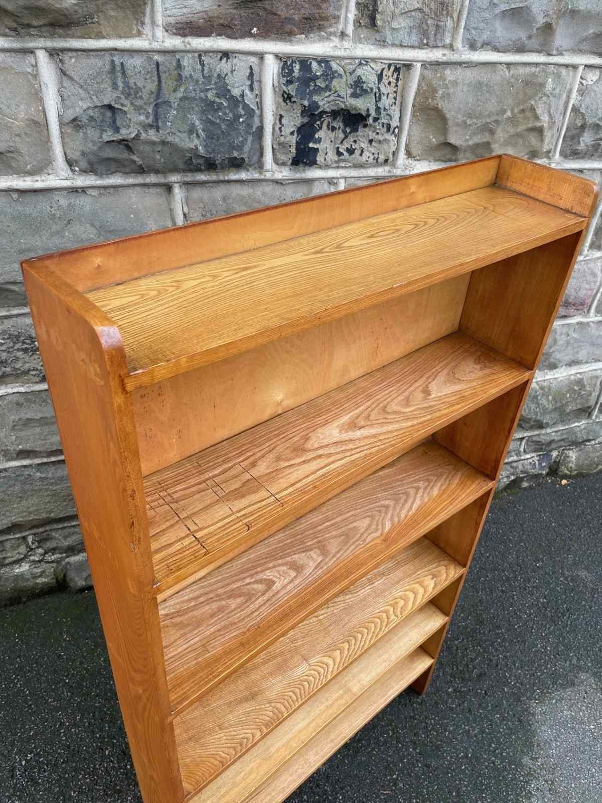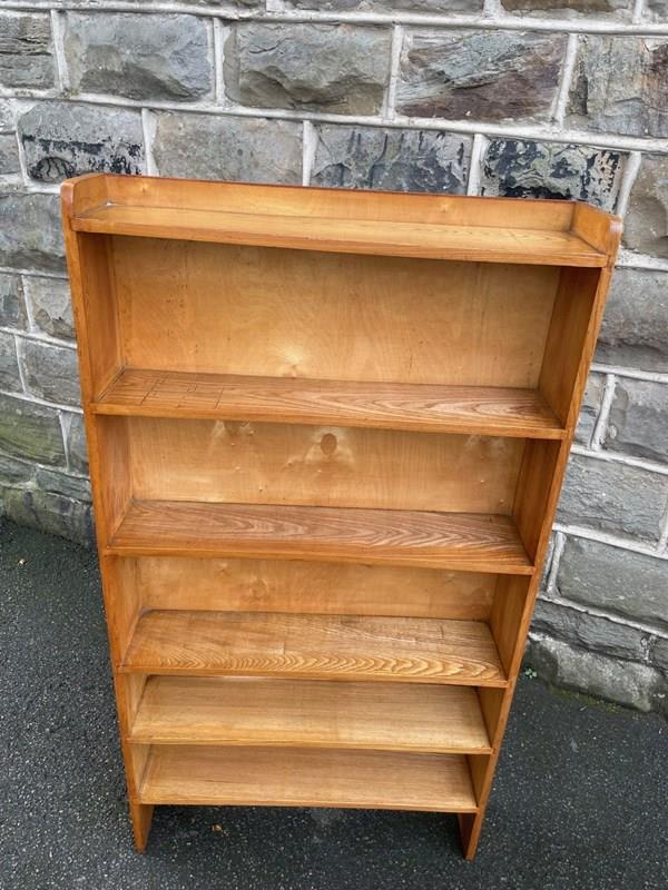 Solid oak, it has a small raised gallery back 6 fixed height solid oak shelves with polished oak sides