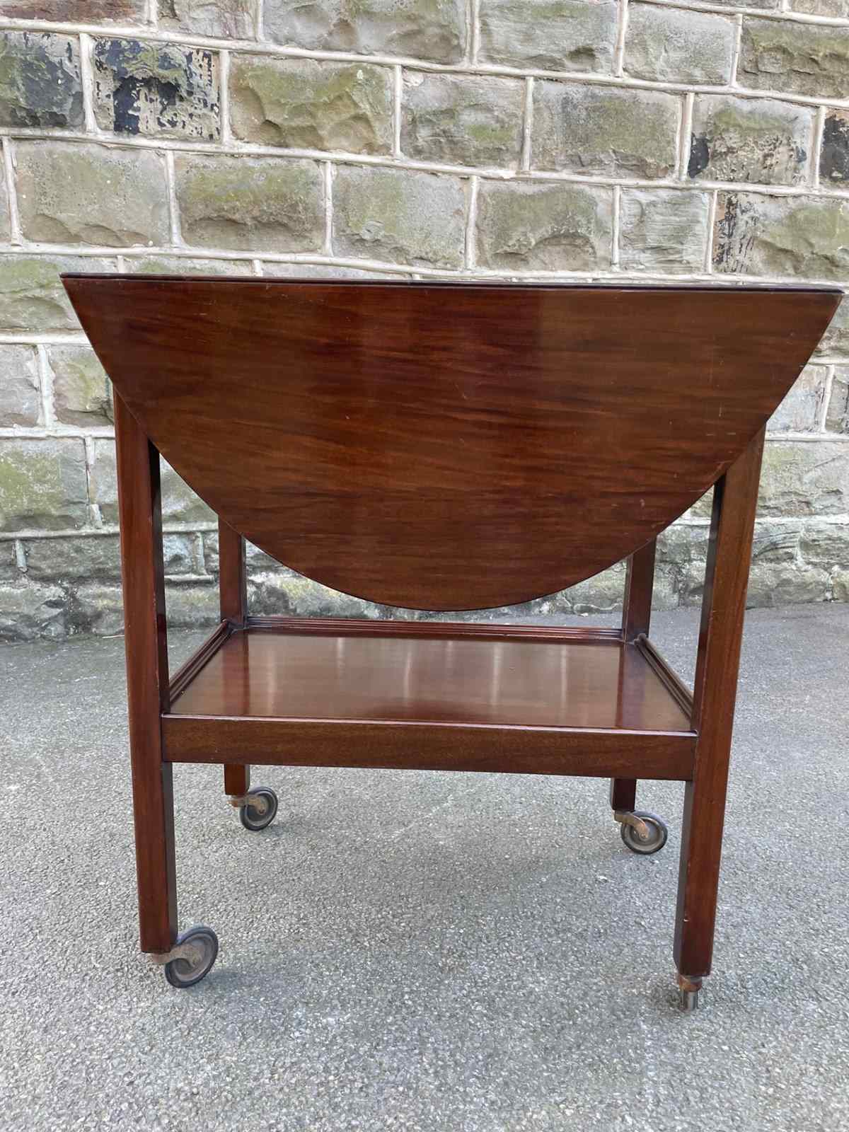 Offered for sale is this Edwardian antique trolley in mahogany having 2 tiers, oval drop flaps to both sides, square legs with the original brass castors.
