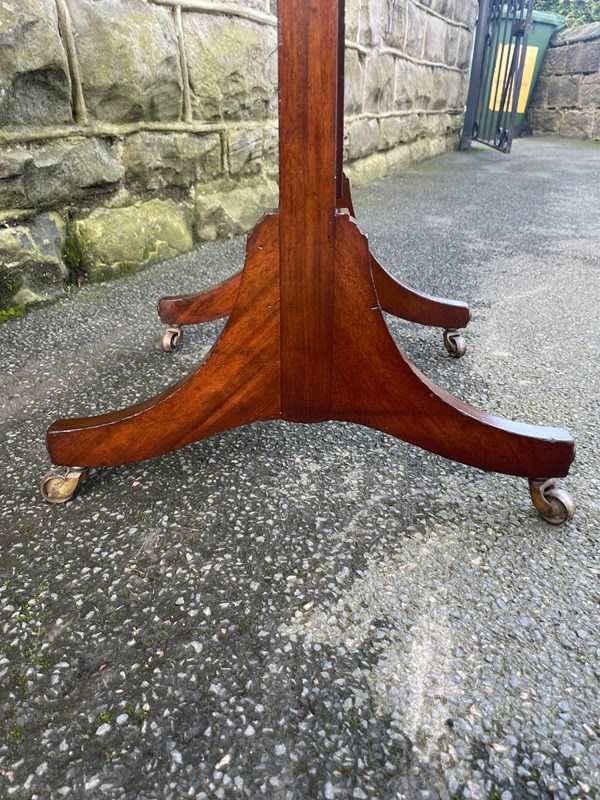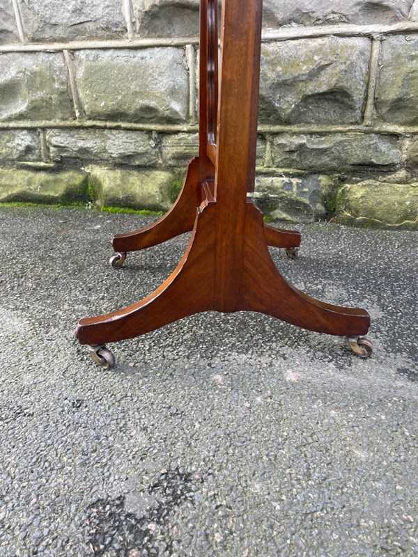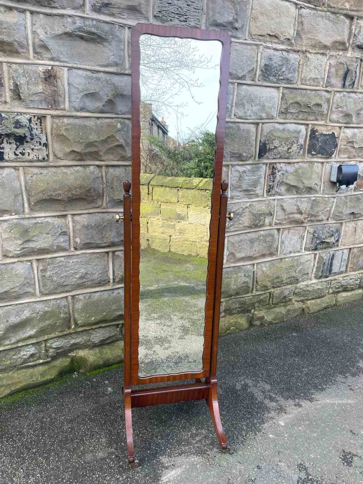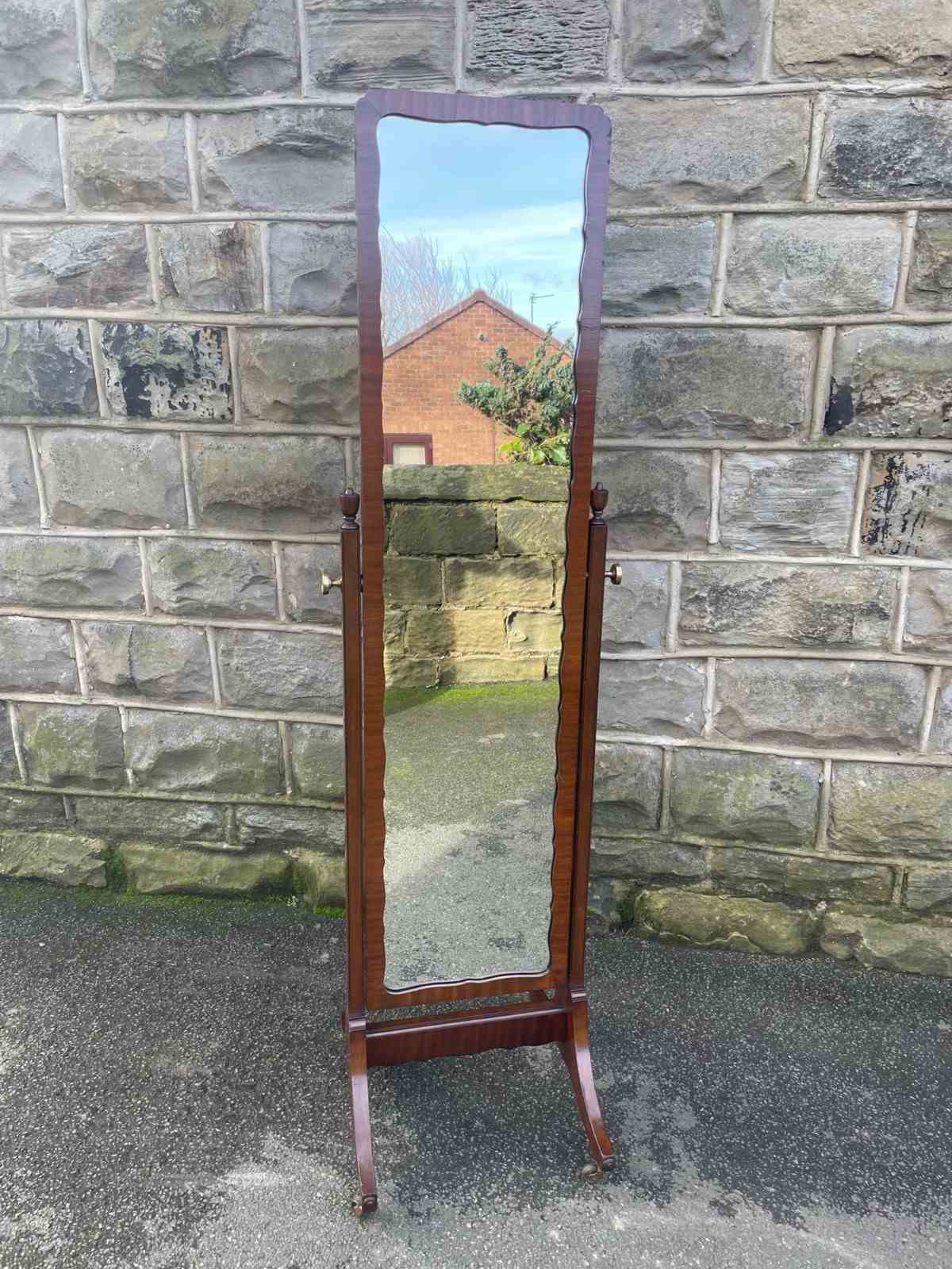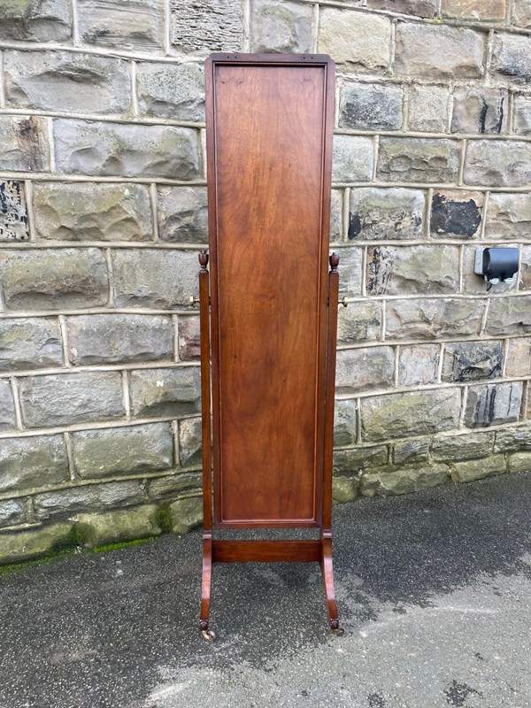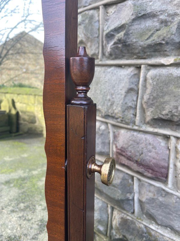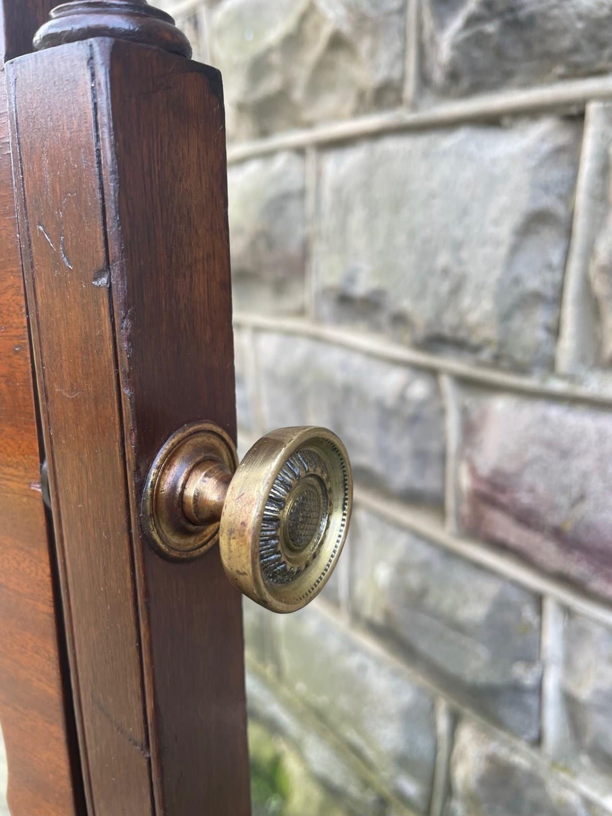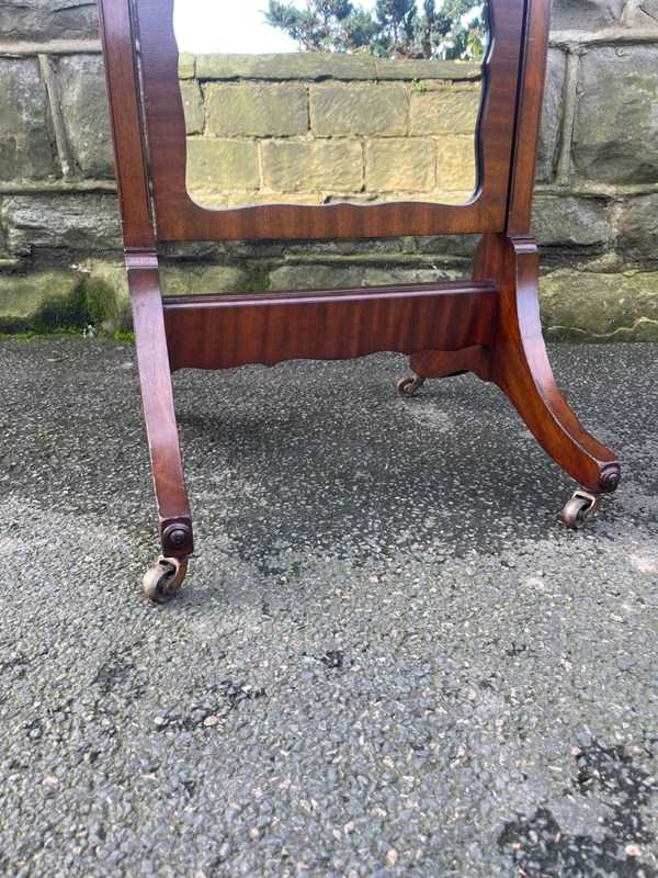 Offered for sale is this nice quality antique cheval dressing mirror. Mahogany frame, mahogany uprights with turned finials, brass screw in handles to support the mirror. Standing on shaped mahogany legs with a stretcher. Original castors. The angle of the mirror can be adjusted by pushing backwards or pulling forwards.