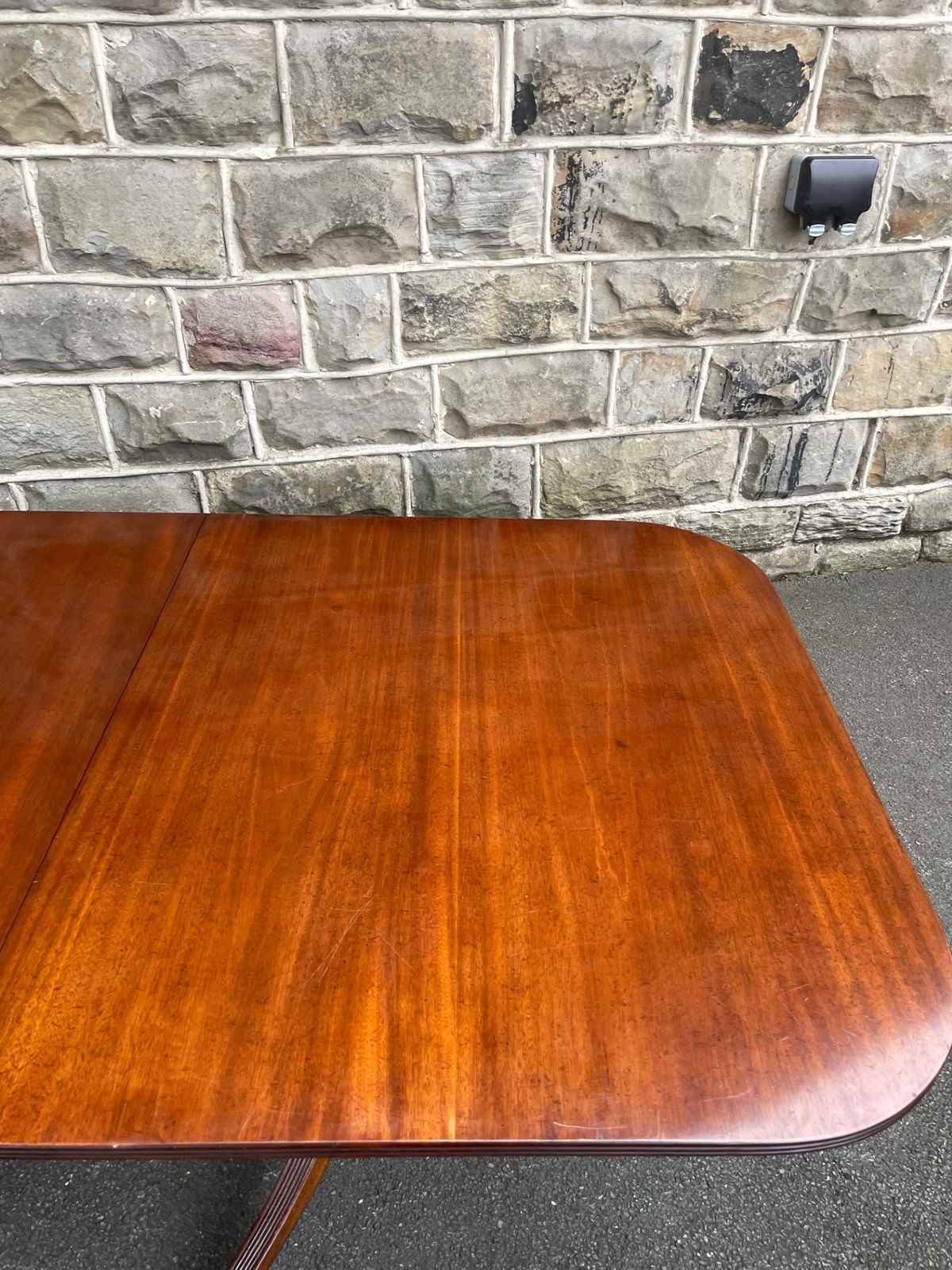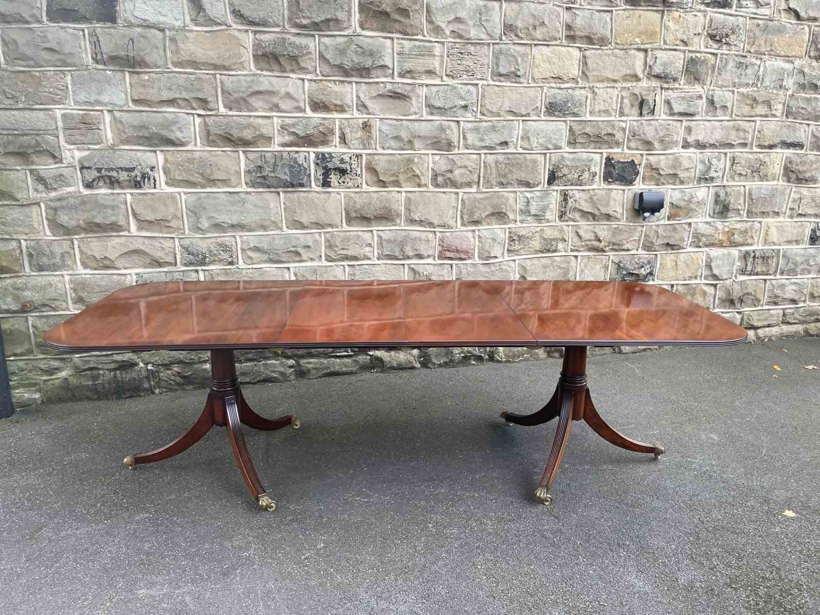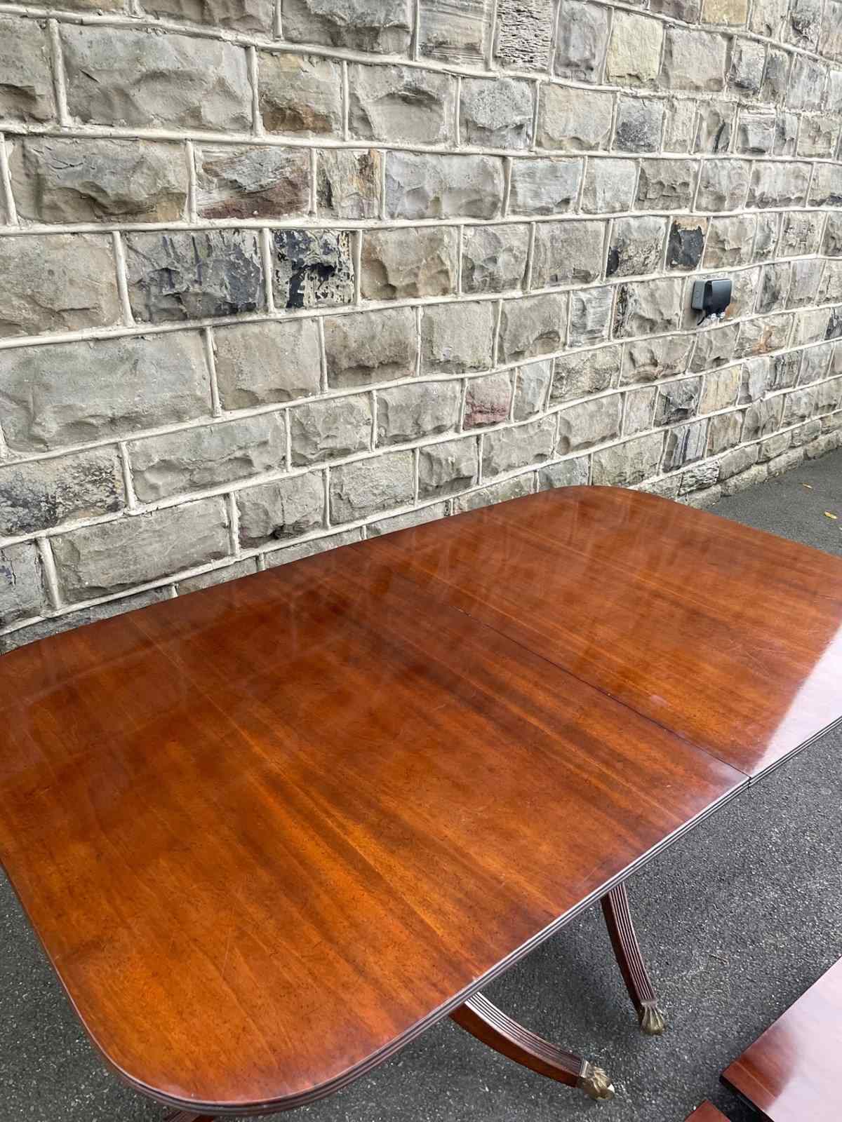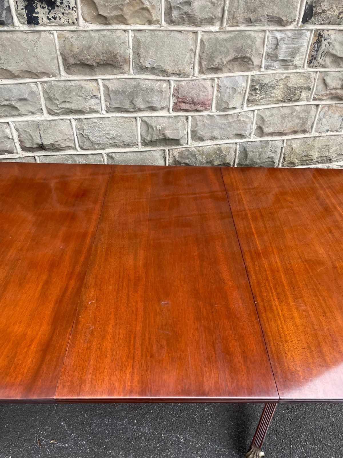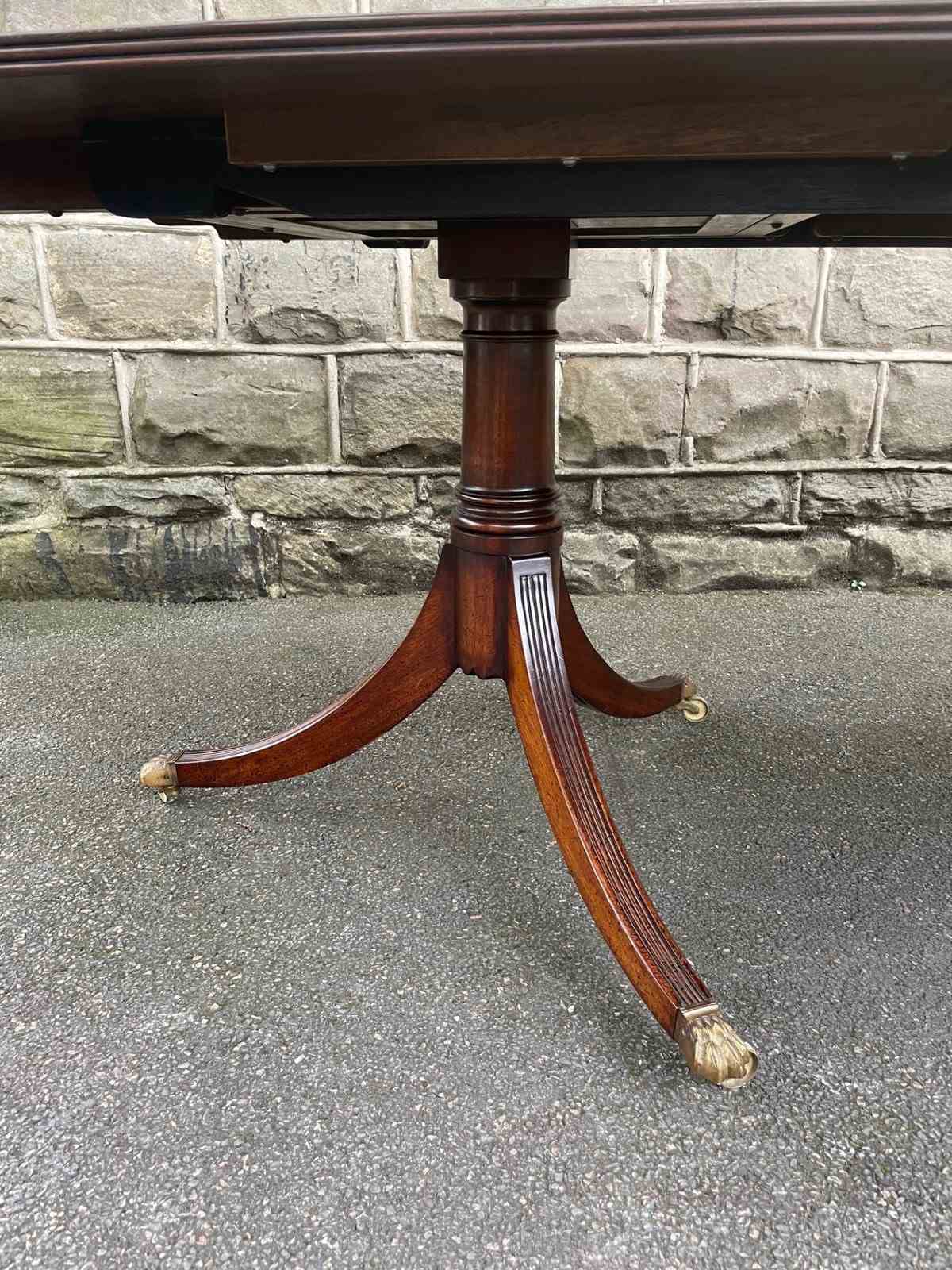 Solid mahogany top. Wonderful colour mahogany top with a reeded edge. Standing on twin pillar supports with turned central column, 3 splayed legs with brass paw castors. 2 additional leaves. The table can be used with either 1 or 2 leaves in, or as 2 "D" ends put together. Original brass clips to fasten the table together under the top. It has extending rails under the top to support the weight of the leaves