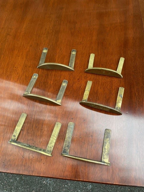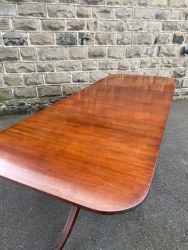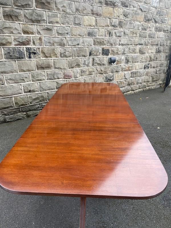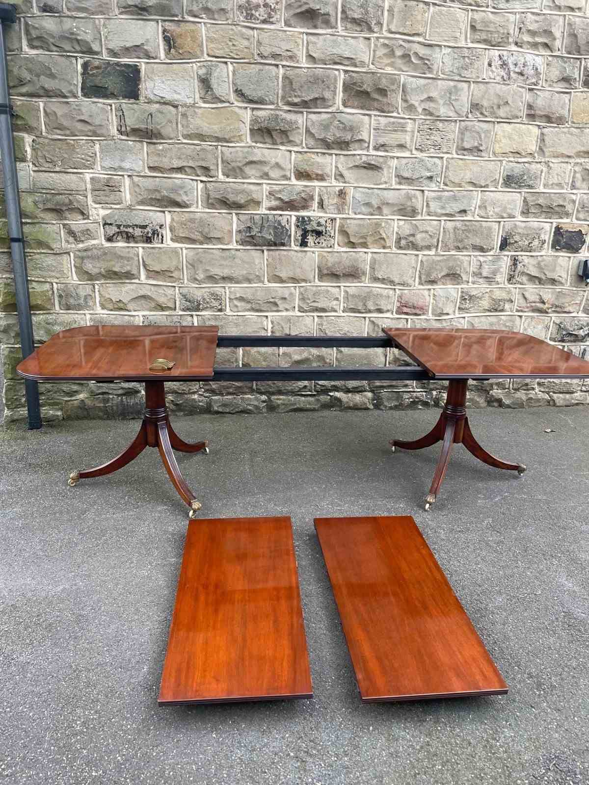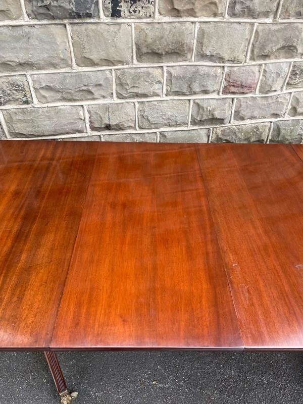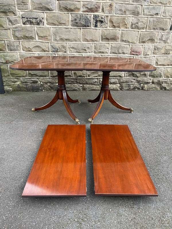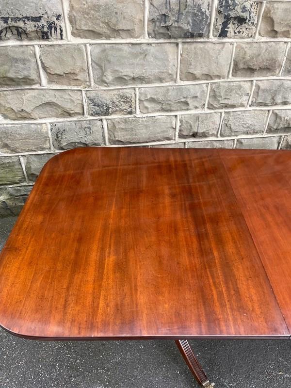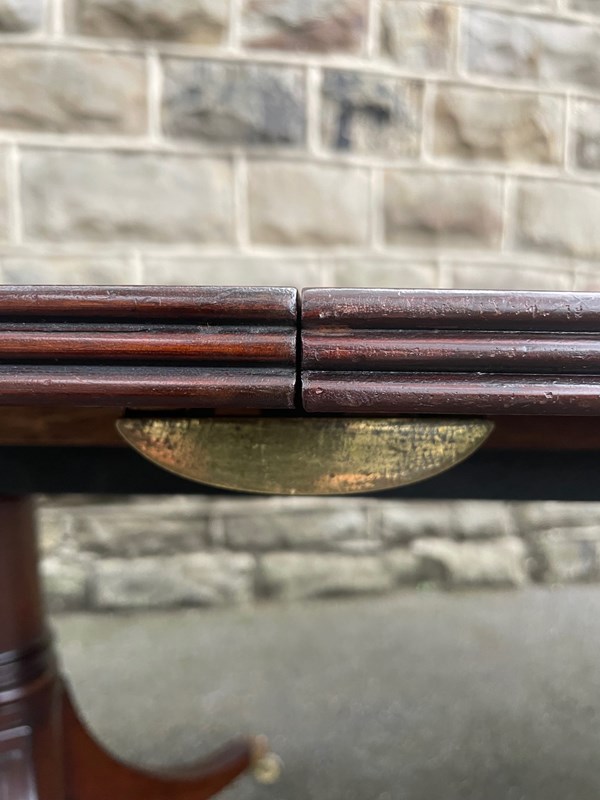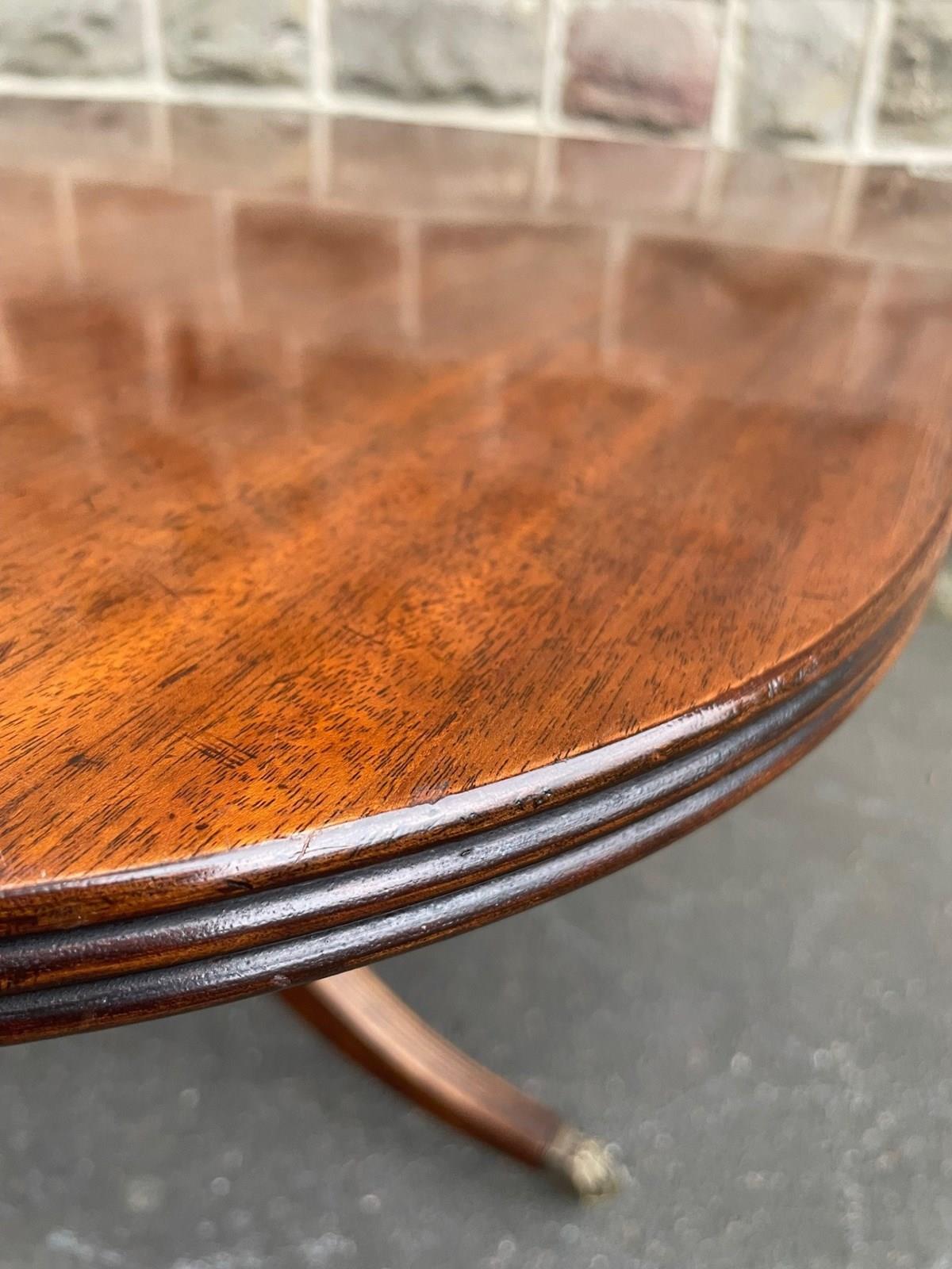 Solid mahogany top. Wonderful colour mahogany top with a reeded edge. Standing on twin pillar supports with turned central column, 3 splayed legs with brass paw castors. 2 additional leaves. The table can be used with either 1 or 2 leaves in, or as 2 "D" ends put together. Original brass clips to fasten the table together under the top. It has extending rails under the top to support the weight of the leaves