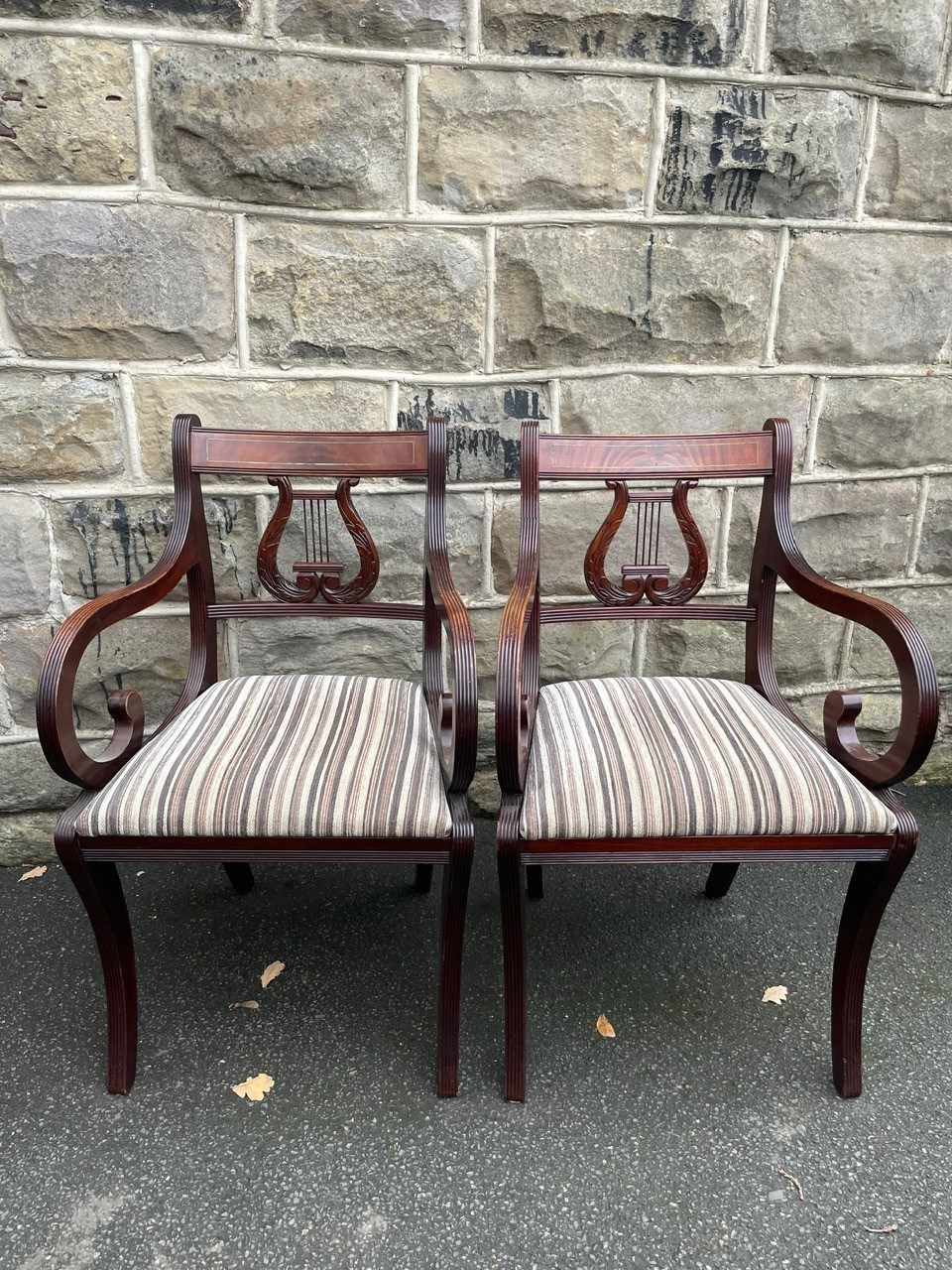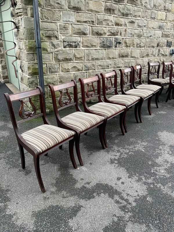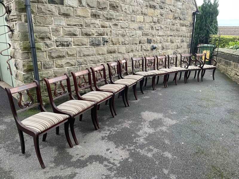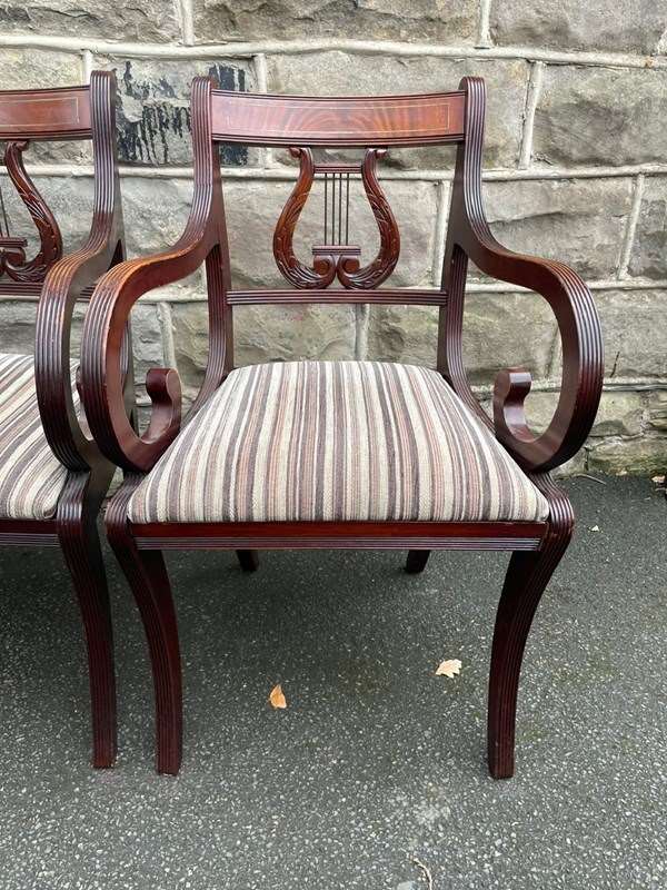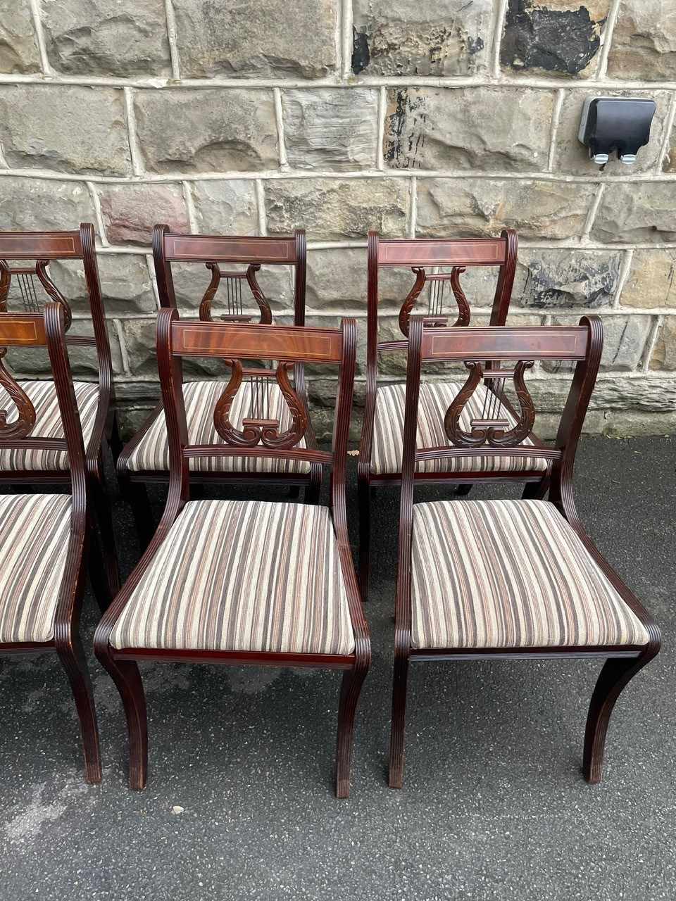 Set 12 chairs in mahogany, 10 single chairs and 2 carver chairs. Lyre shaped splat backs with brass inlay, drop in upholstered seats, standing on reeded sabre legs