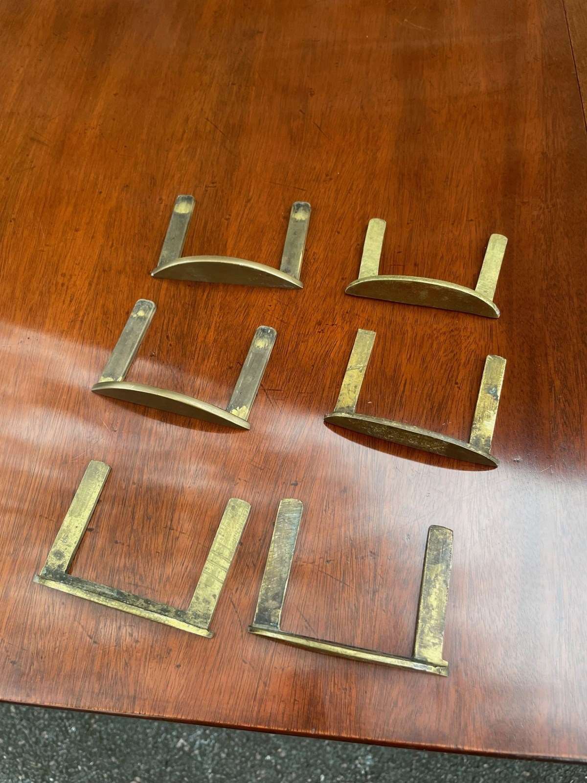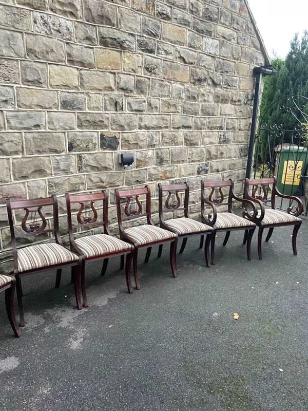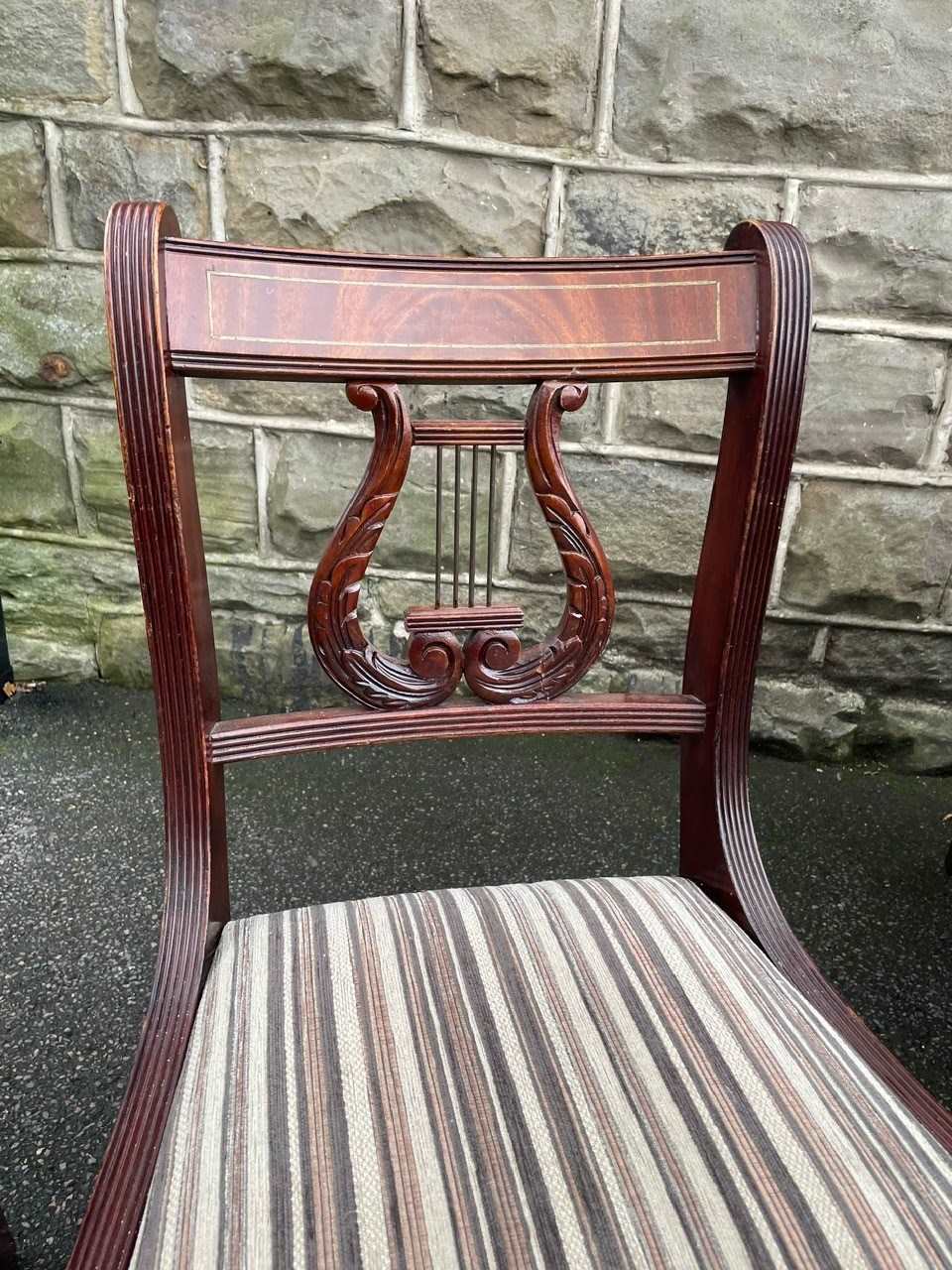 Set 12 chairs in mahogany, 10 single chairs and 2 carver chairs. Lyre shaped splat backs with brass inlay, drop in upholstered seats, standing on reeded sabre legs