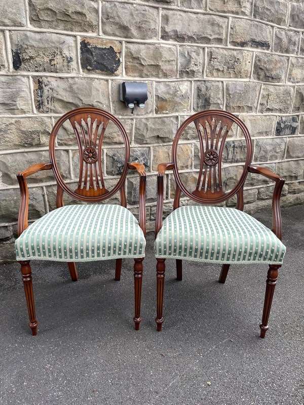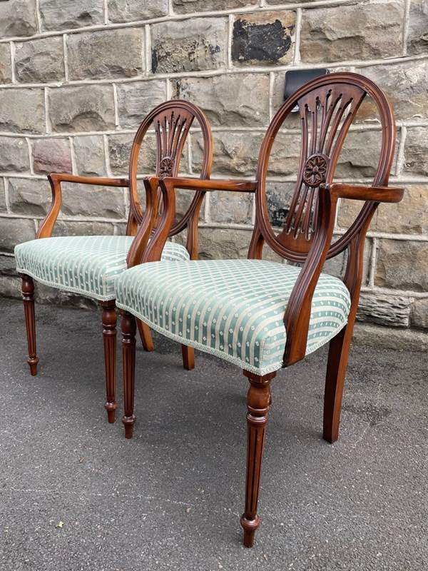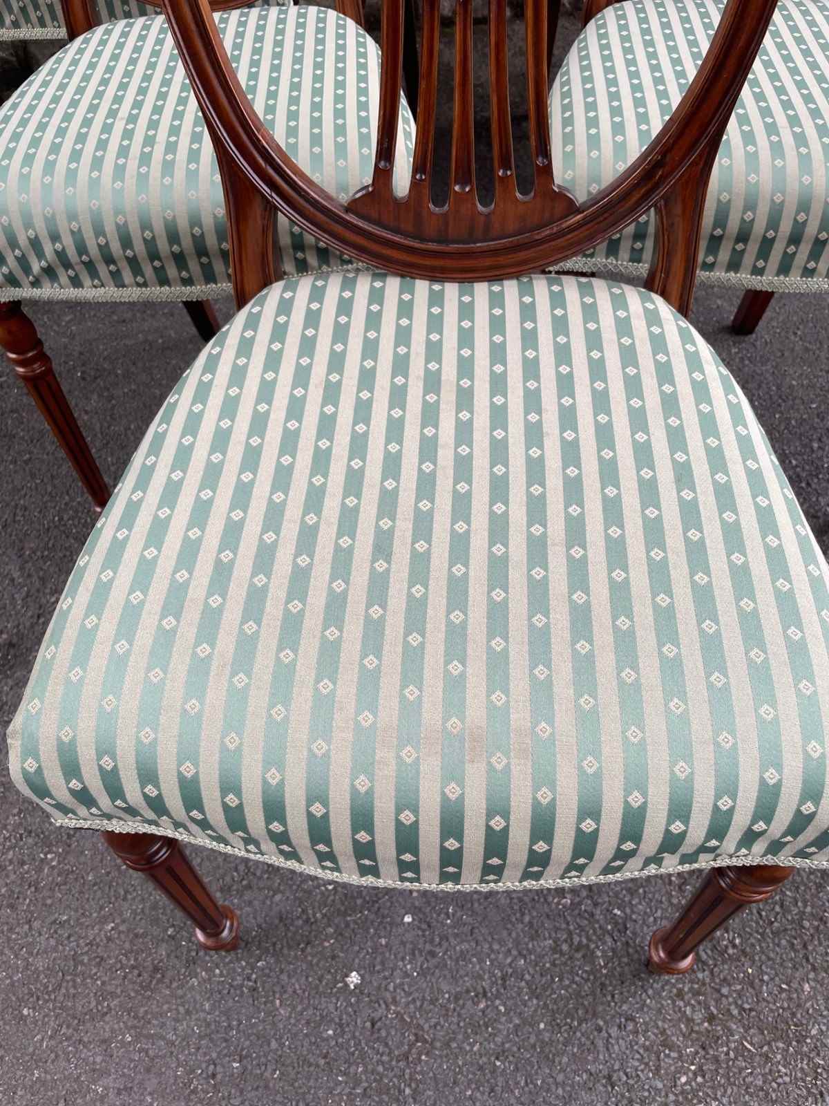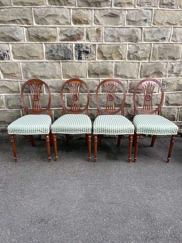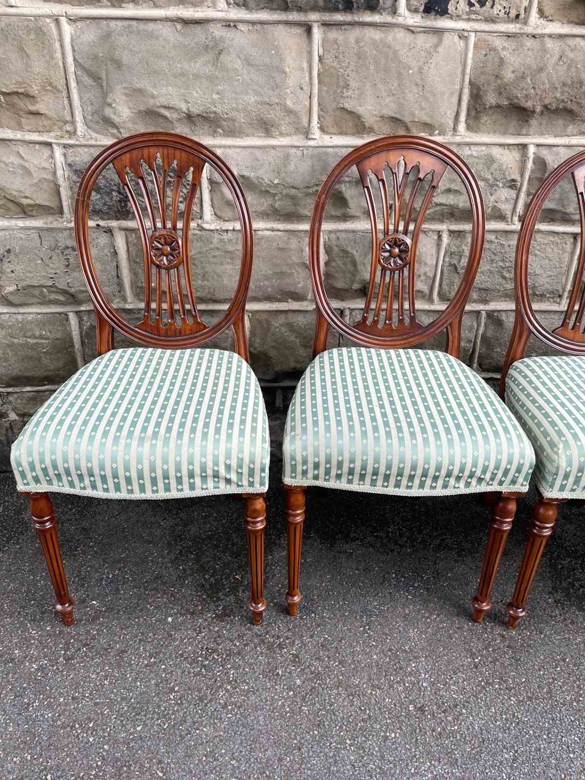 The chairs in the Hepplewhite style, oval mahogany back with pierced splats, standing on turned & reeded mahogany legs. 4 single chairs and a pair of carver chairs