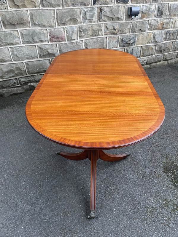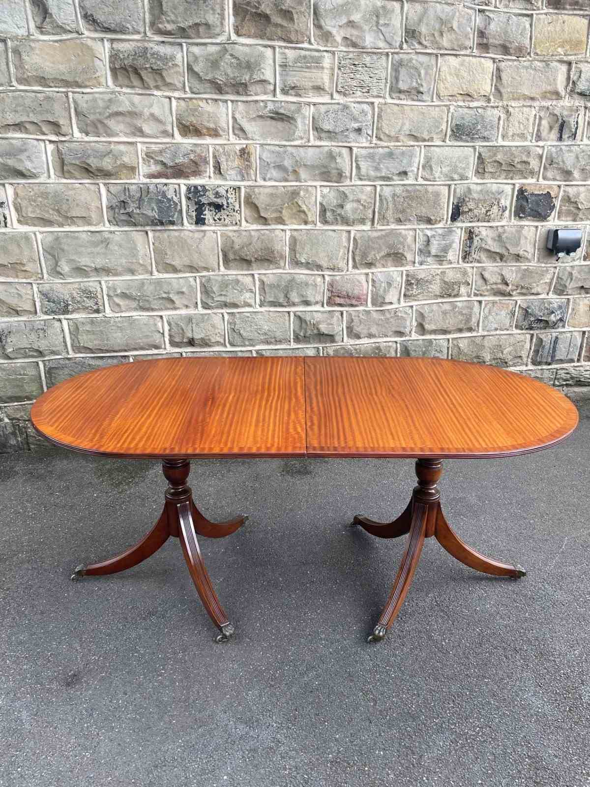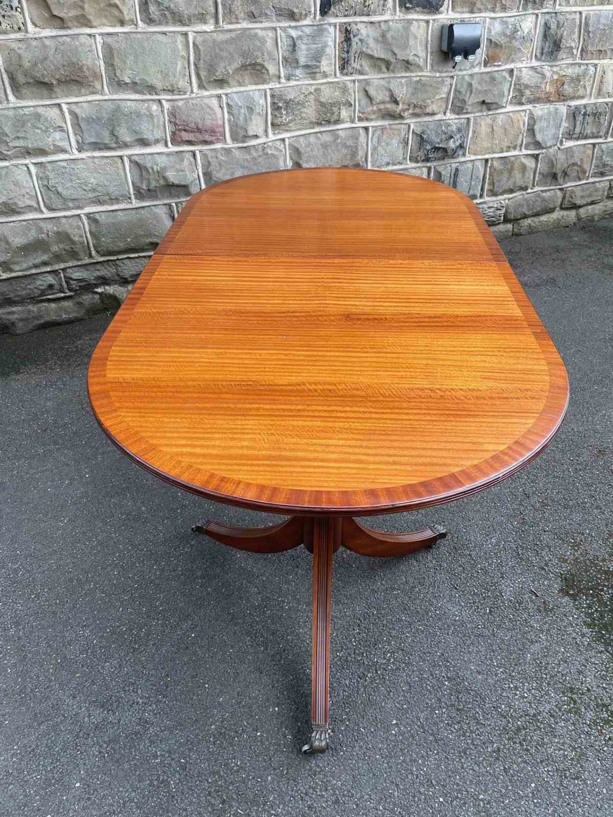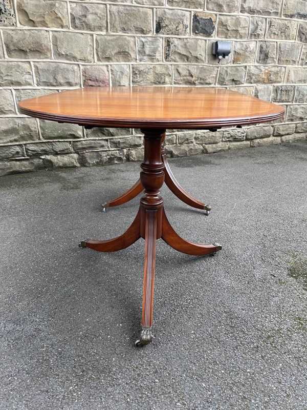 The table in solid mahogany. Wonderful colour mahogany top with a cross banded border. Standing on twin pillar supports with turned central column, 3 splayed legs with brass paw castors.