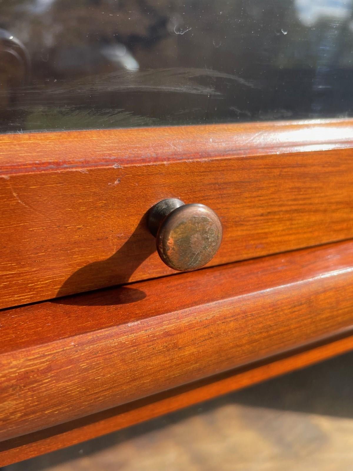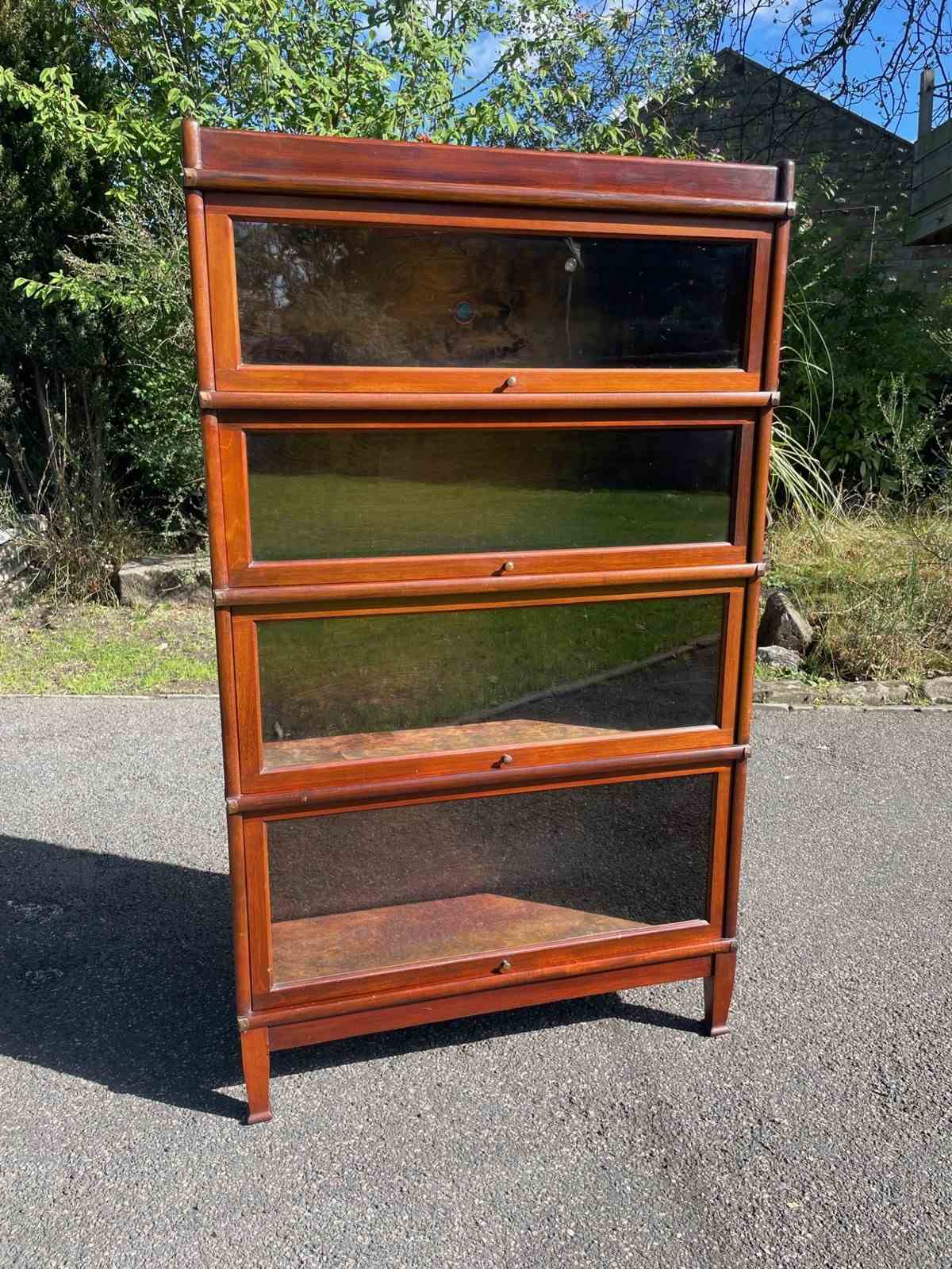 In mahogany having graduated sections to take a good height books. Breaks down into 6 sections so is easy to move (top, base & 4 glazed sections). It has glazed up and over slide doors all with small brass knob handles. Plinth base having square tapering legs.