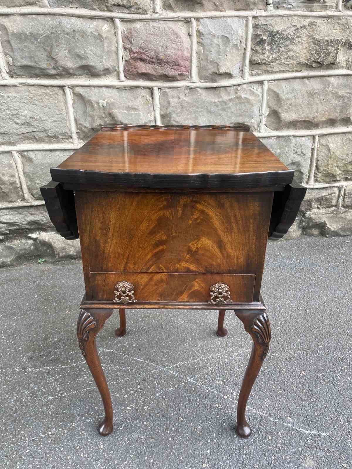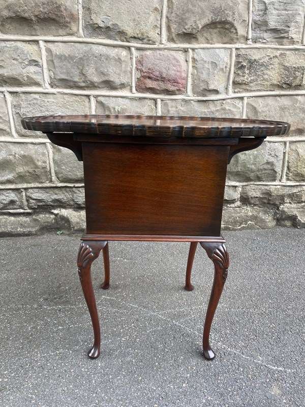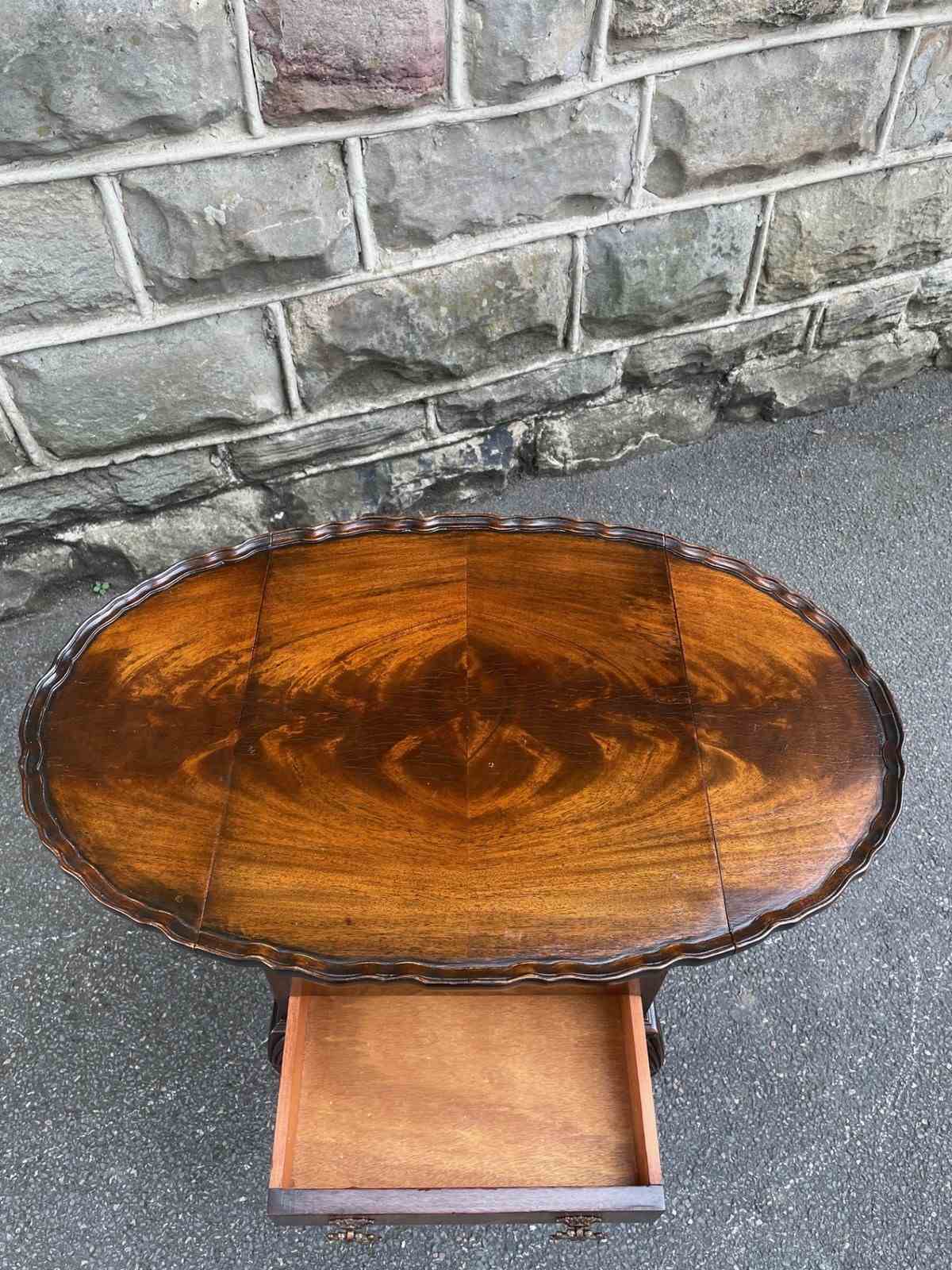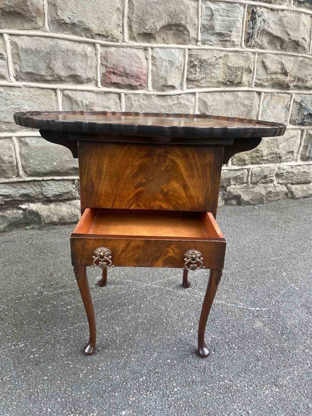 In mahogany, the top having drop flaps, oval when up with a wavey pie crust edge. The top lifts up and inside is lined with the original cream silk interior. It has a pull-out draw with brass drop handles, standing on slender cabriole legs.