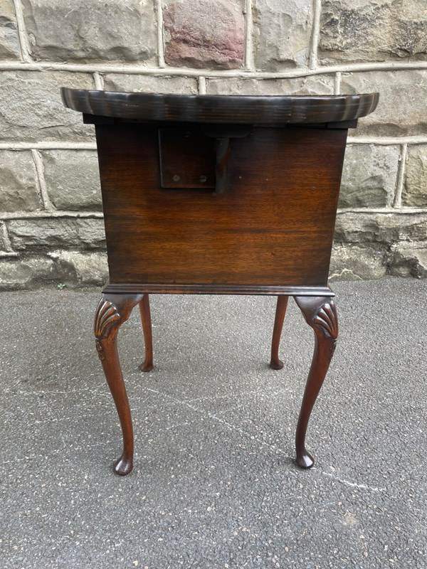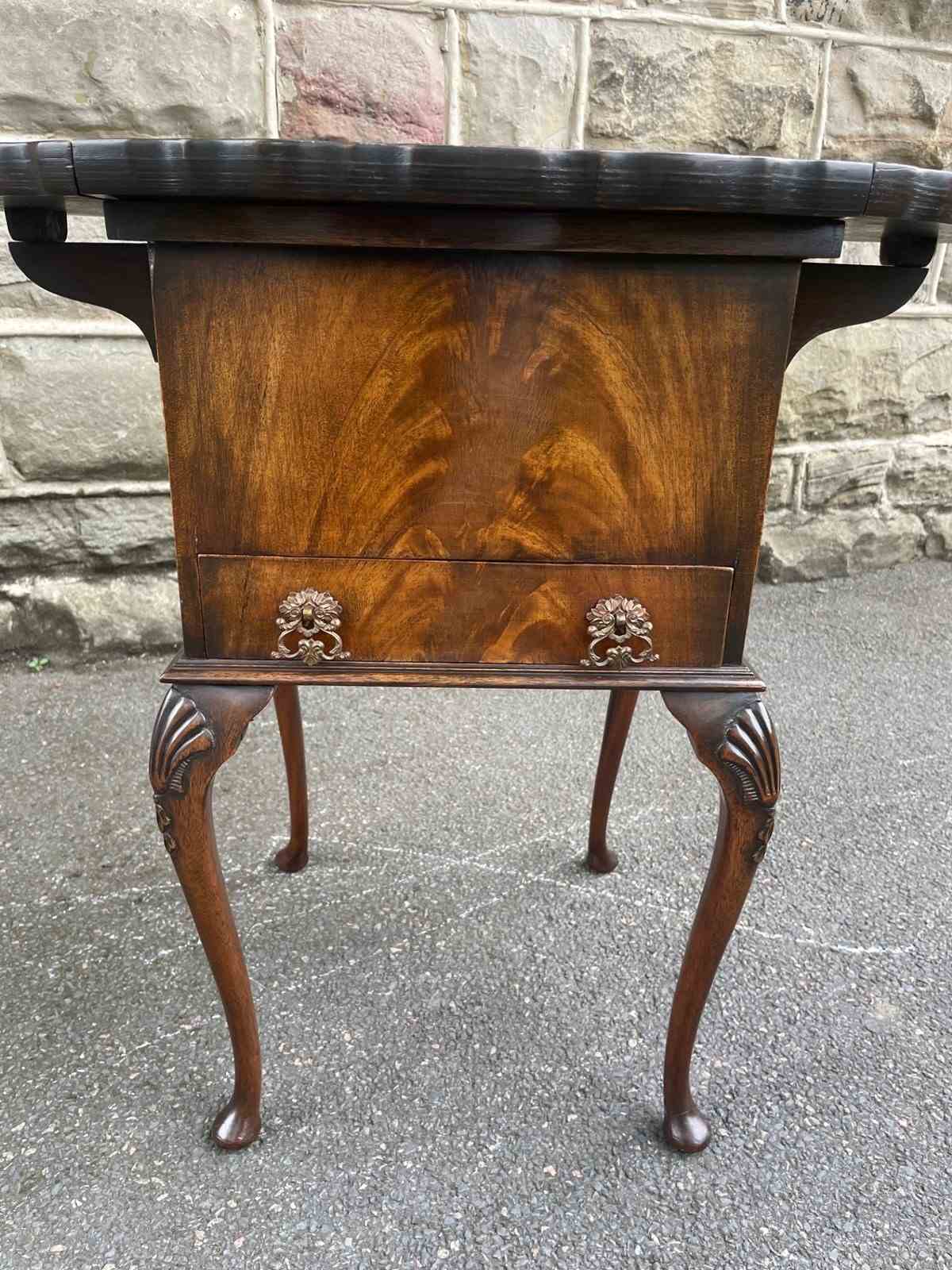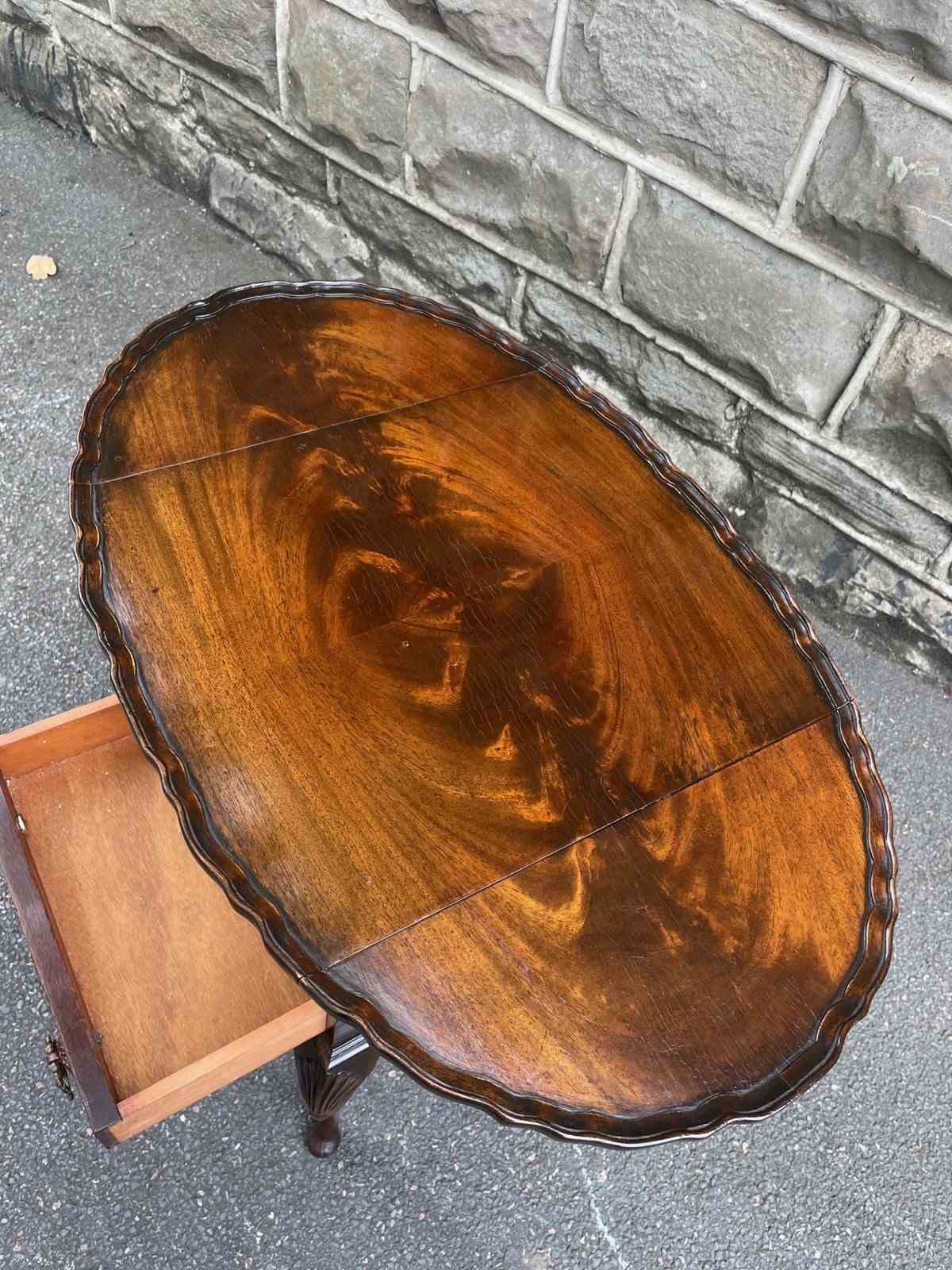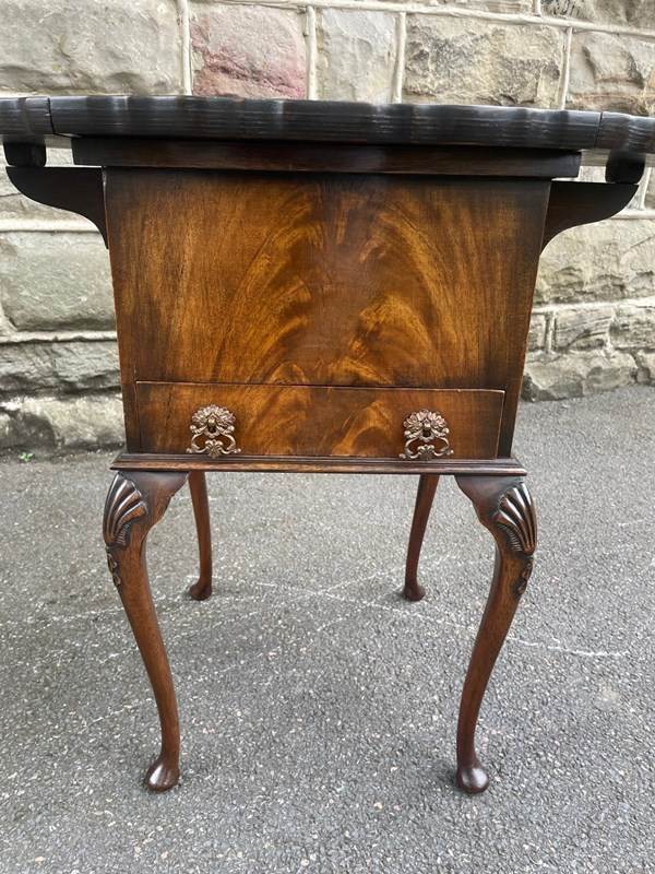 In mahogany, the top having drop flaps, oval when up with a wavey pie crust edge. The top lifts up and inside is lined with the original cream silk interior. It has a pull-out draw with brass drop handles, standing on slender cabriole legs.