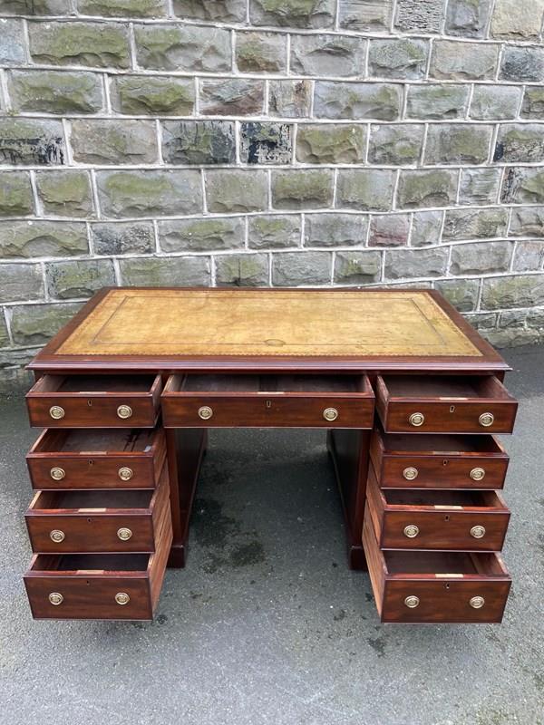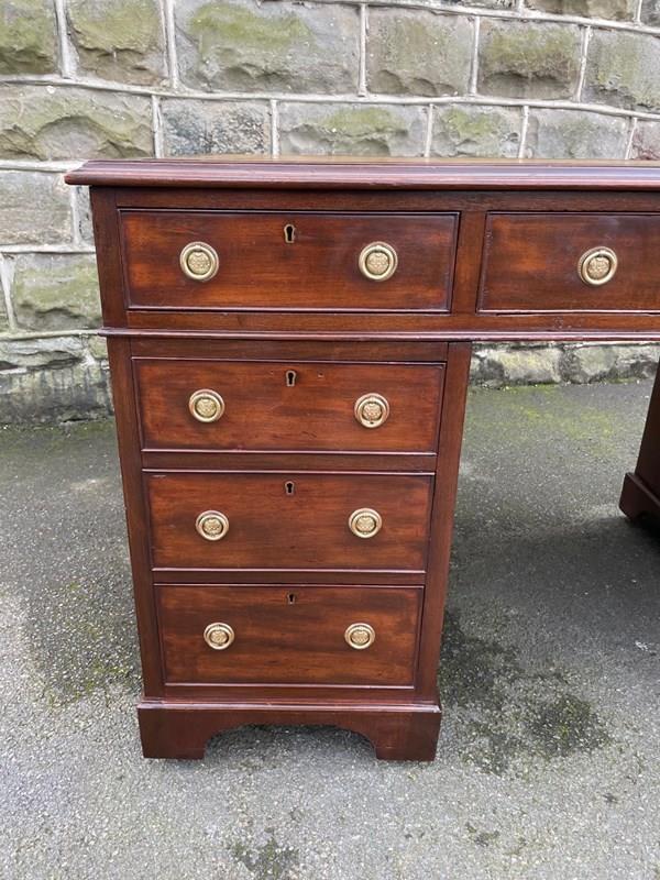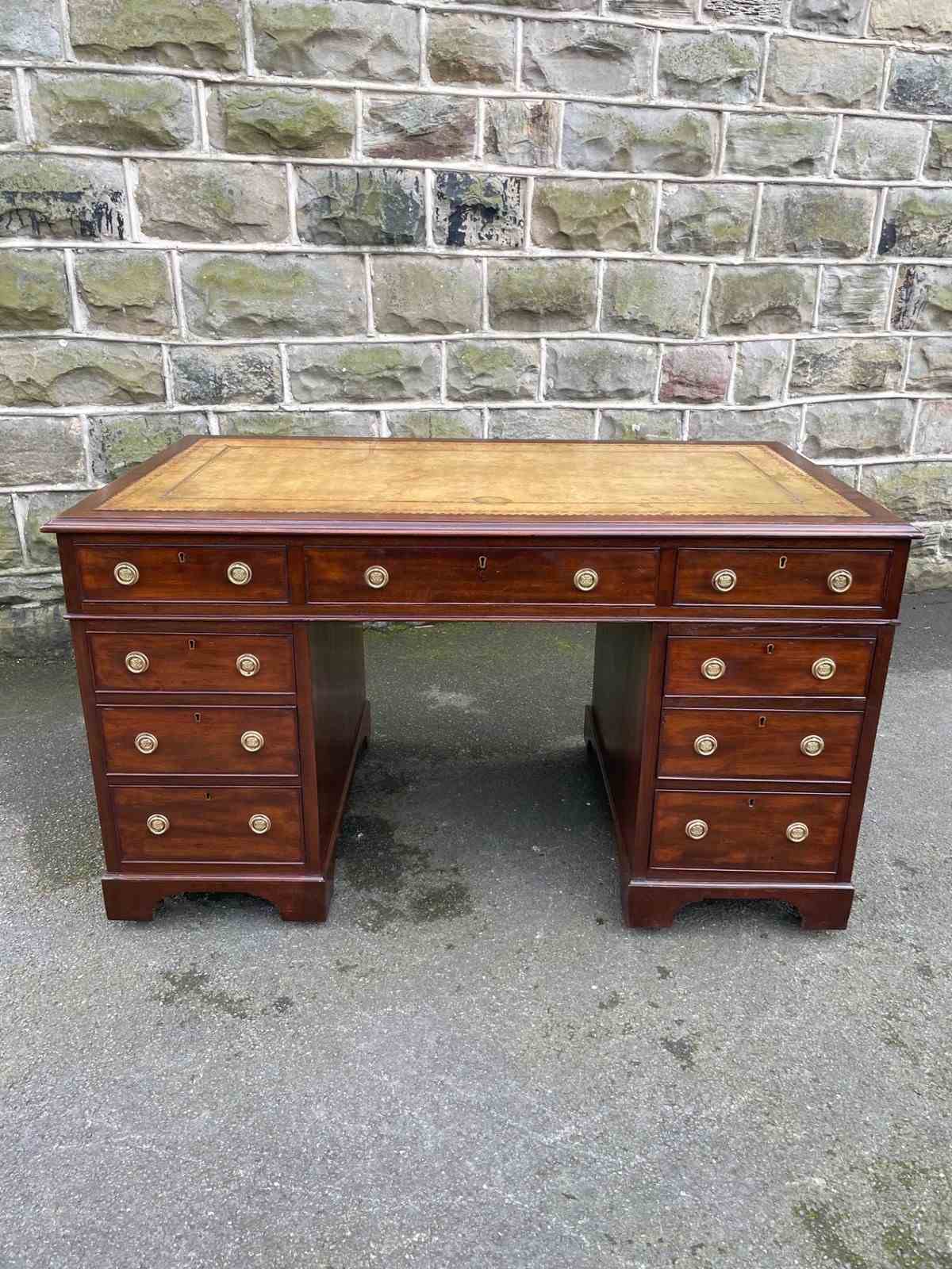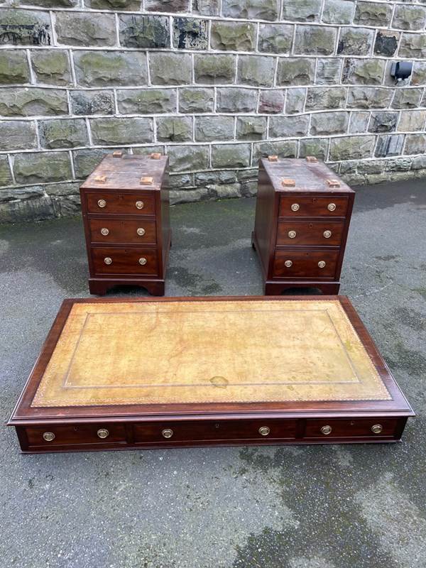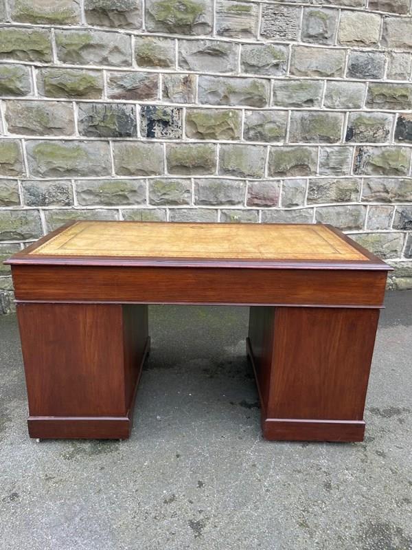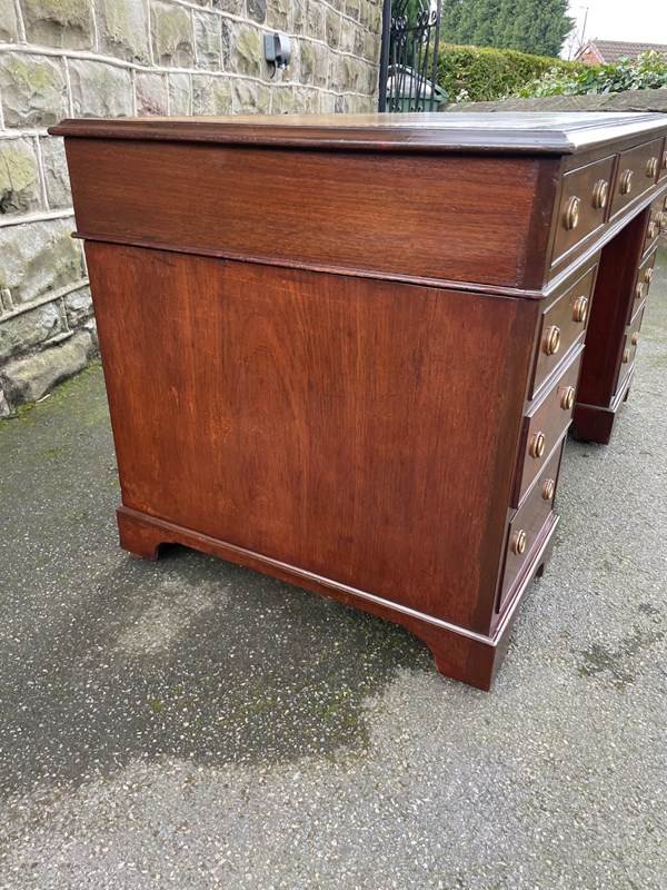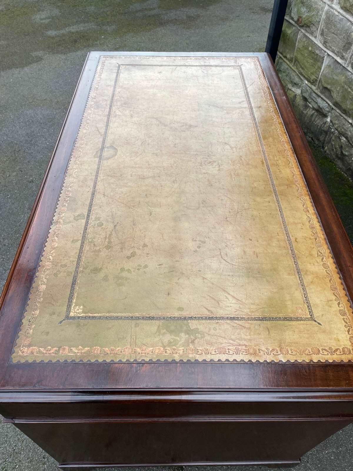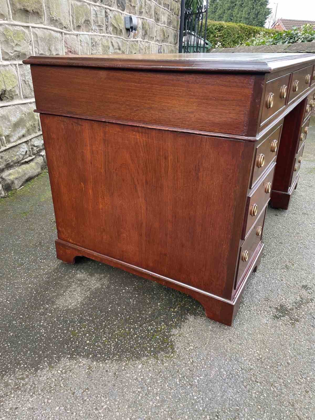 Nice quality having a tooled leather top, 3 draws across the top and 3 graduated draws to each pedestal. All the draws have brass ring handles, working brass locks and comes with the original key. Polished mahogany sides & back standing on a plinth base with castors underneath so easy to move around. The desk splits into 3 parts