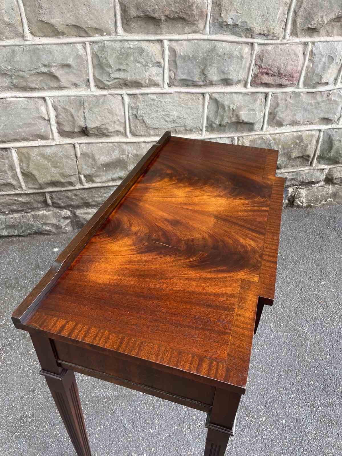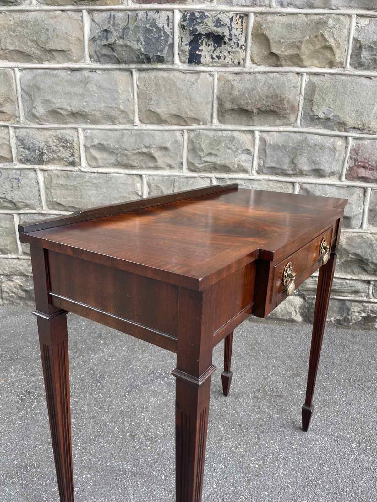 Small raised gallery back, figured mahogany top with a cross banded border. Break front form with a single draw having brass drop handles. Standing on square reeded tapering legs with a spade foot.
