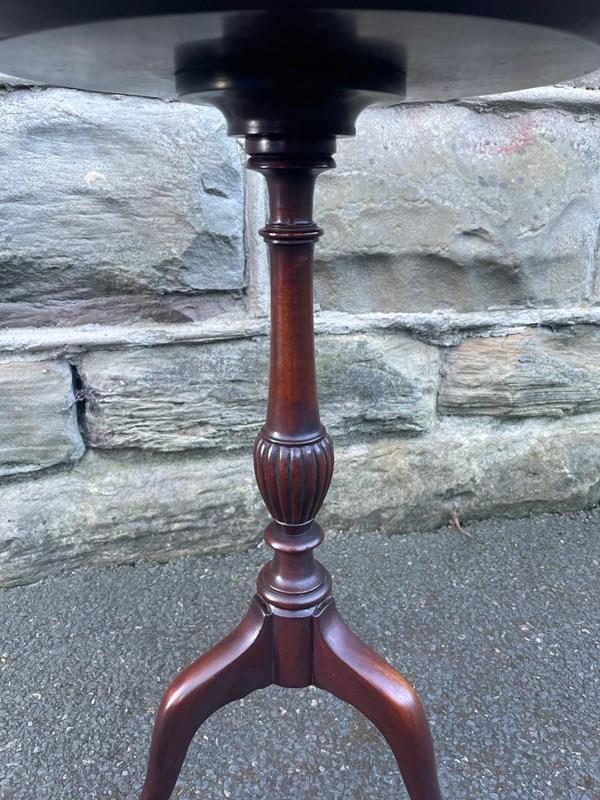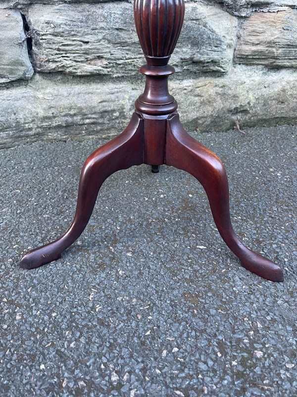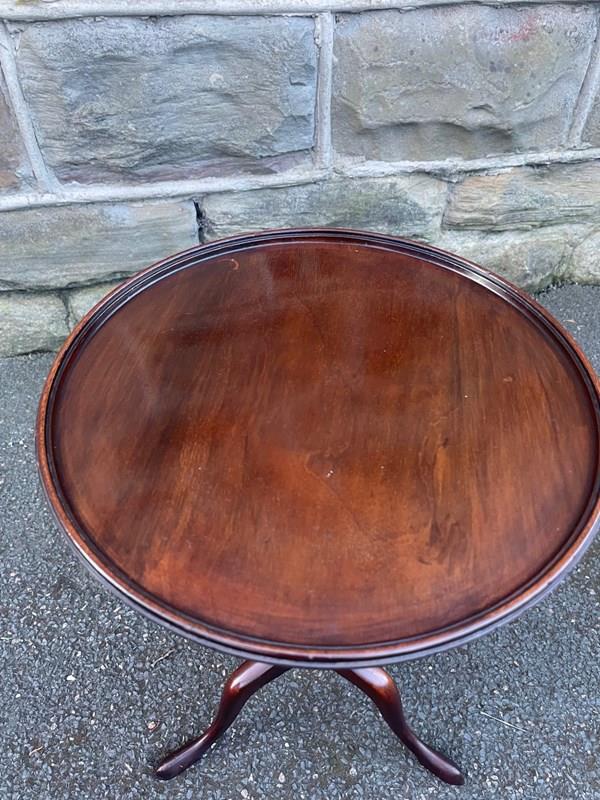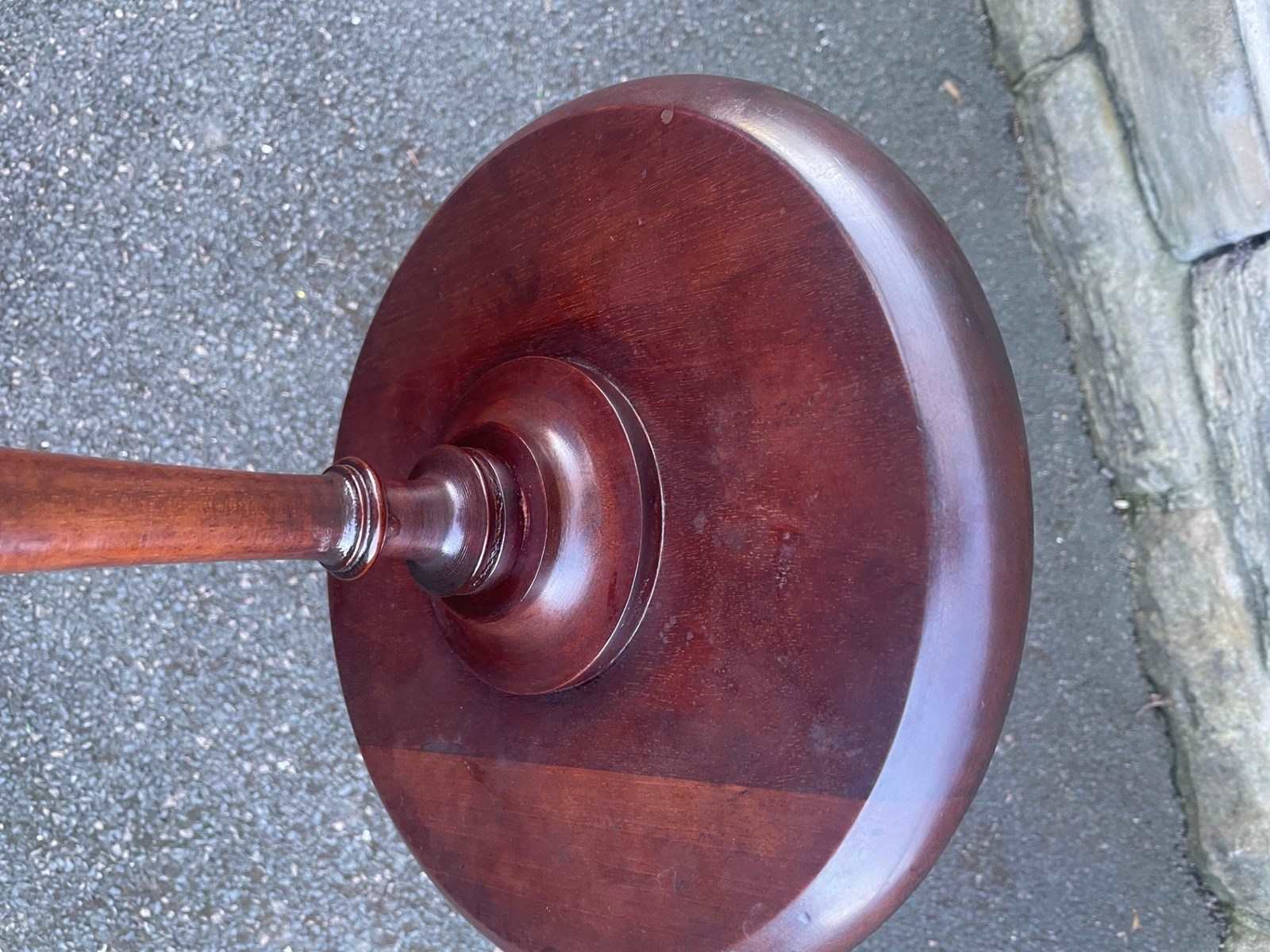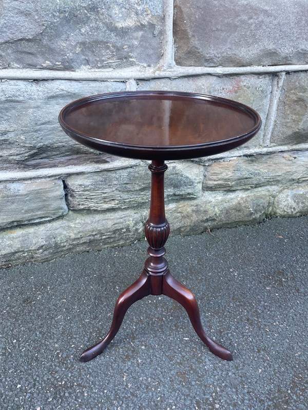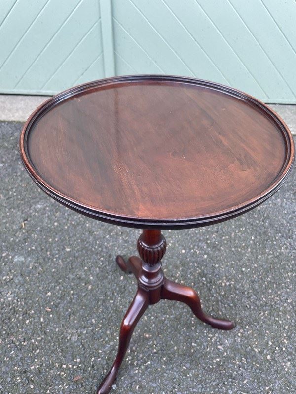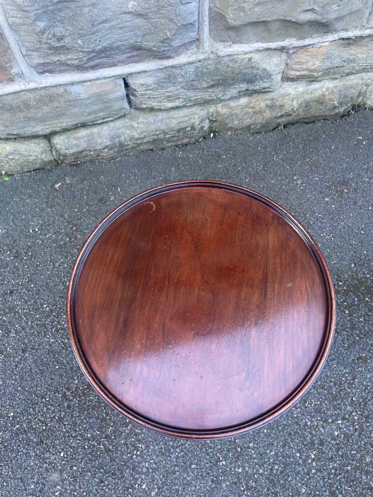 Round dished mahogany top with a beaded edge, upon a turned column with 3 shaped legs.