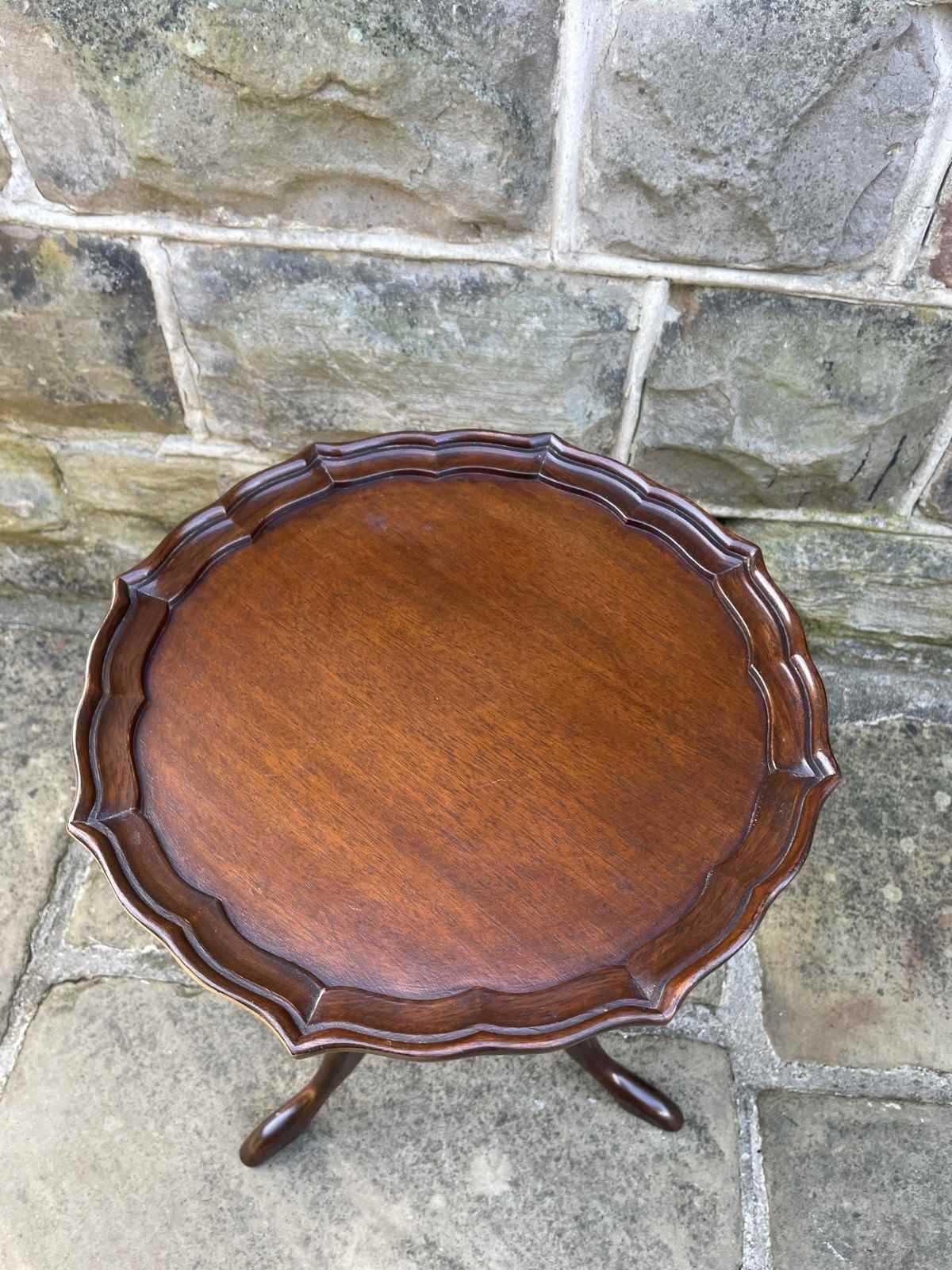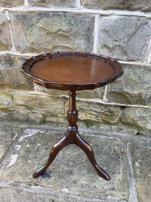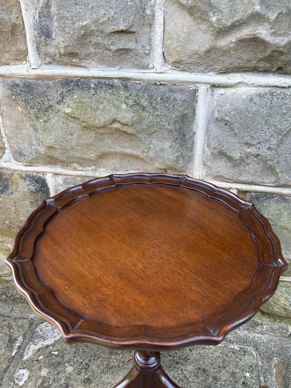 Round mahogany top with a pie crust edge, upon a turned column with 3 shaped legs.