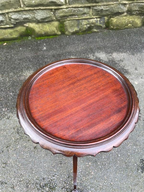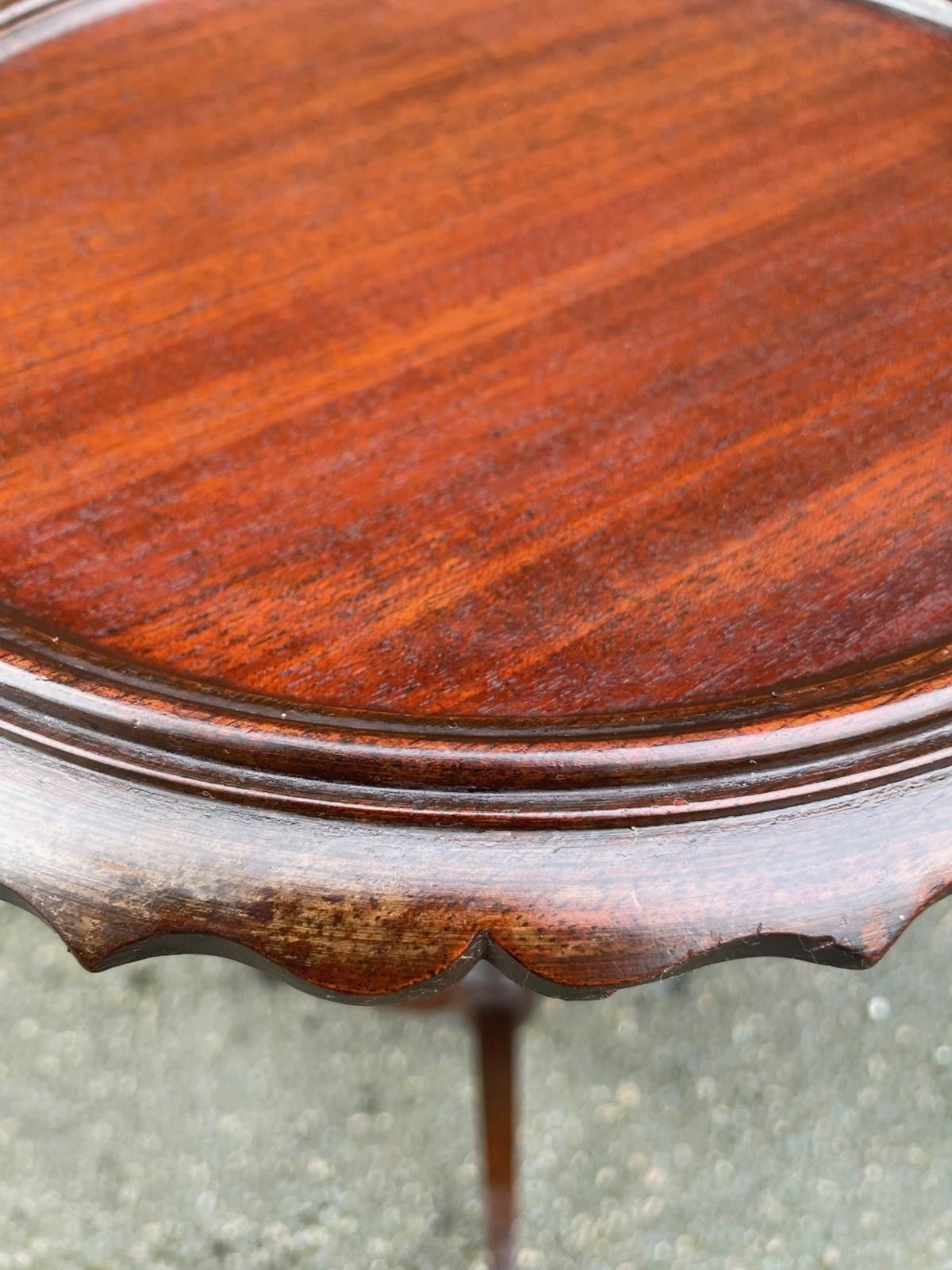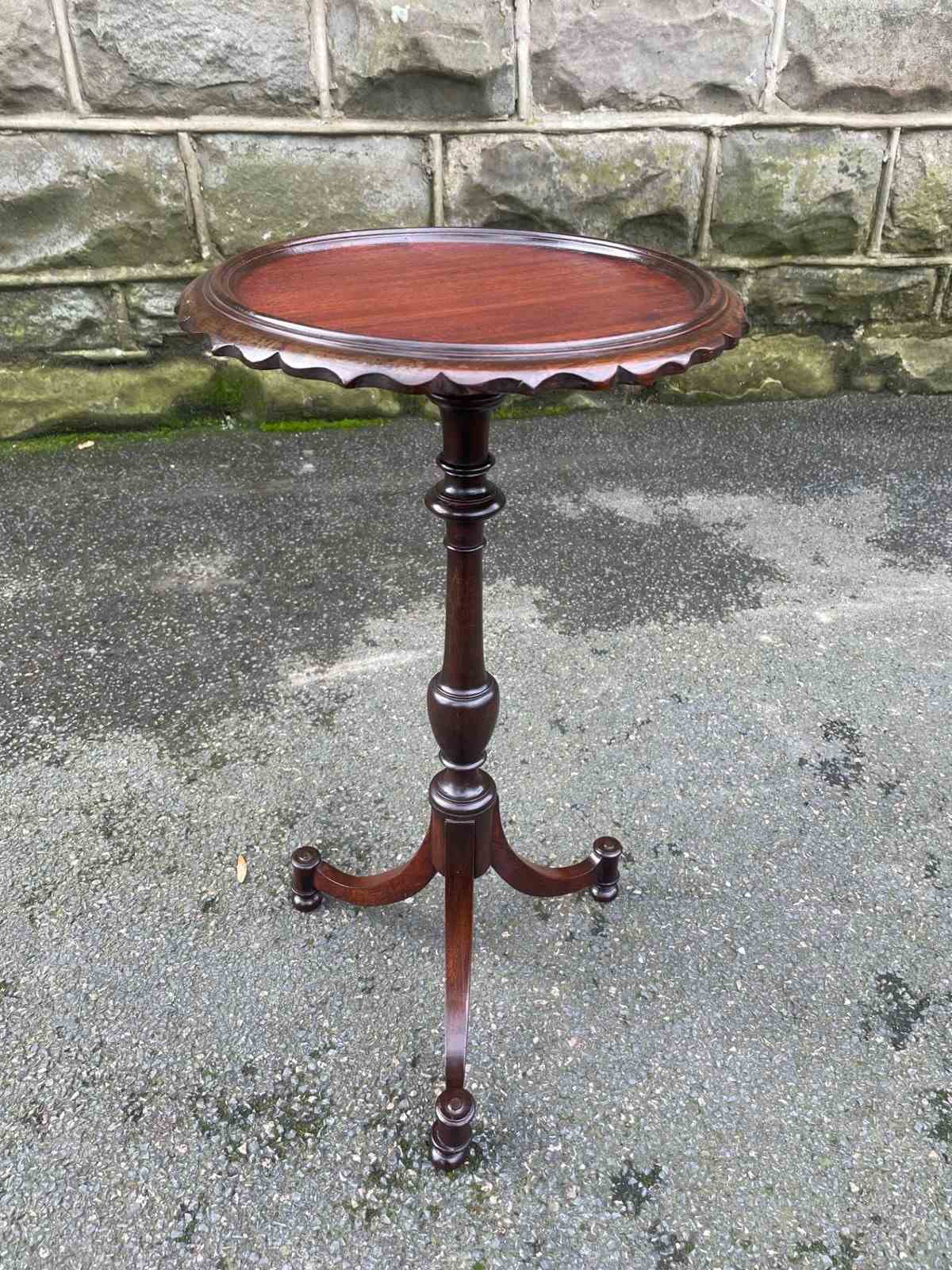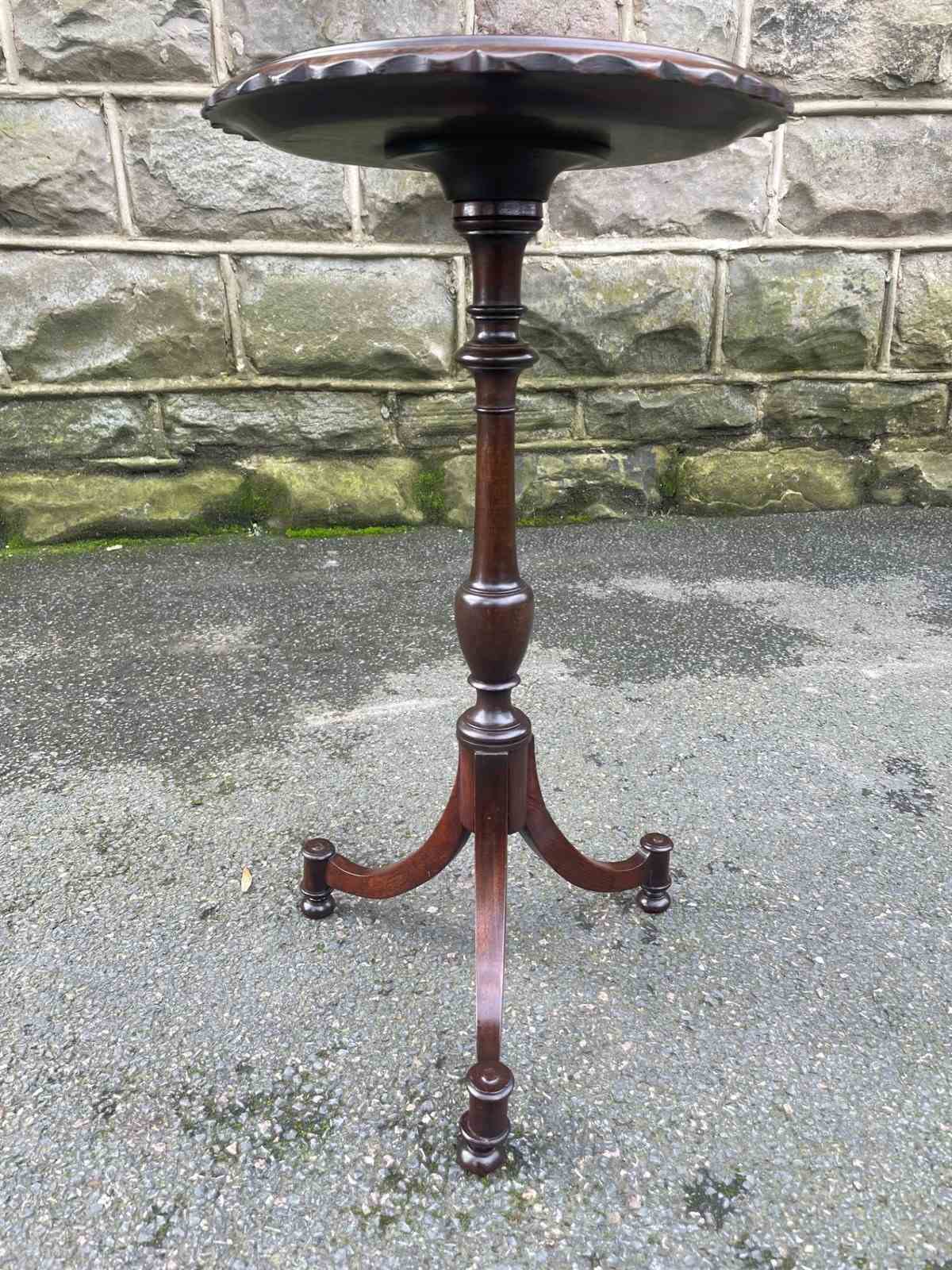 The shaped dished mahogany top upon a turned column with 3 sweeping legs on turned feet
