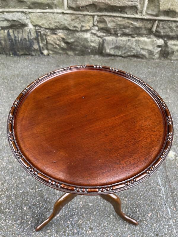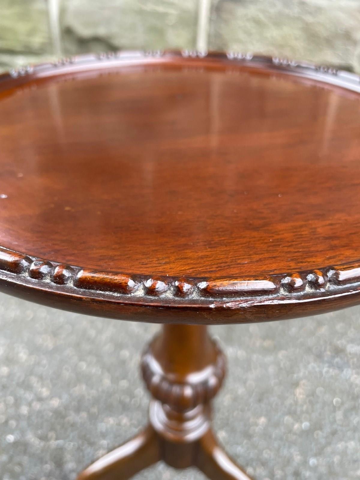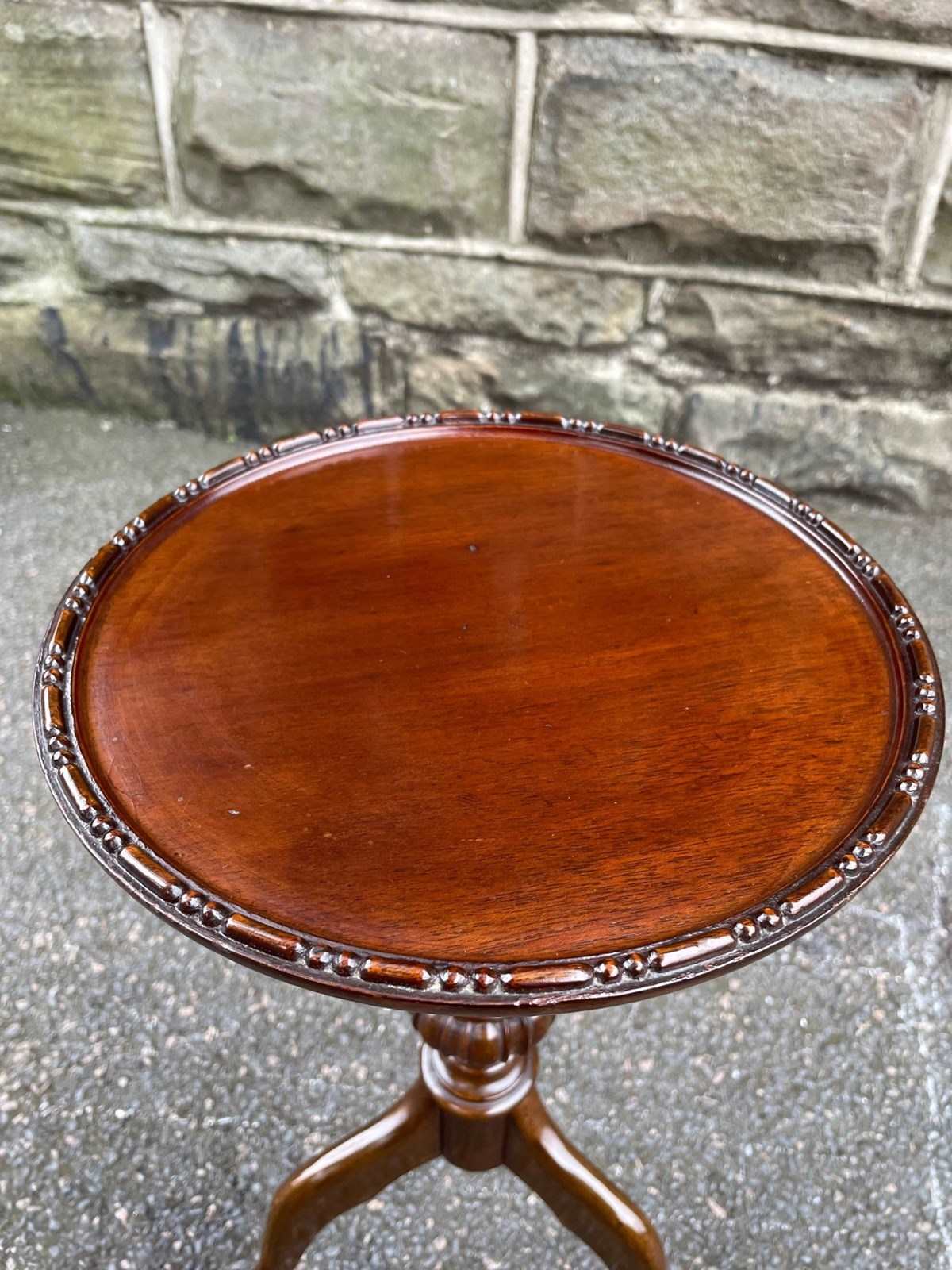 Round dished mahogany top with a beaded edge, upon a turned column with 3 shaped legs.