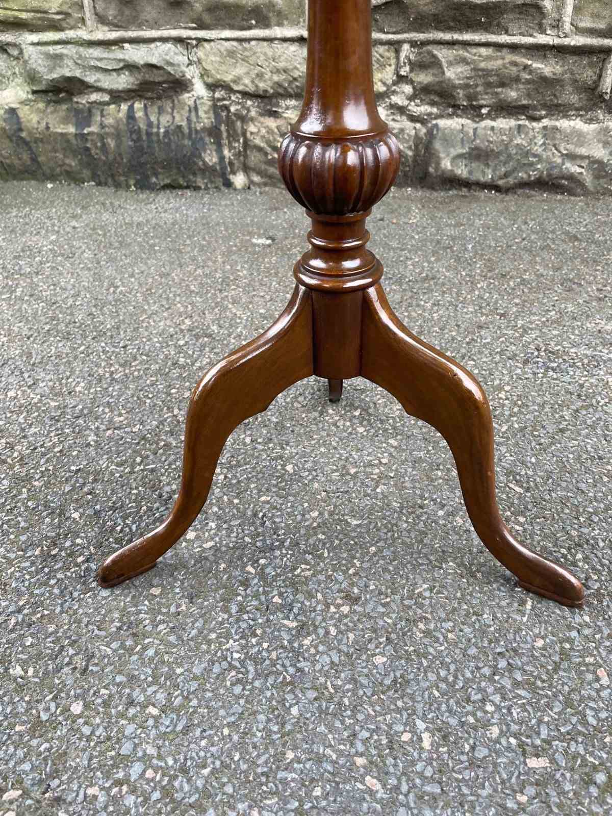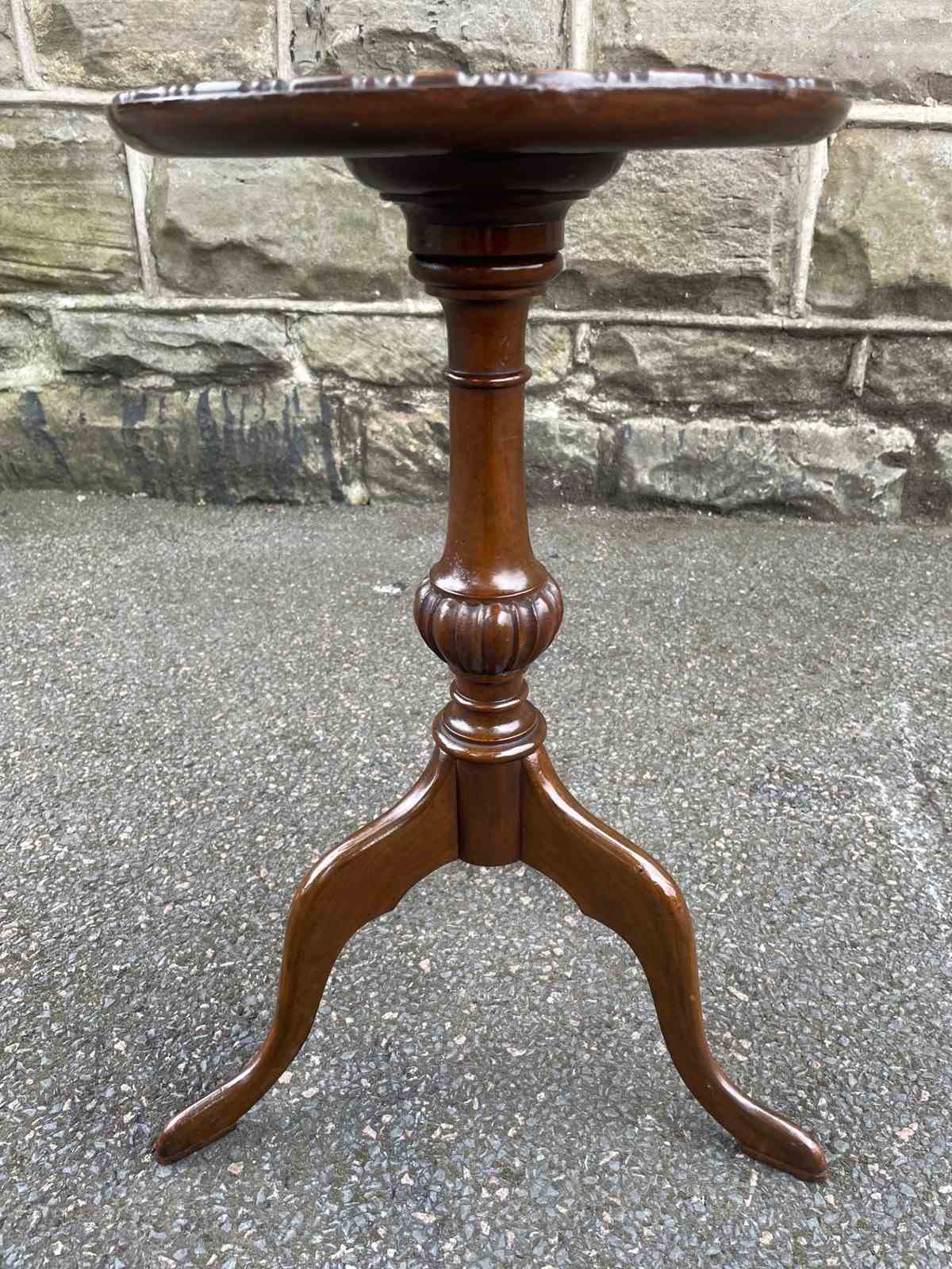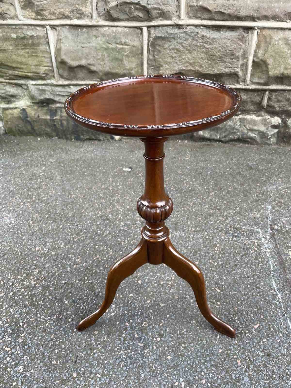 Round dished mahogany top with a beaded edge, upon a turned column with 3 shaped legs.