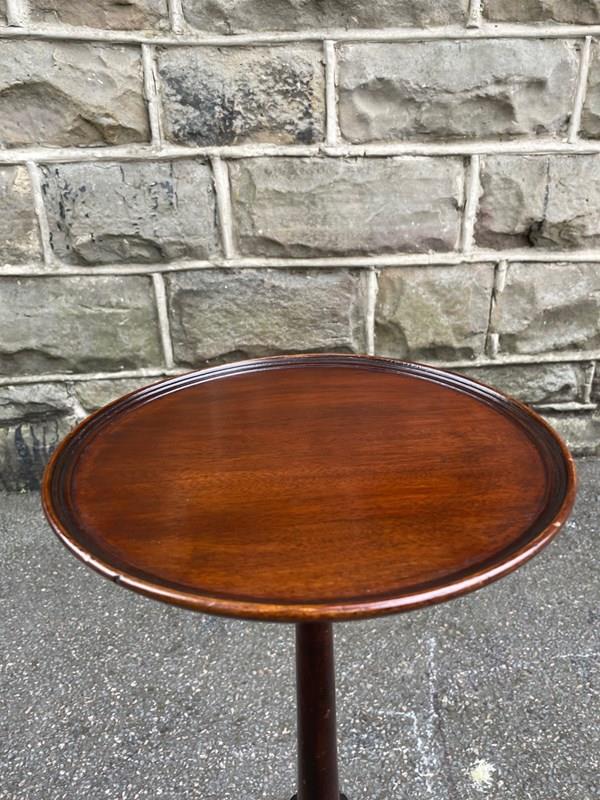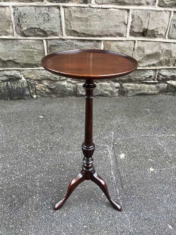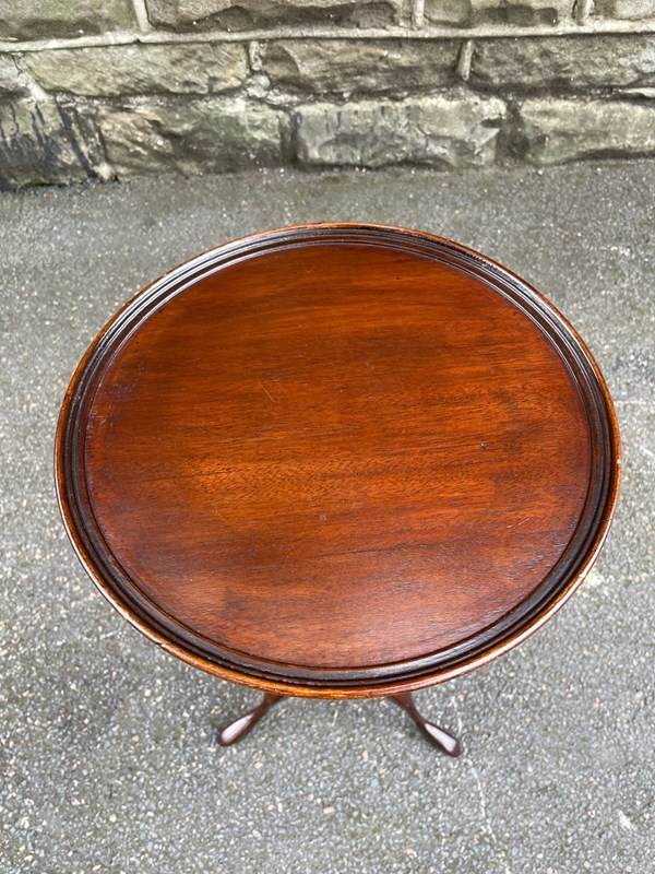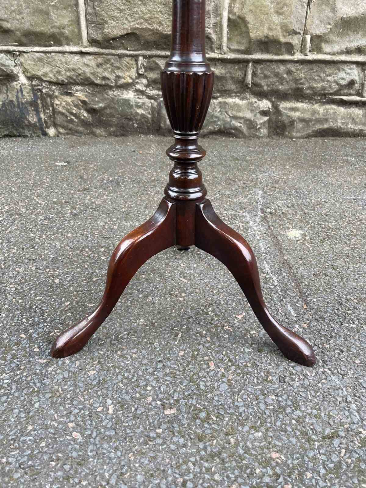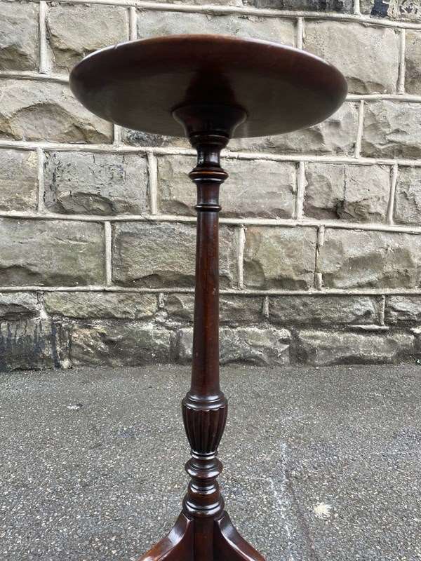 Round dished mahogany tops upon a turned column with 3 shaped legs.