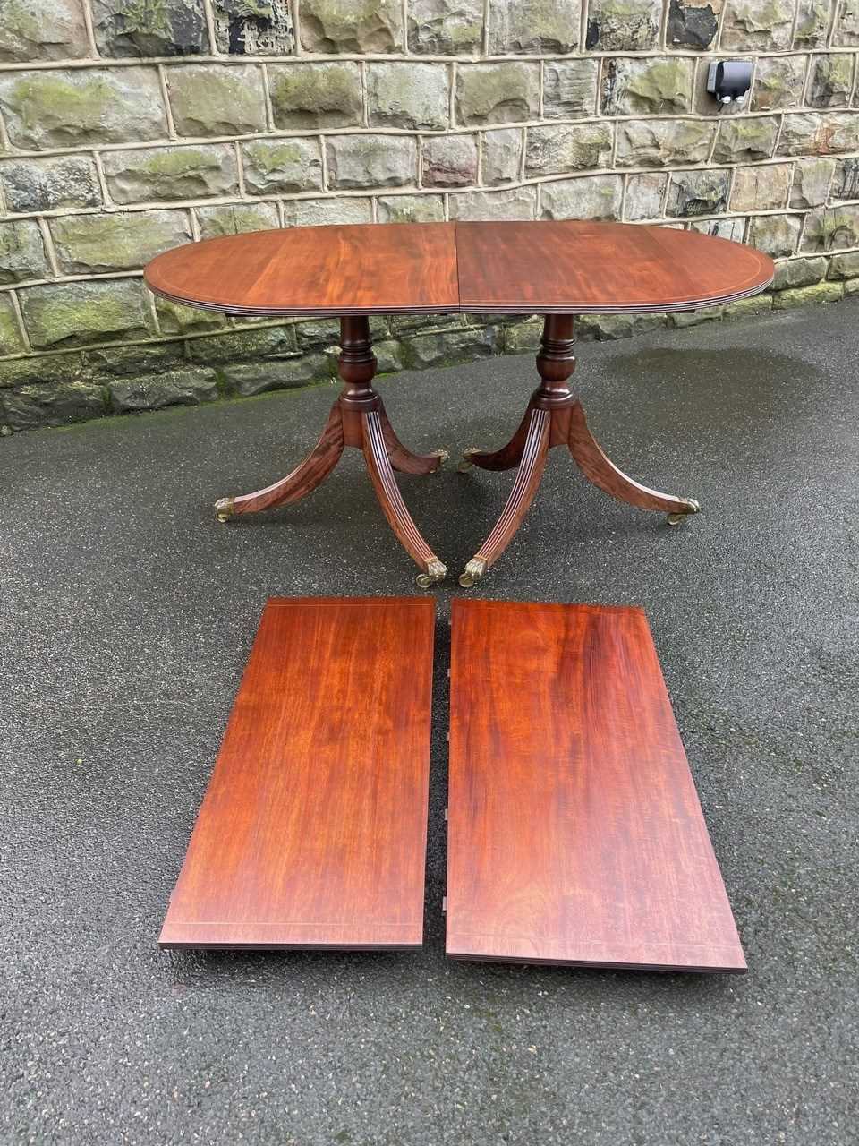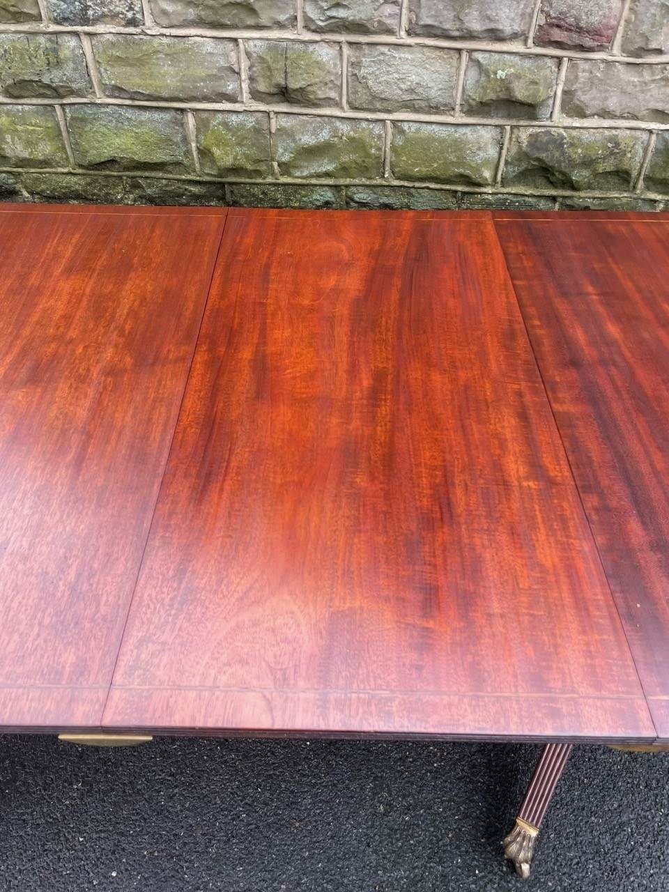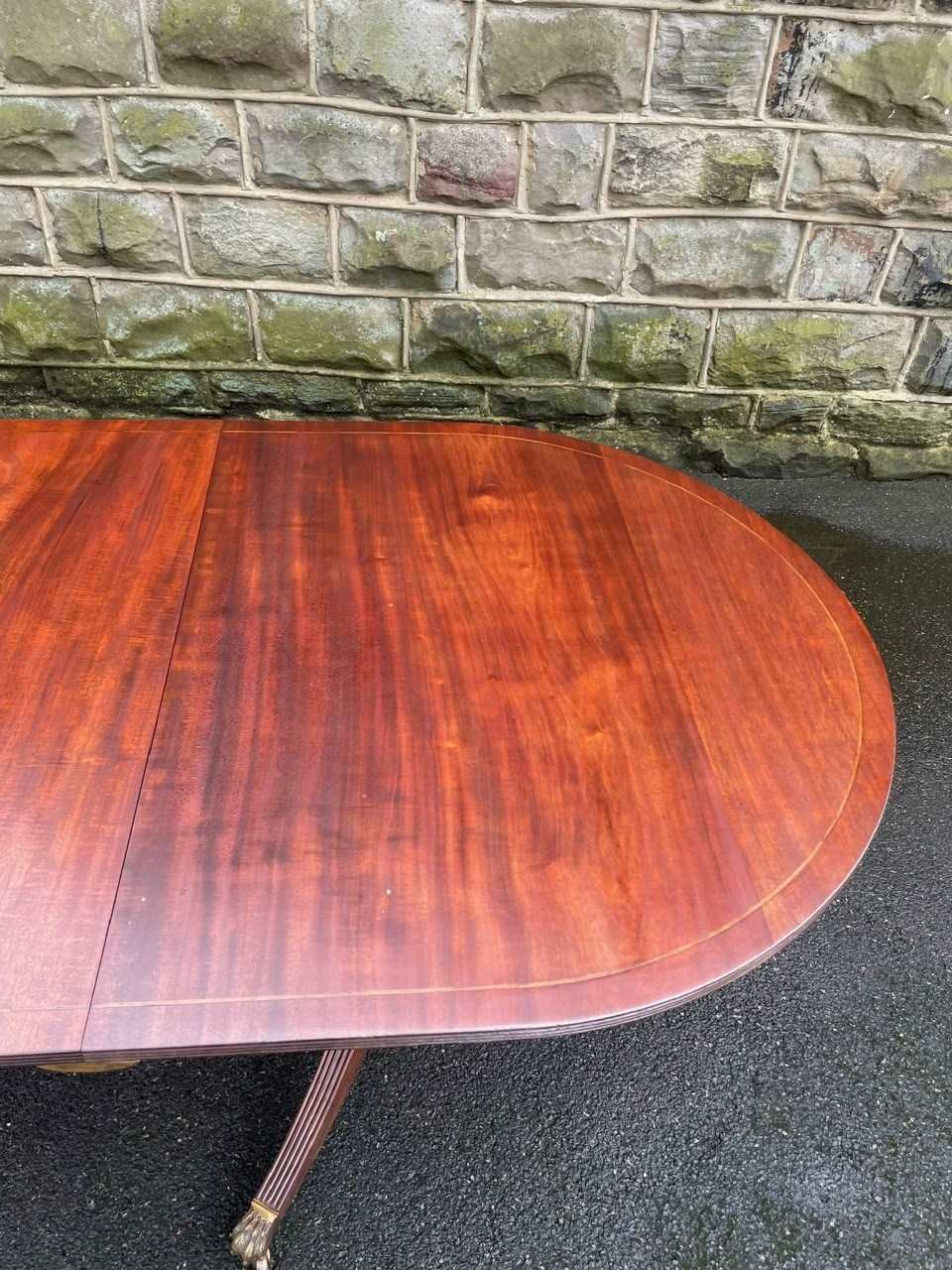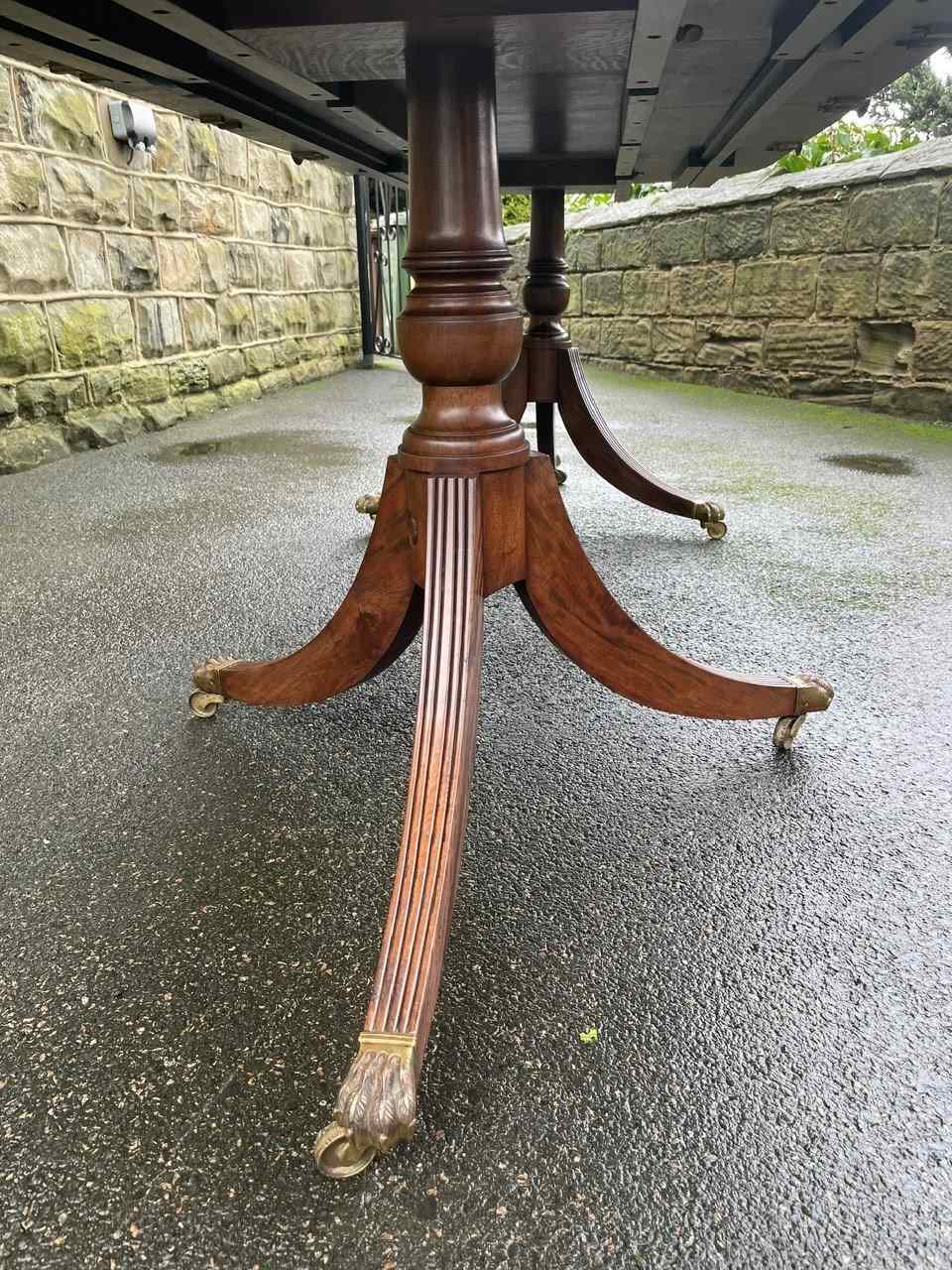 Would seat 10 people comfortably. Regency style. Solid mahogany. Wonderful colour mahogany top with a cross banded border. Standing on twin pillar supports with turned central column, 3 splayed legs with brass paw castors. 2 additional leaves. The table can be used with the 2 or 1 leaf in, or as 2 "D" ends put together. Brass clips to fasten the table together under the top.