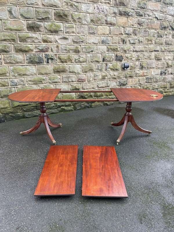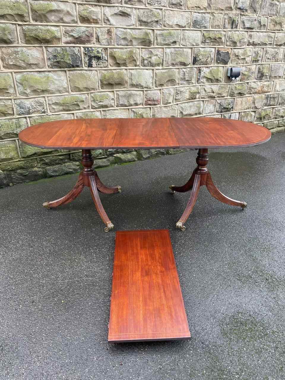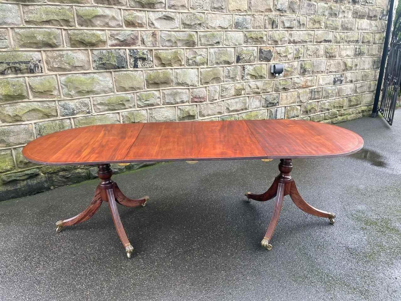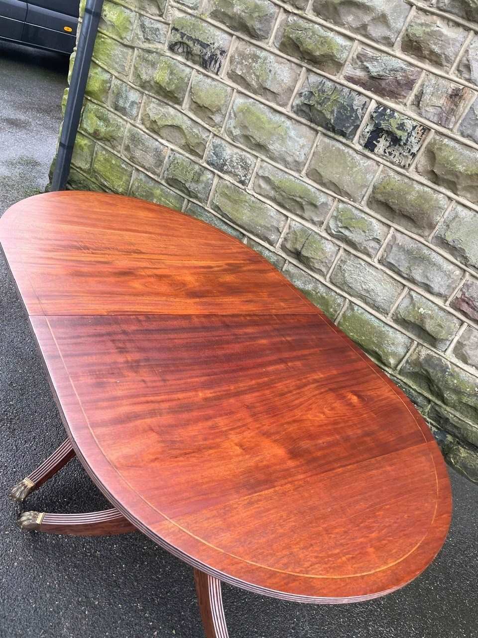 Would seat 10 people comfortably. Regency style. Solid mahogany. Wonderful colour mahogany top with a cross banded border. Standing on twin pillar supports with turned central column, 3 splayed legs with brass paw castors. 2 additional leaves. The table can be used with the 2 or 1 leaf in, or as 2 "D" ends put together. Brass clips to fasten the table together under the top.