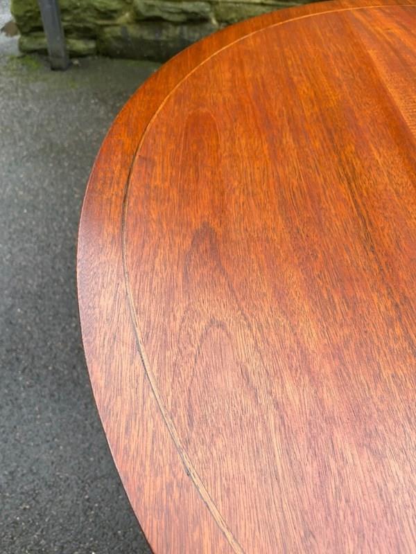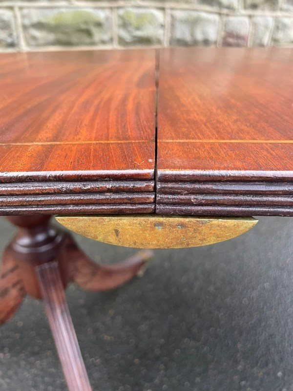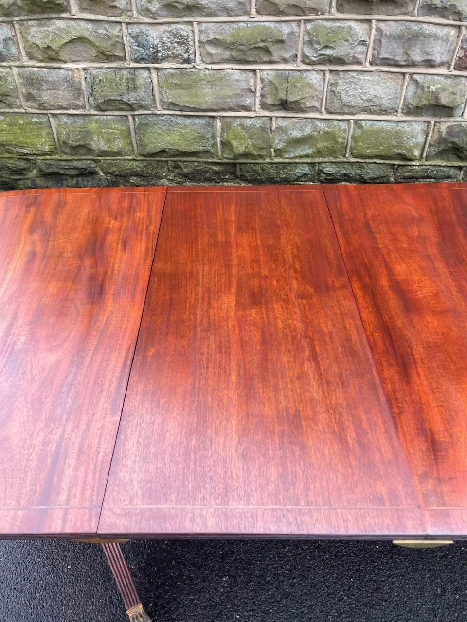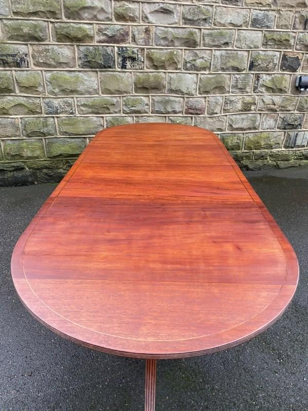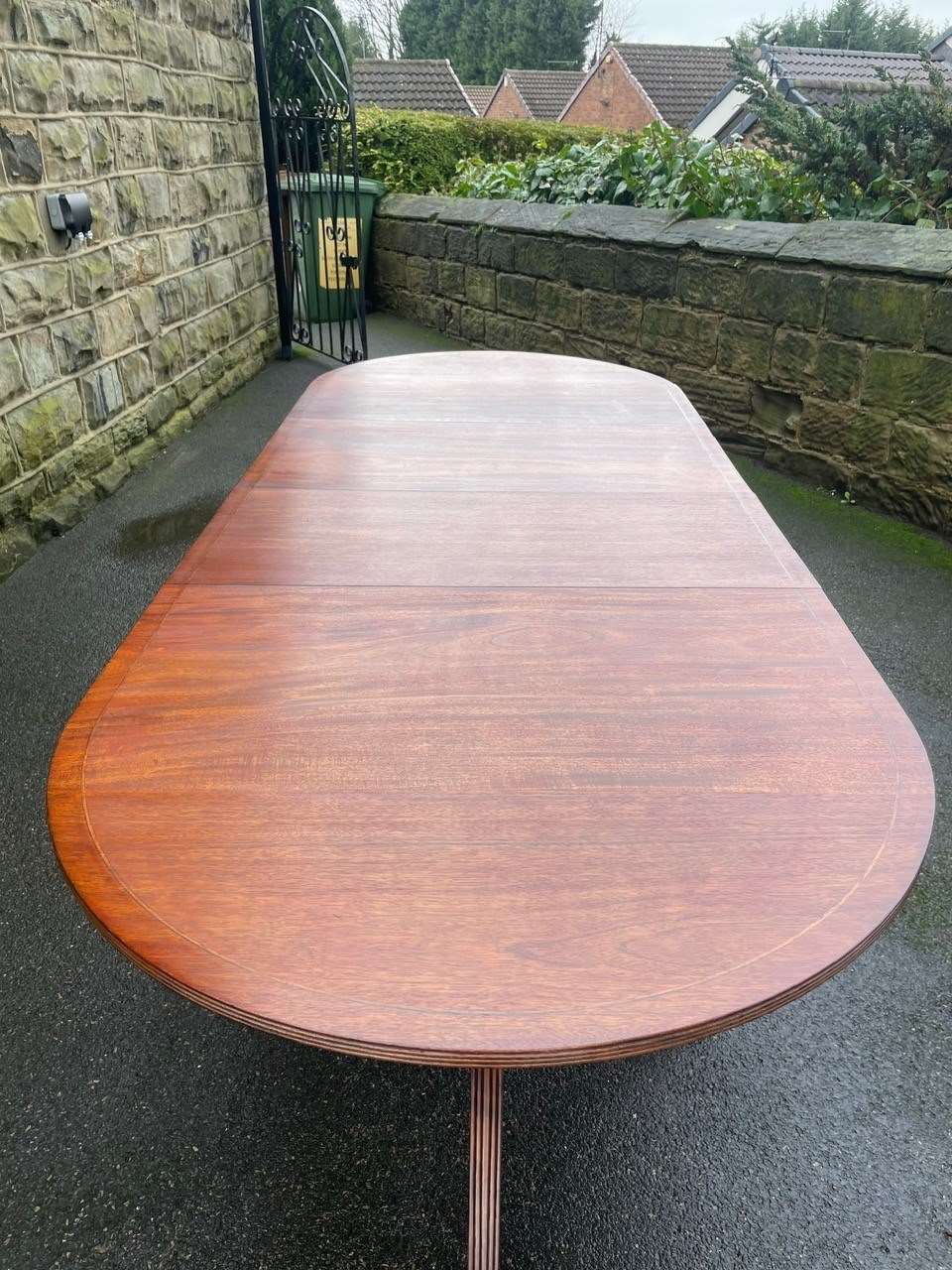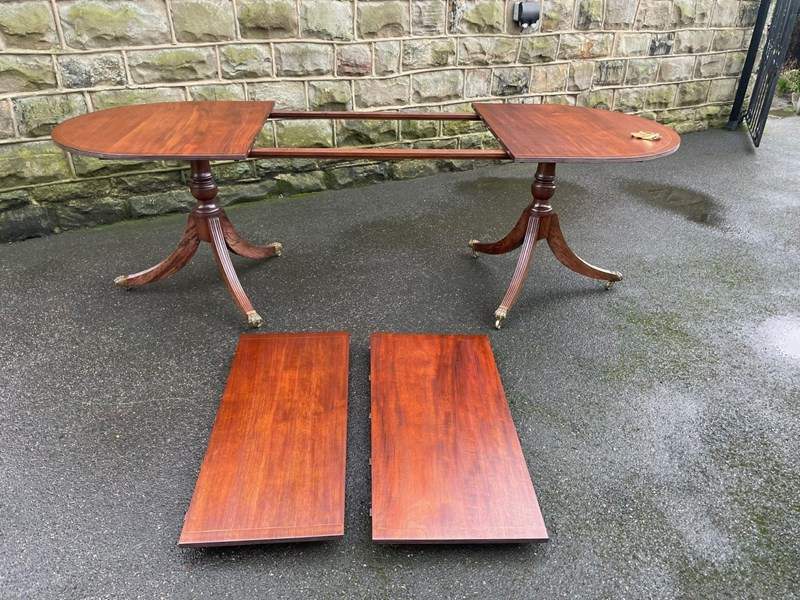 Would seat 10 people comfortably. Regency style. Solid mahogany. Wonderful colour mahogany top with a cross banded border. Standing on twin pillar supports with turned central column, 3 splayed legs with brass paw castors. 2 additional leaves. The table can be used with the 2 or 1 leaf in, or as 2 "D" ends put together. Brass clips to fasten the table together under the top.