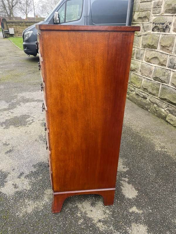 Unusual to be 7 height draws, in mahogany having 2 smaller over 6 larger graduated draws all with brass handles & brass locks. Polished mahogany sides standing upon splayed bracket feet. Oak lined draws.