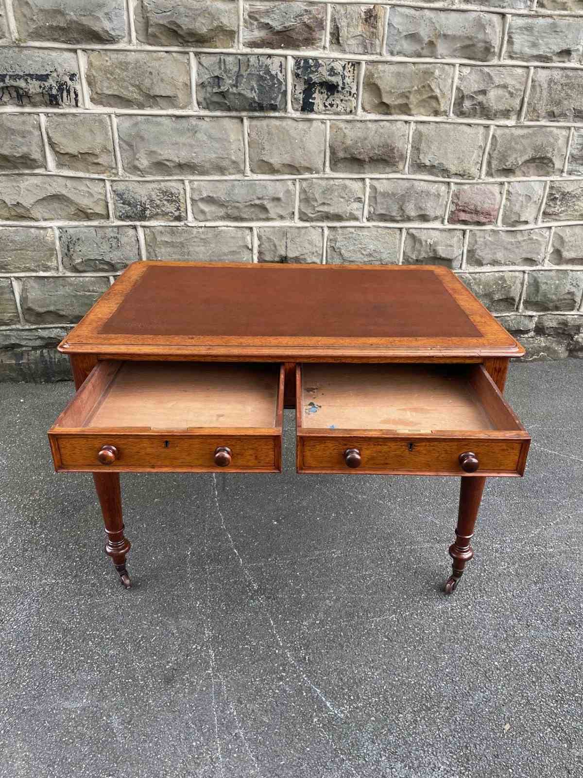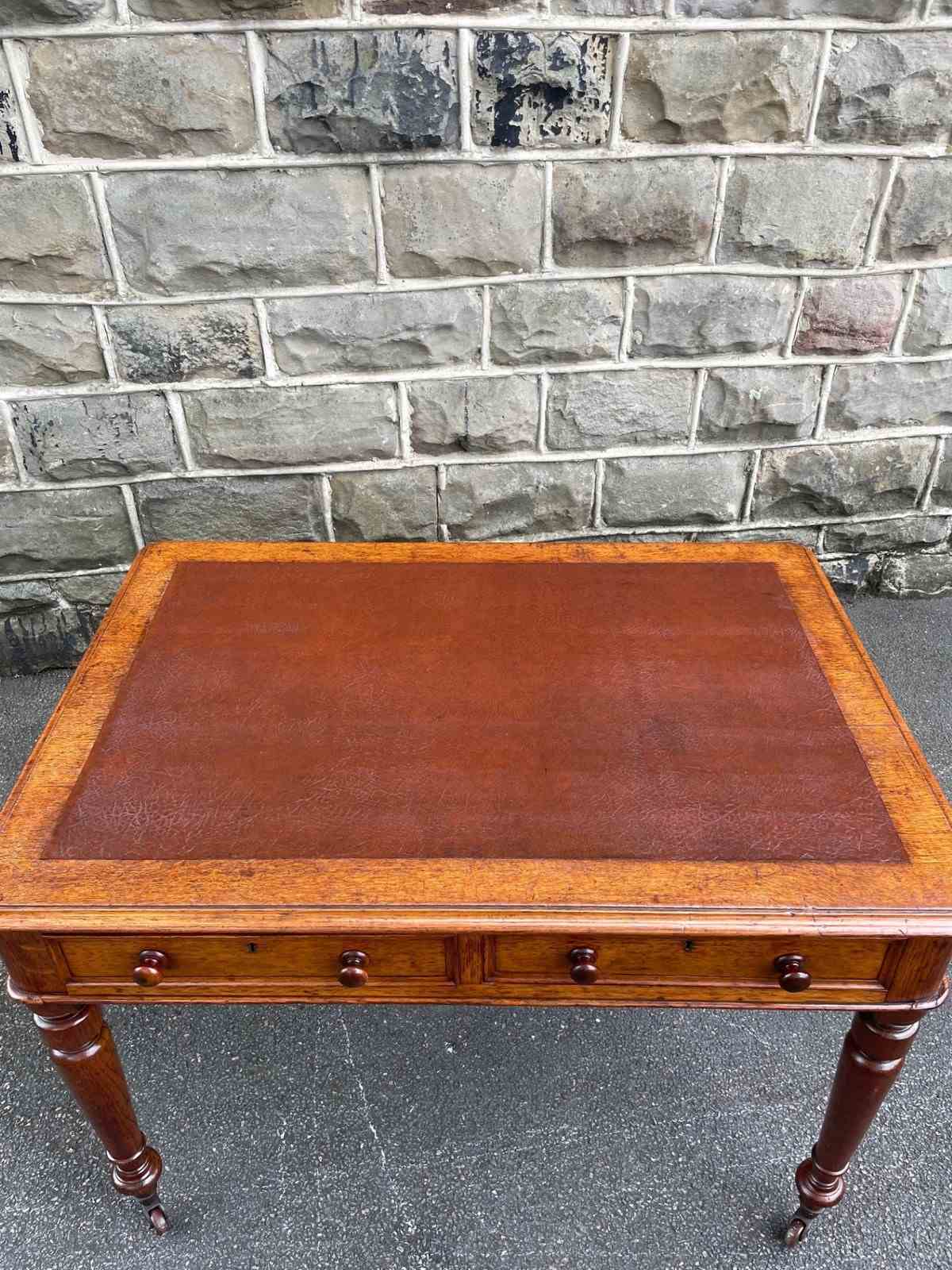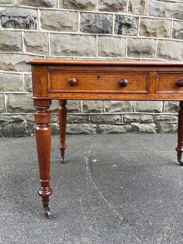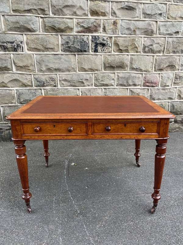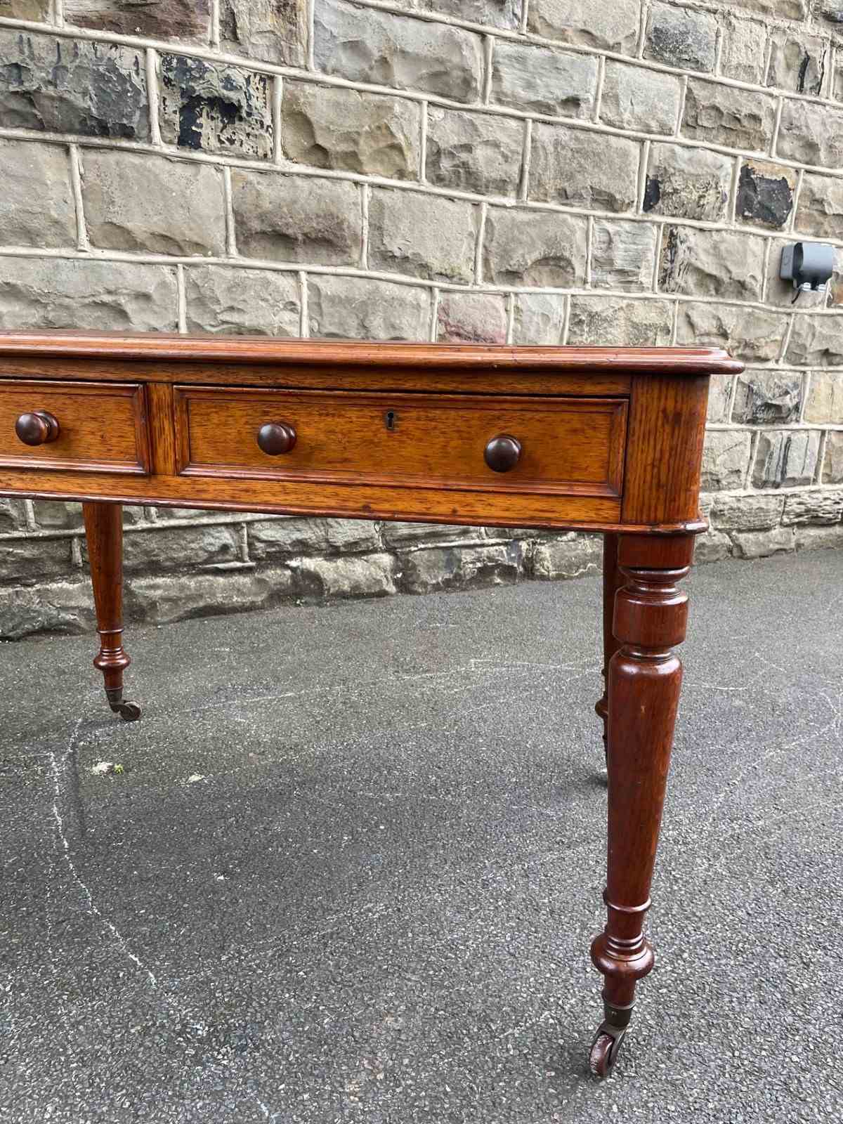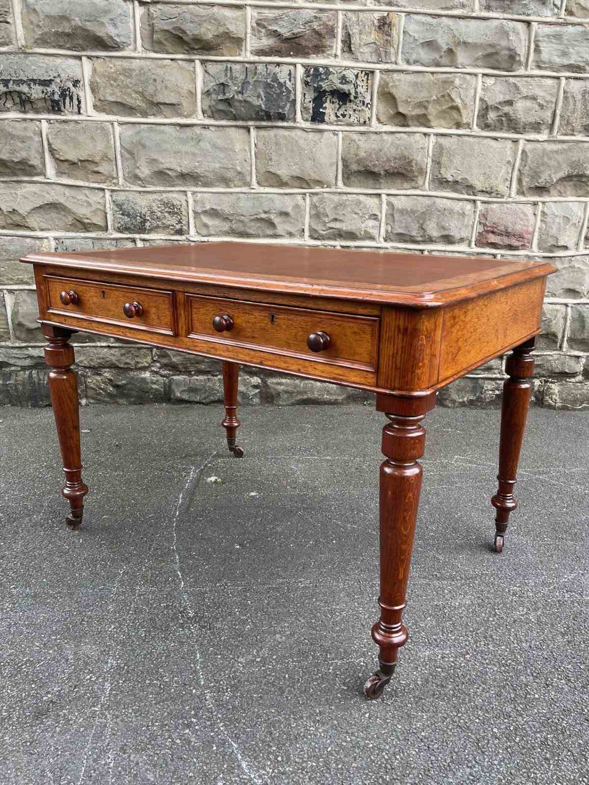 In oak having a recessed leather top, 2 draws with turned wooden knob handles standing upon oak turned legs with brass & ceramic castors.