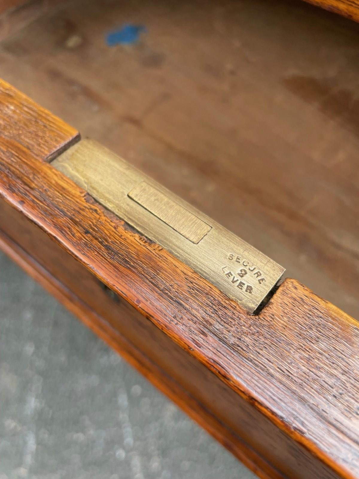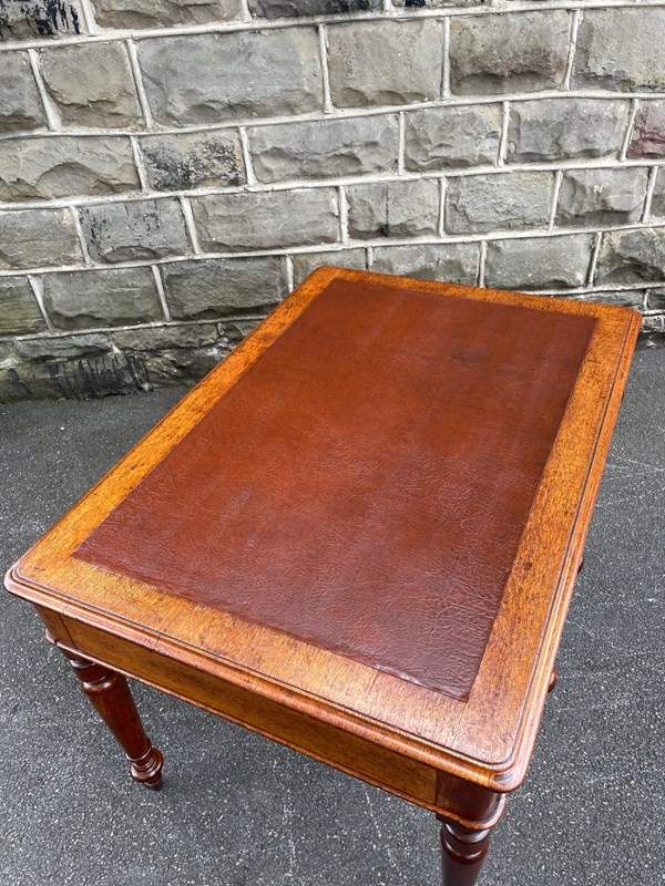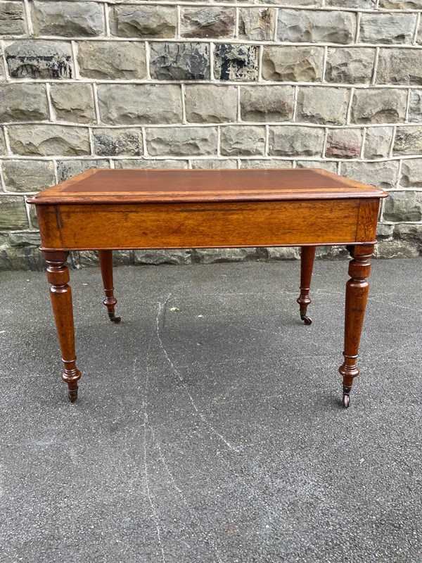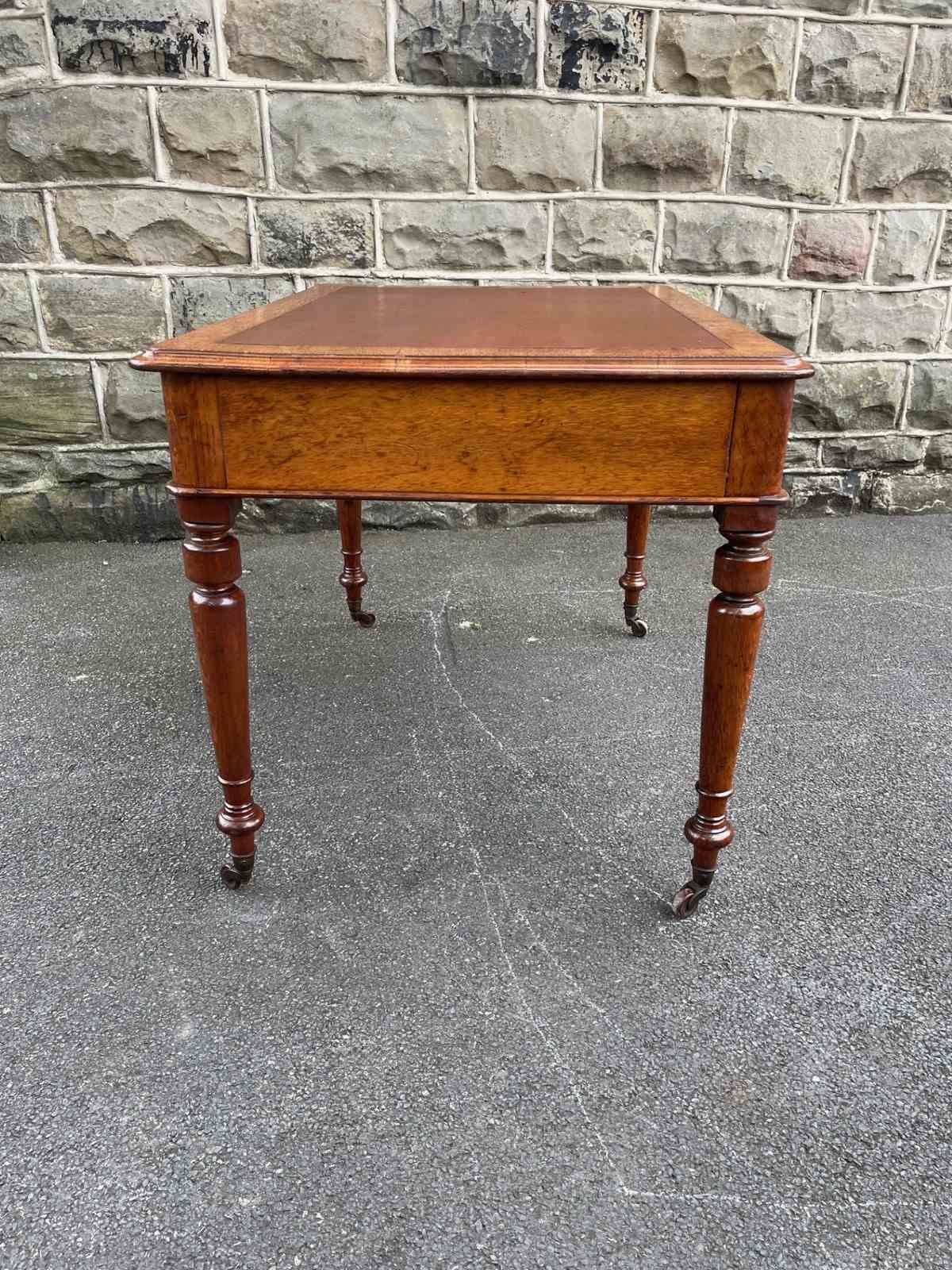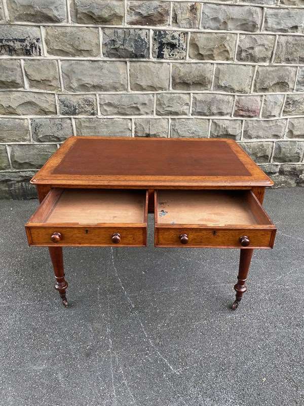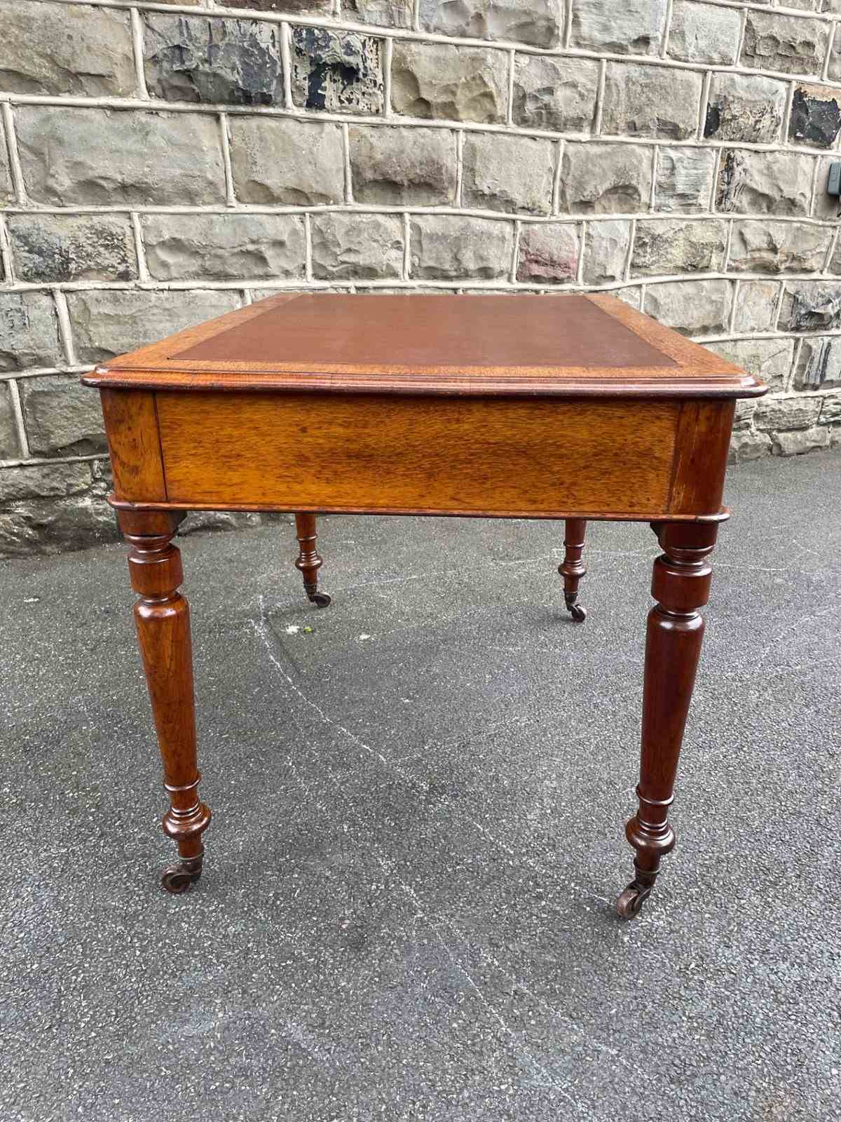 In oak having a recessed leather top, 2 draws with turned wooden knob handles standing upon oak turned legs with brass & ceramic castors.