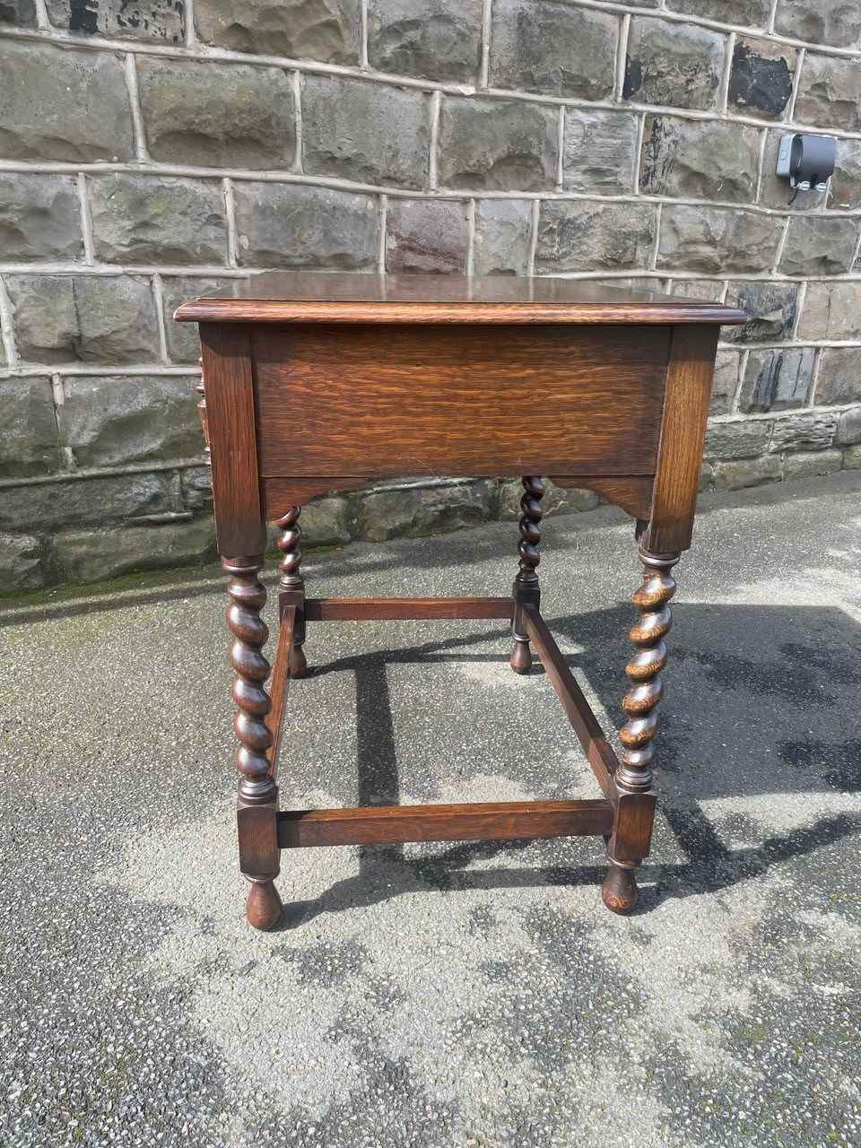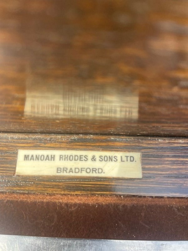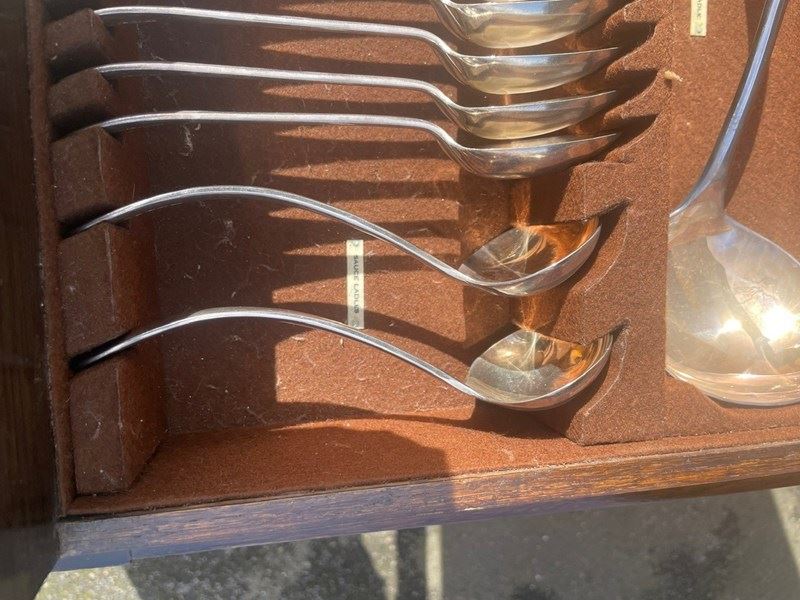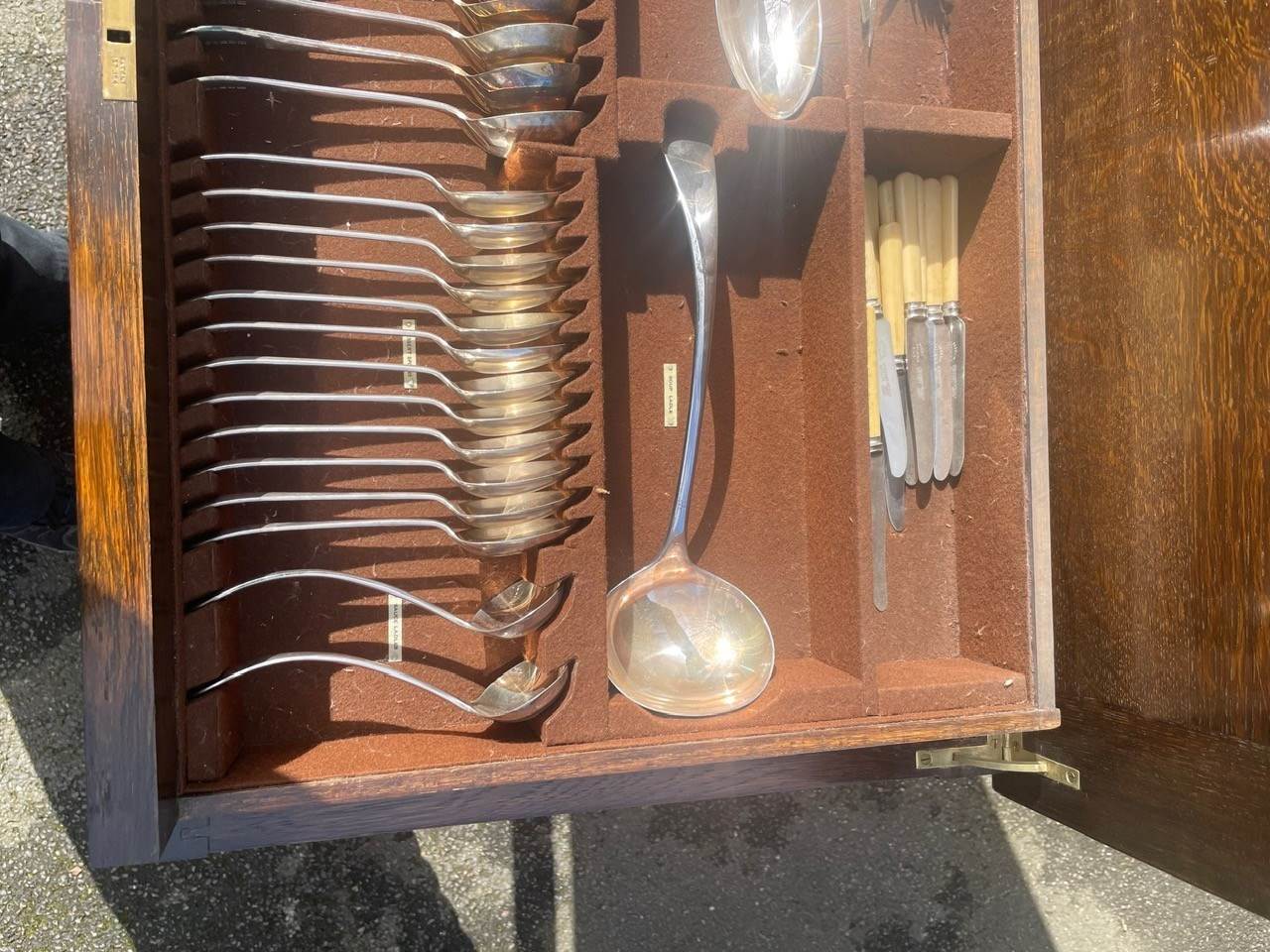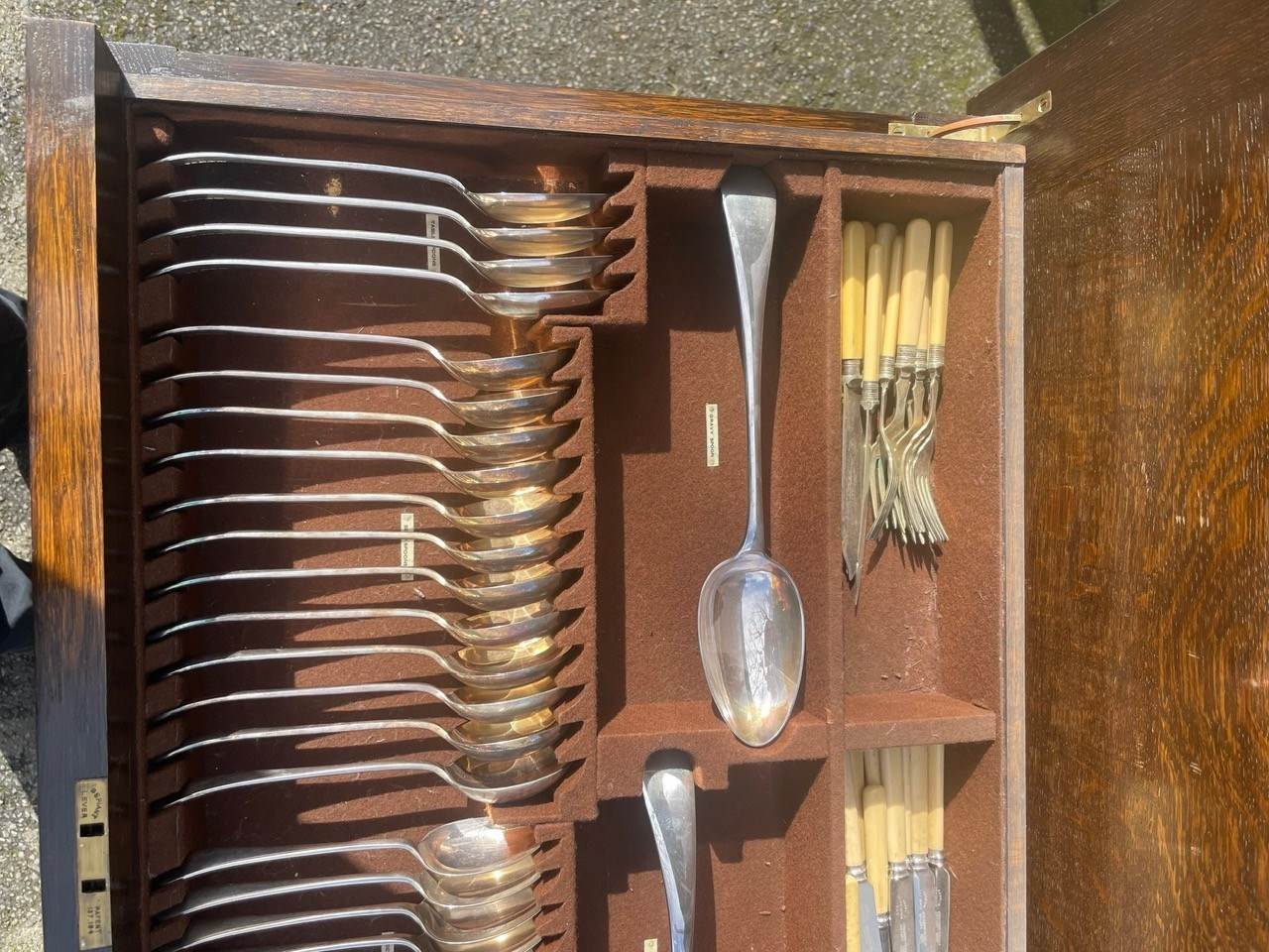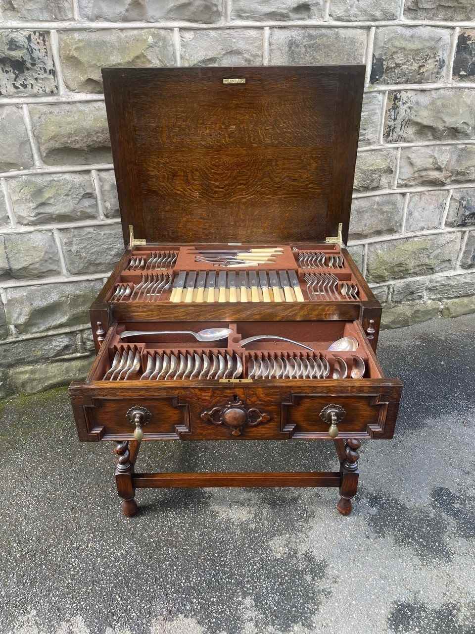 The Oak table standing on barley twist legs has a lift up lid & pull out draw. The complete silver plated cutlery is made by Manoah Rhodes & Son Ltd of Bradford. 12 places setting. It doesn't have a key to lock the drawer. Complete . It also have some additional loose set of fish knives & forks & extra knives