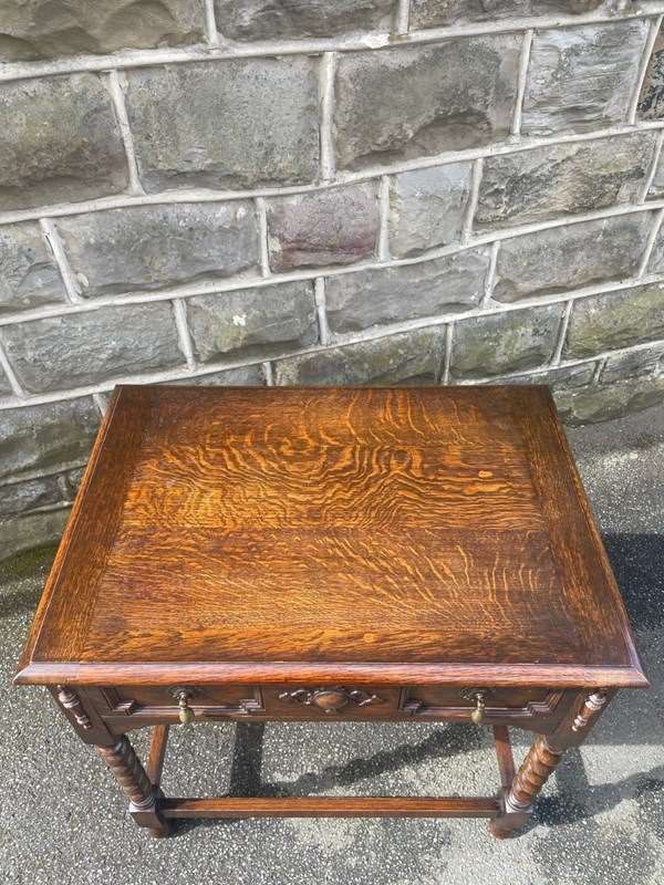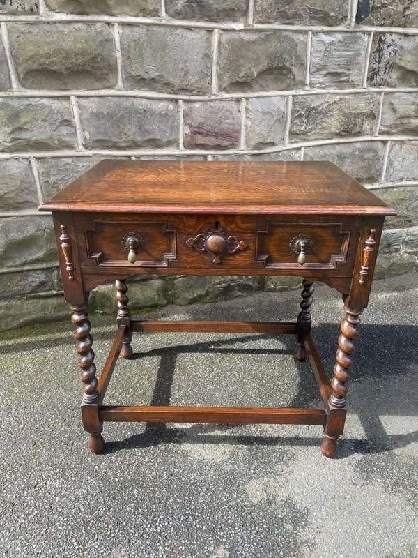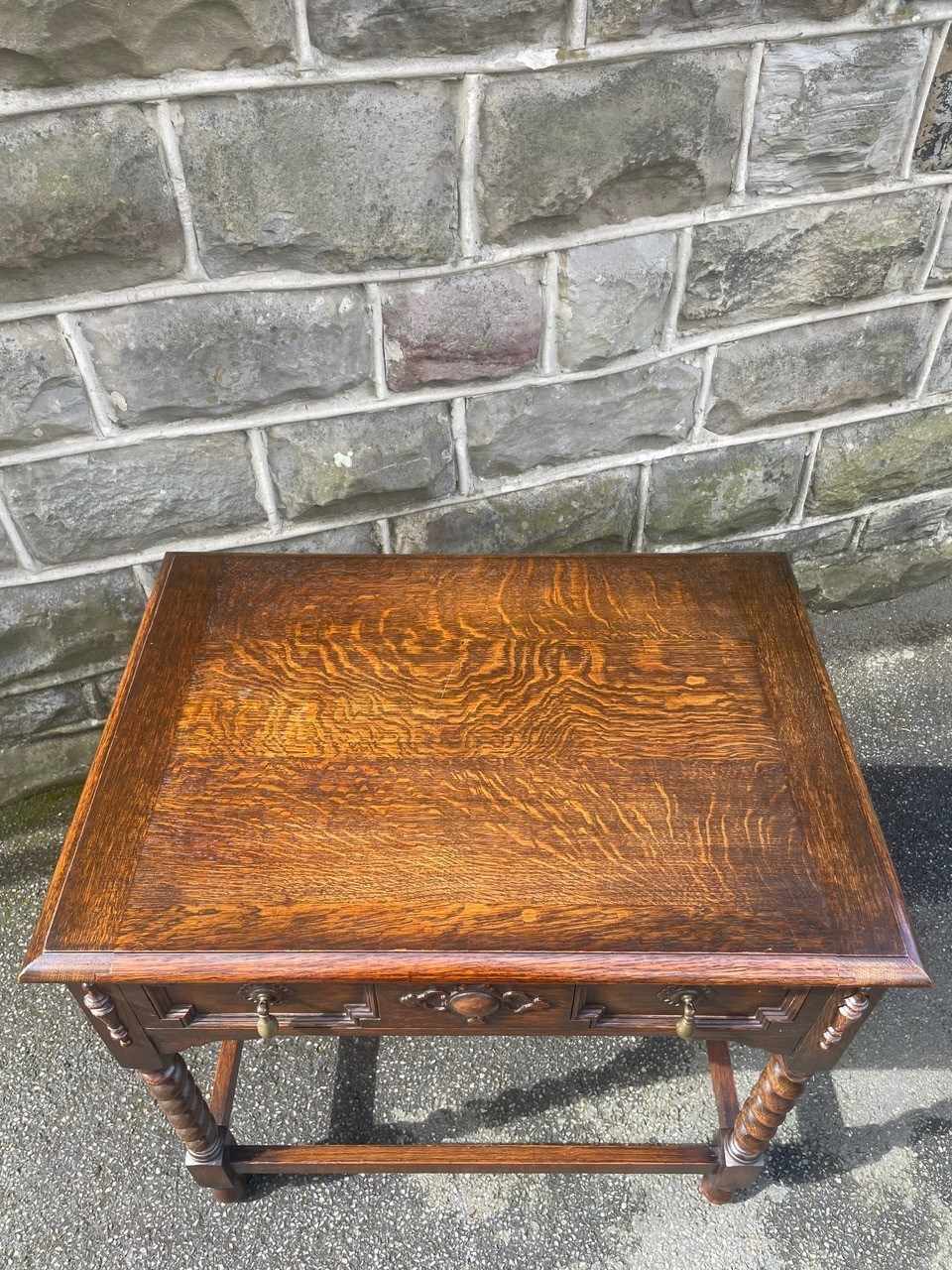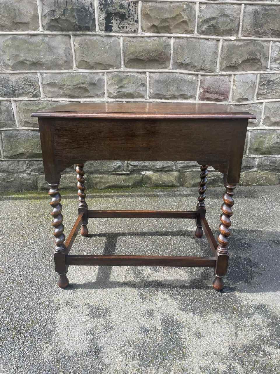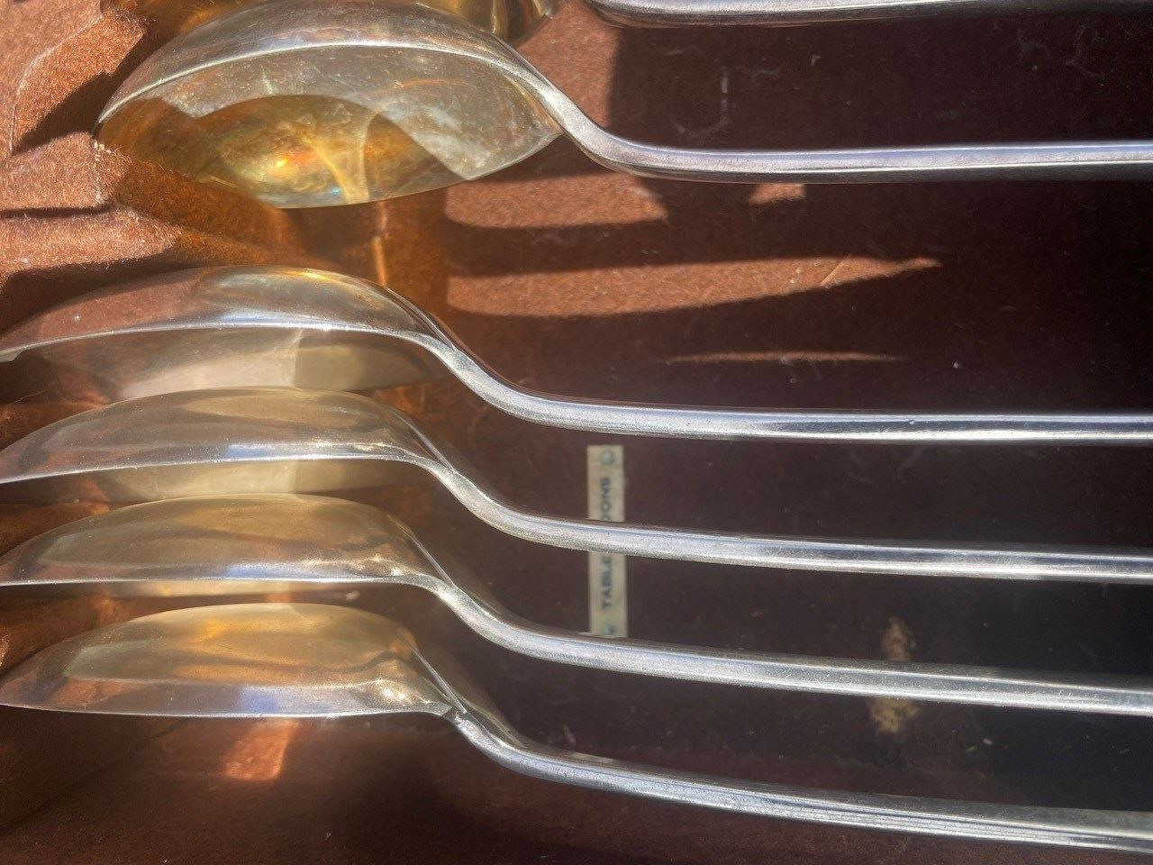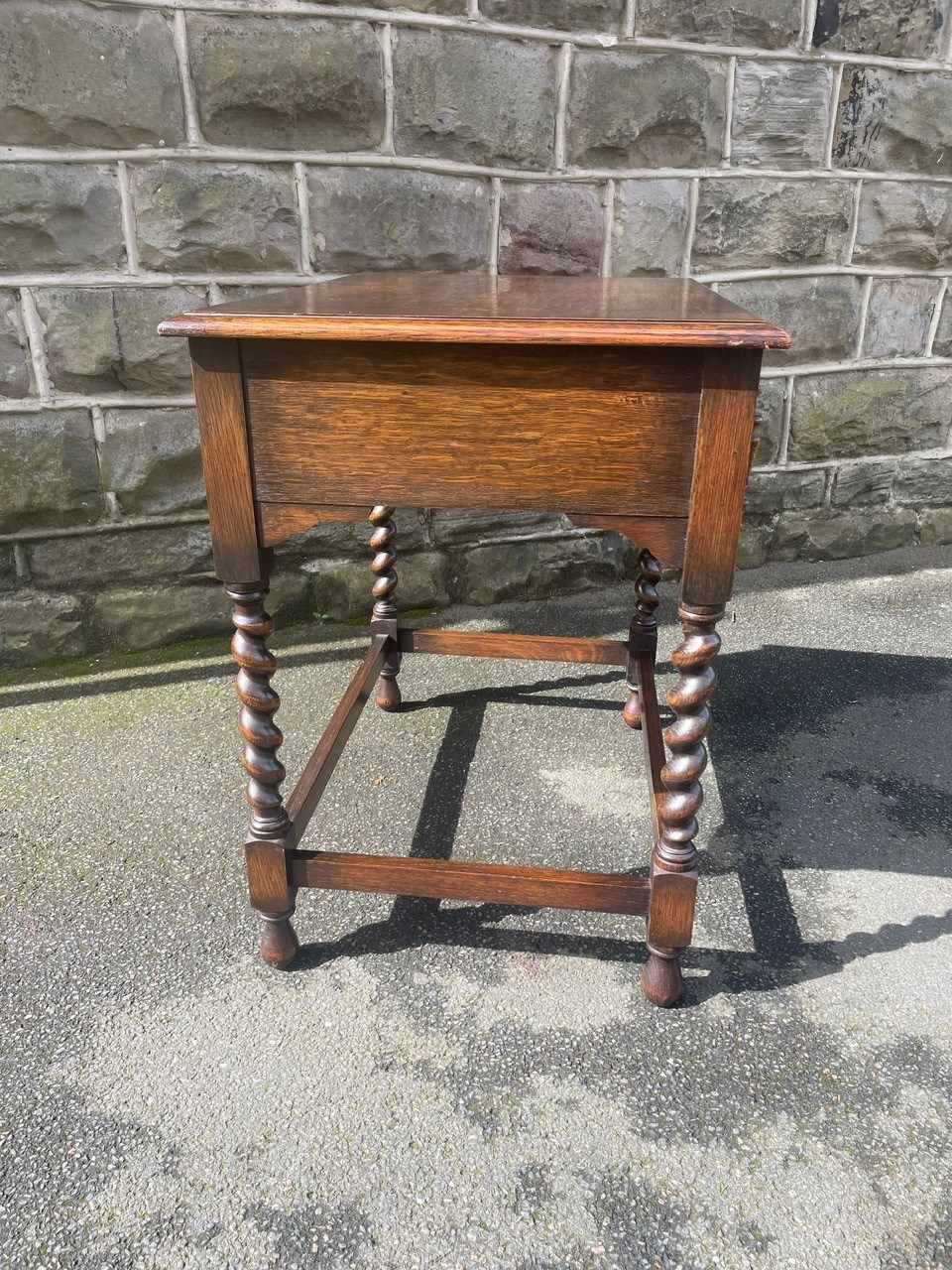 The Oak table standing on barley twist legs has a lift up lid & pull out draw. The complete silver plated cutlery is made by Manoah Rhodes & Son Ltd of Bradford. 12 places setting. It doesn't have a key to lock the drawer. Complete . It also have some additional loose set of fish knives & forks & extra knives