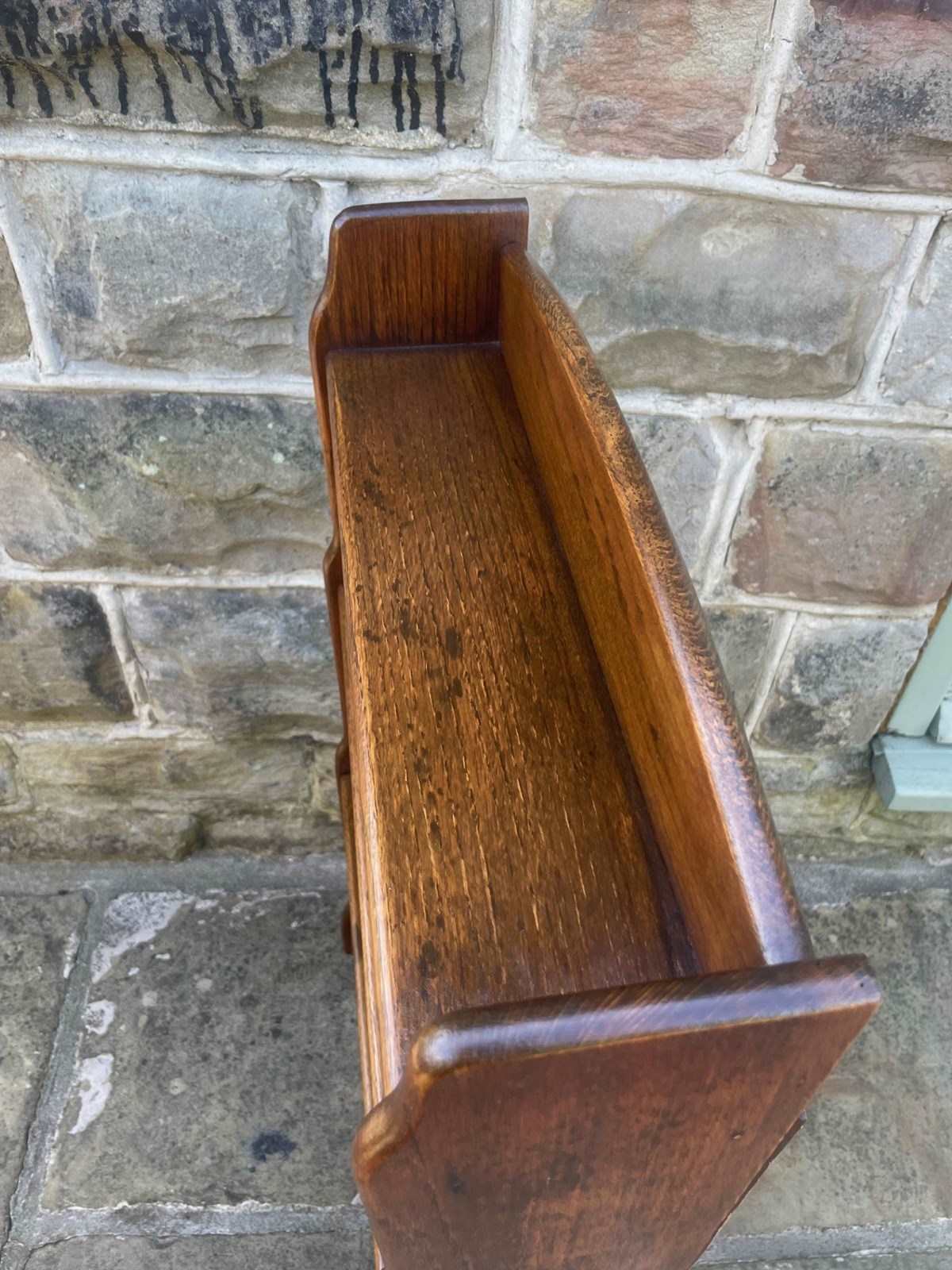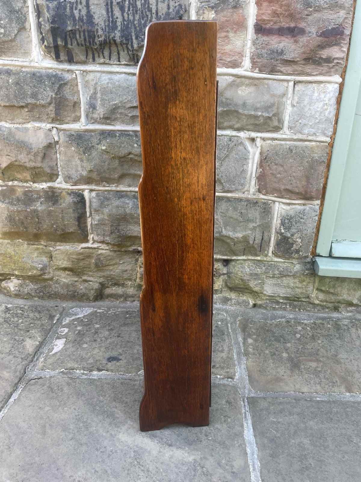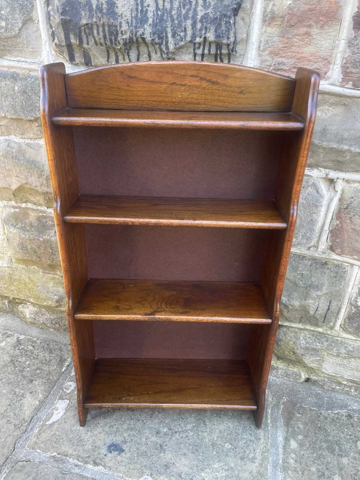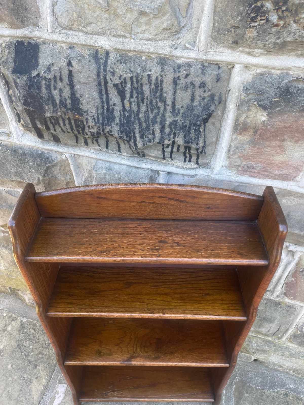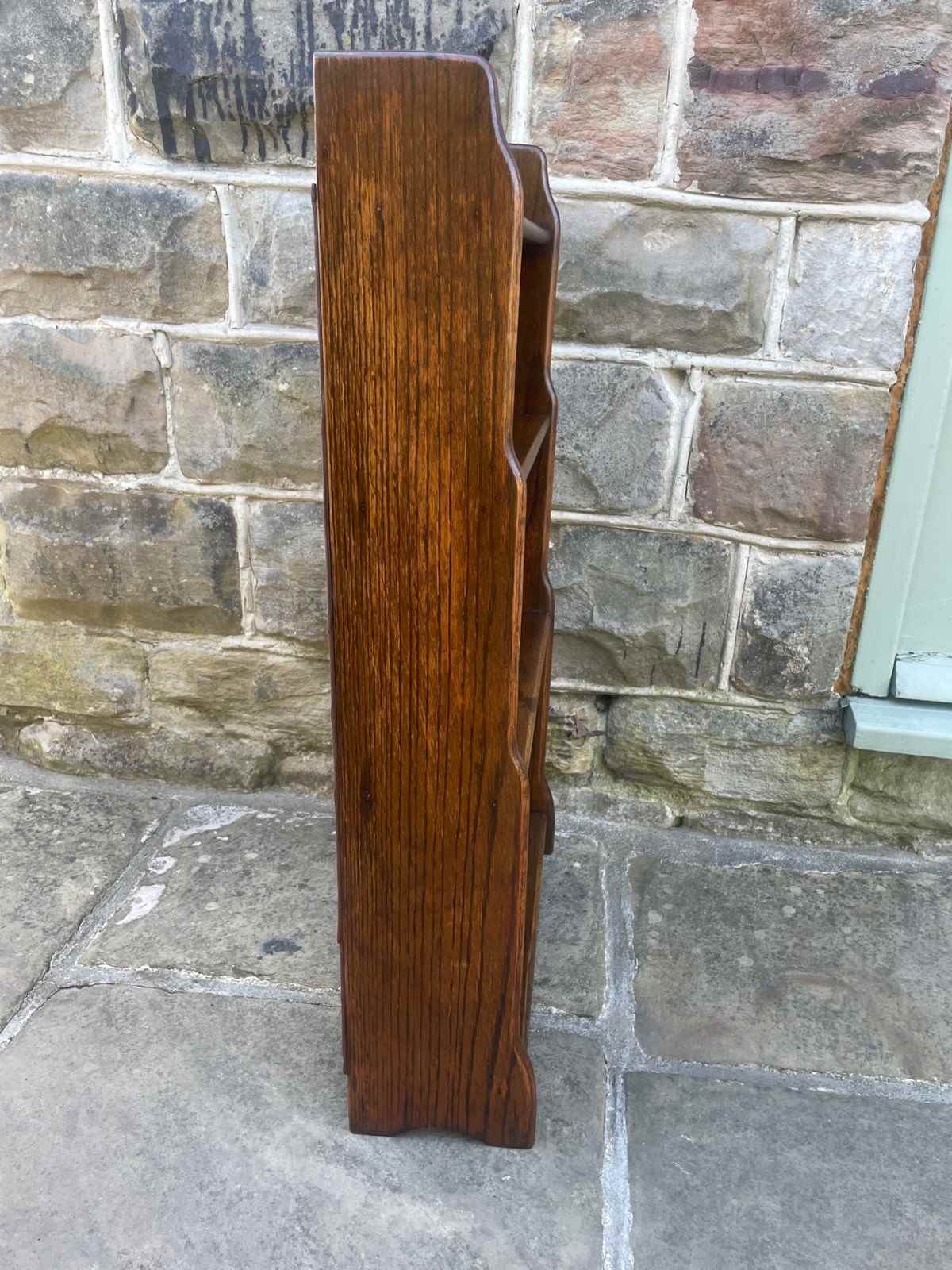 In solid oak, raised gallery top having 4 fixed height shelves, shaped waterfall sides. Polished oak sides.