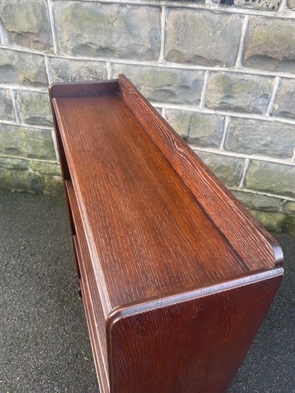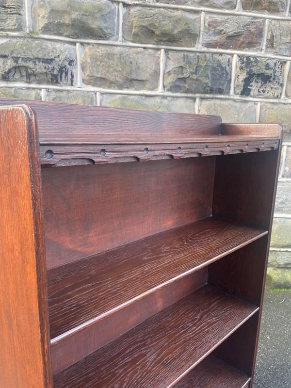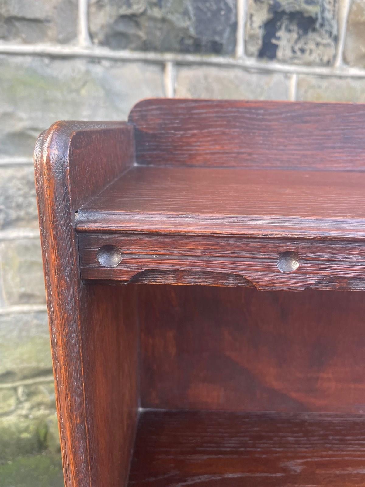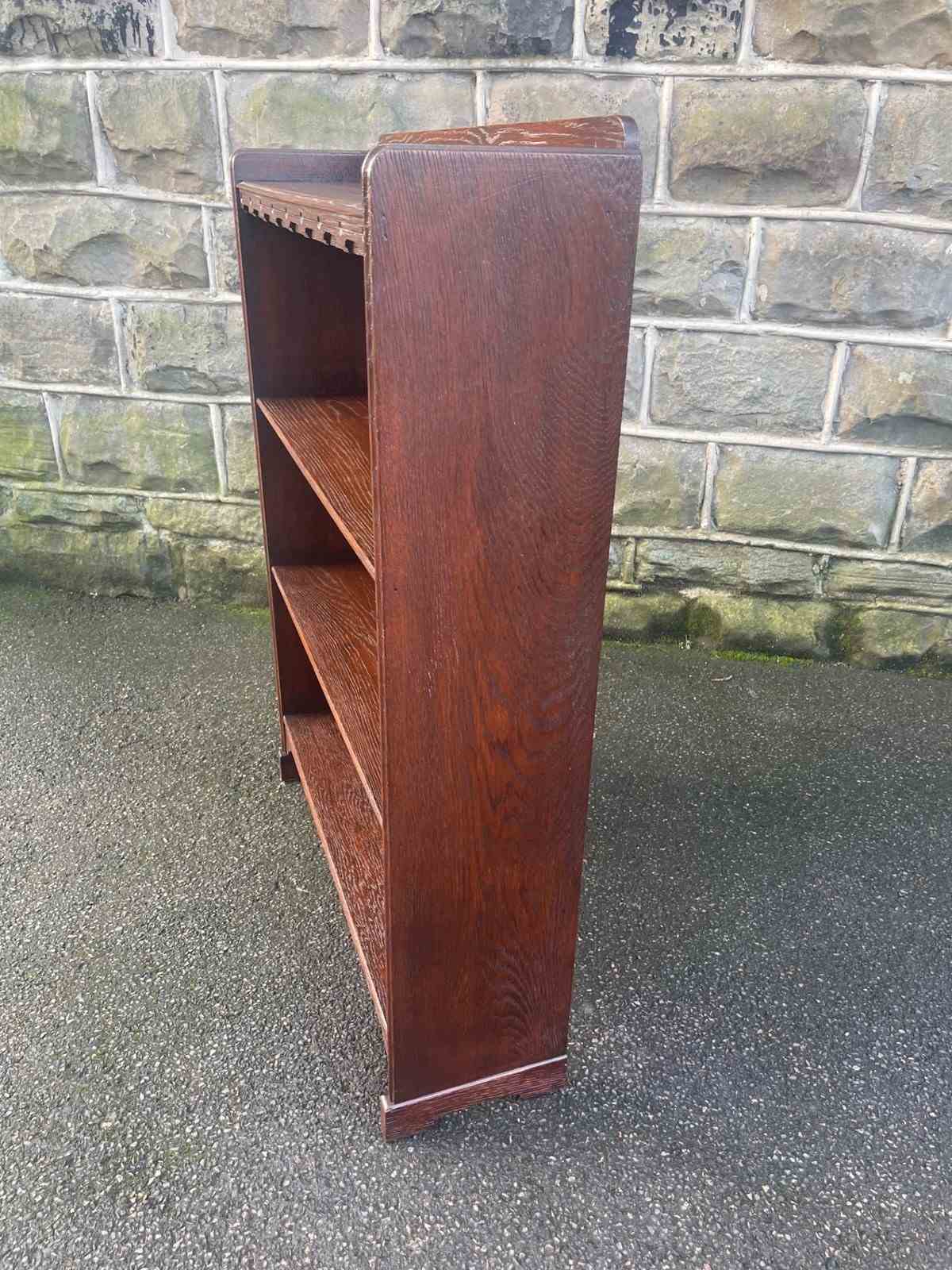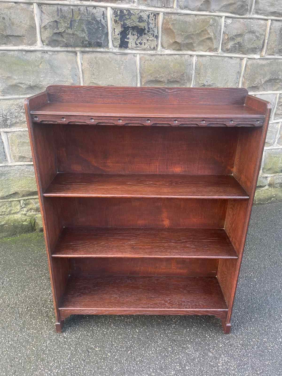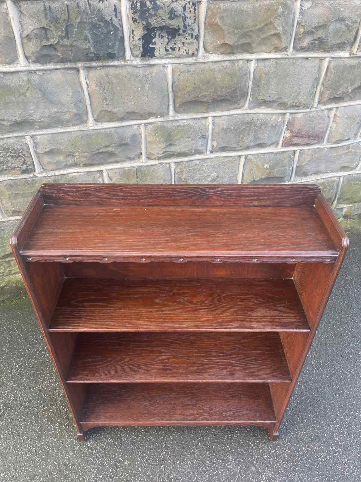 Made from solid oak, raised gallery back, 4 fixed height oak shelves with shaped cut out feet. Polished oak sides.