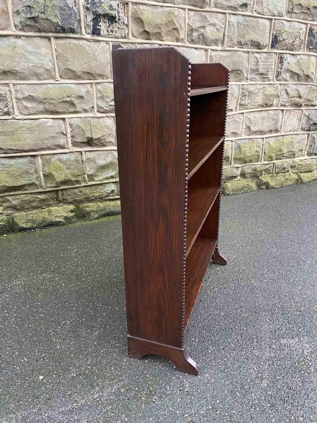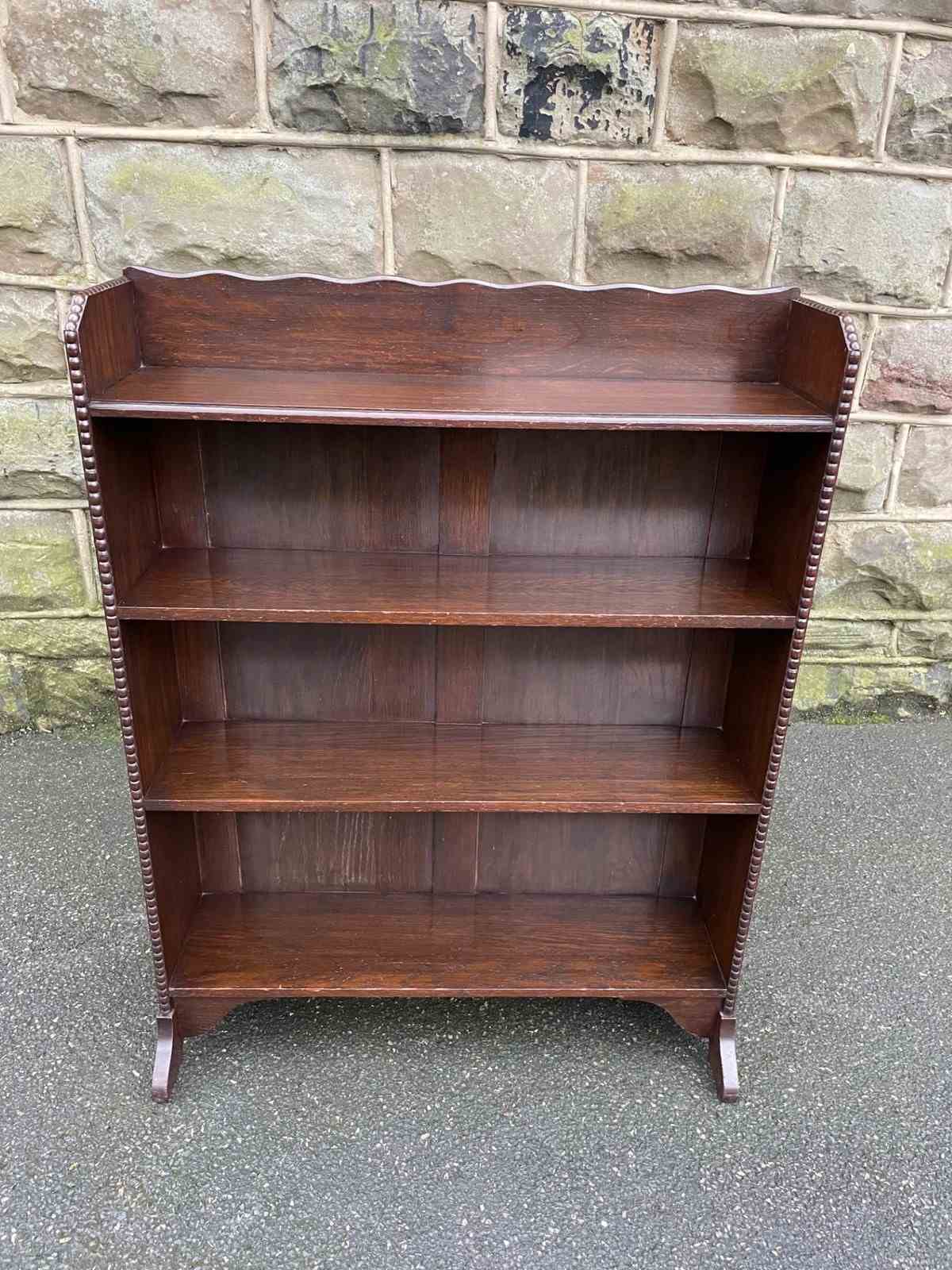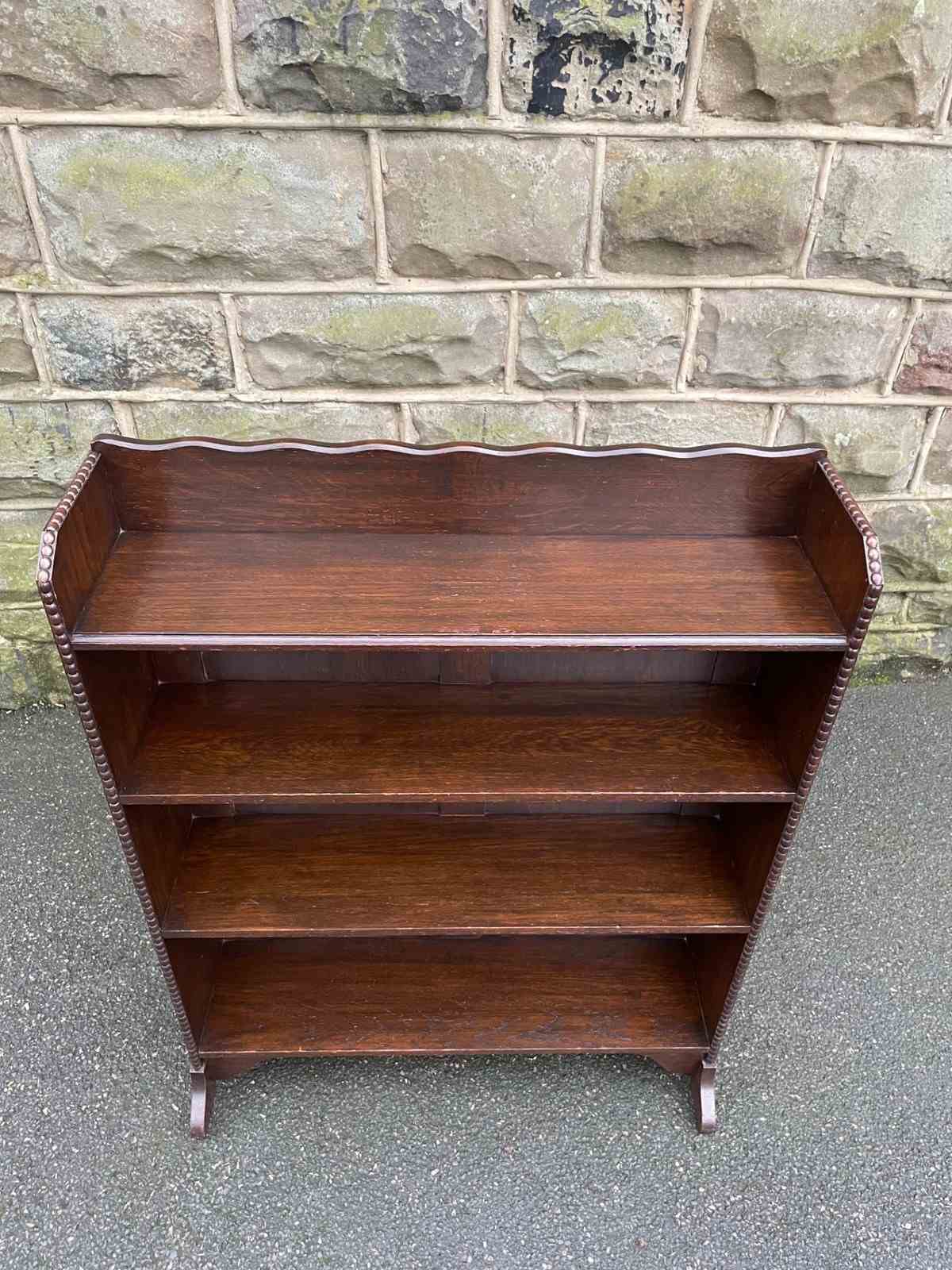 Made from solid oak, raised gallery back, 4 fixed height oak shelves with shaped cut out feet. Polished oak sides.