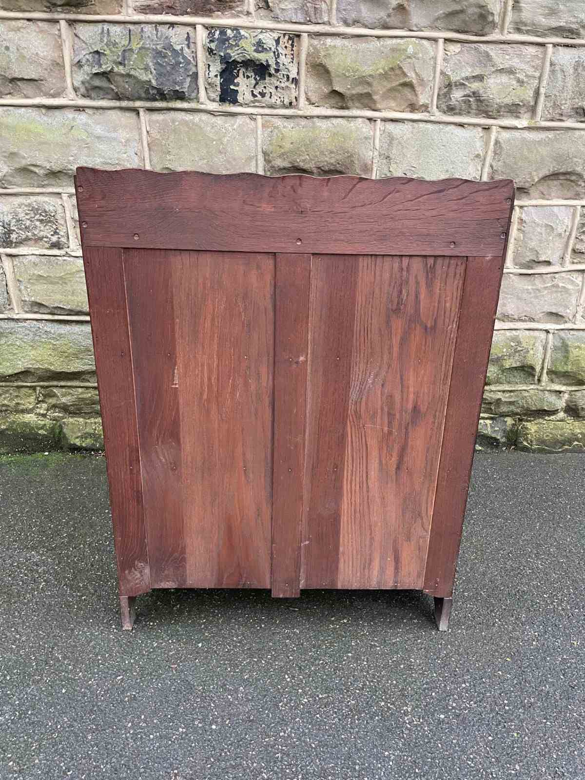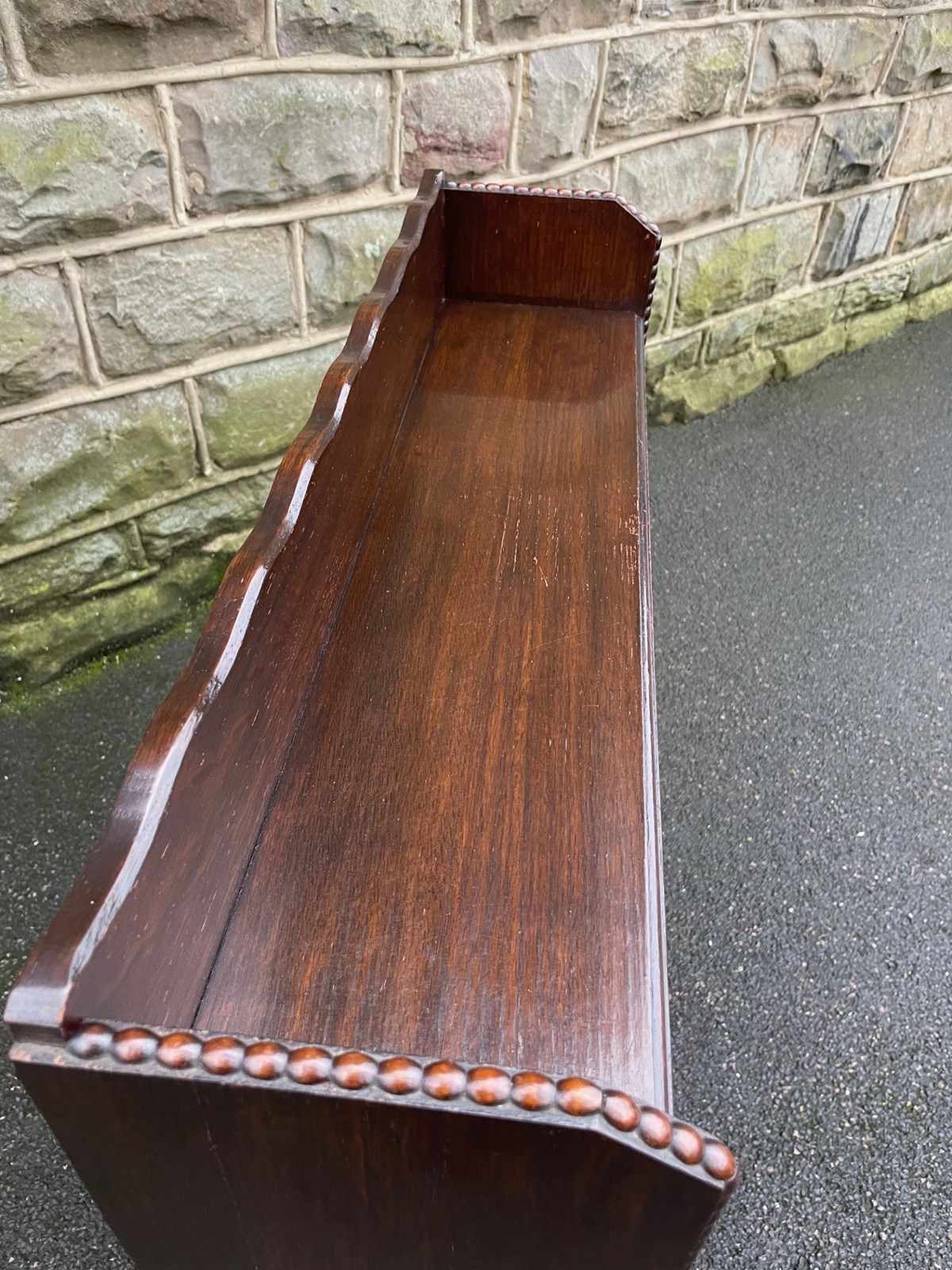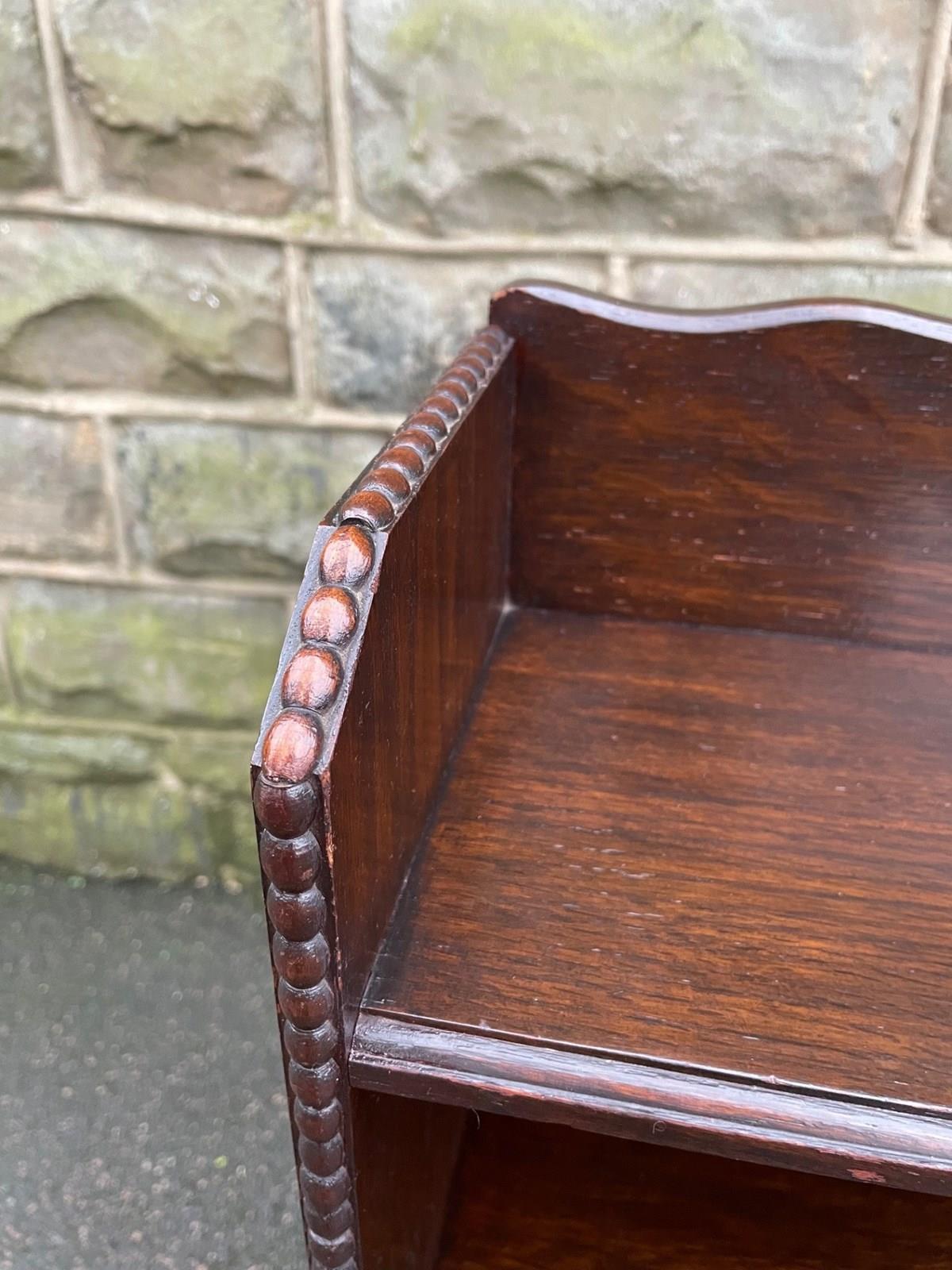 Made from solid oak, raised gallery back, 4 fixed height oak shelves with shaped cut out feet. Polished oak sides.