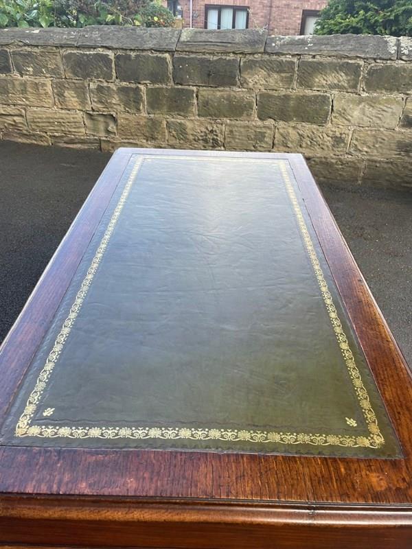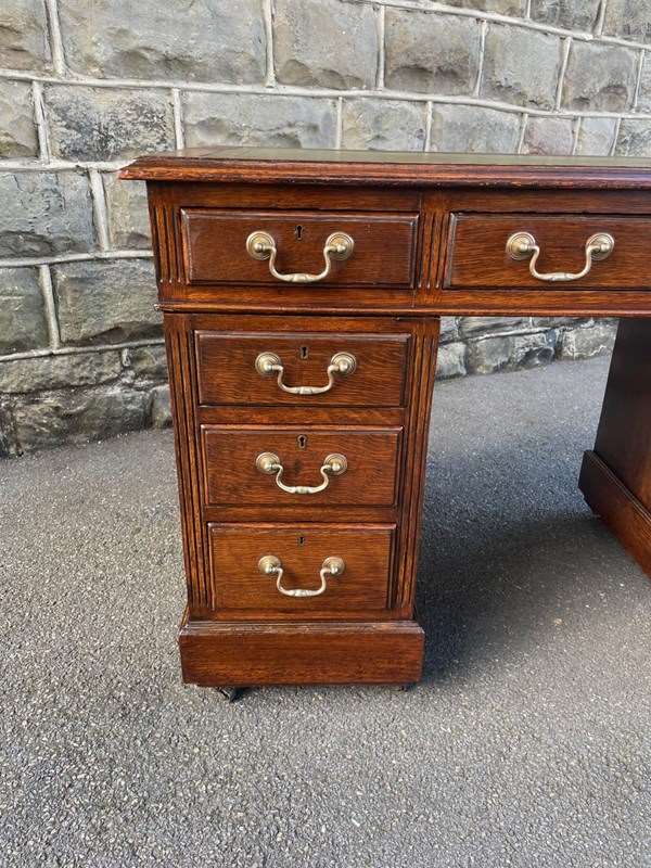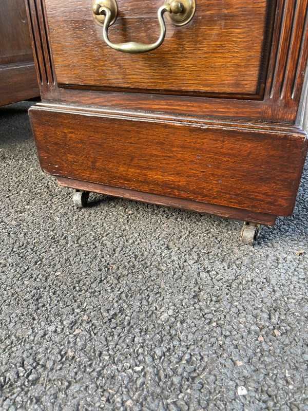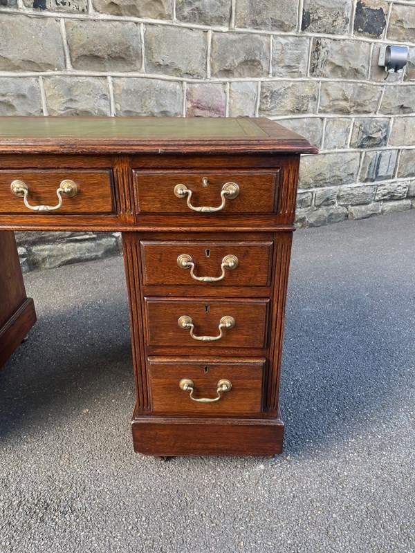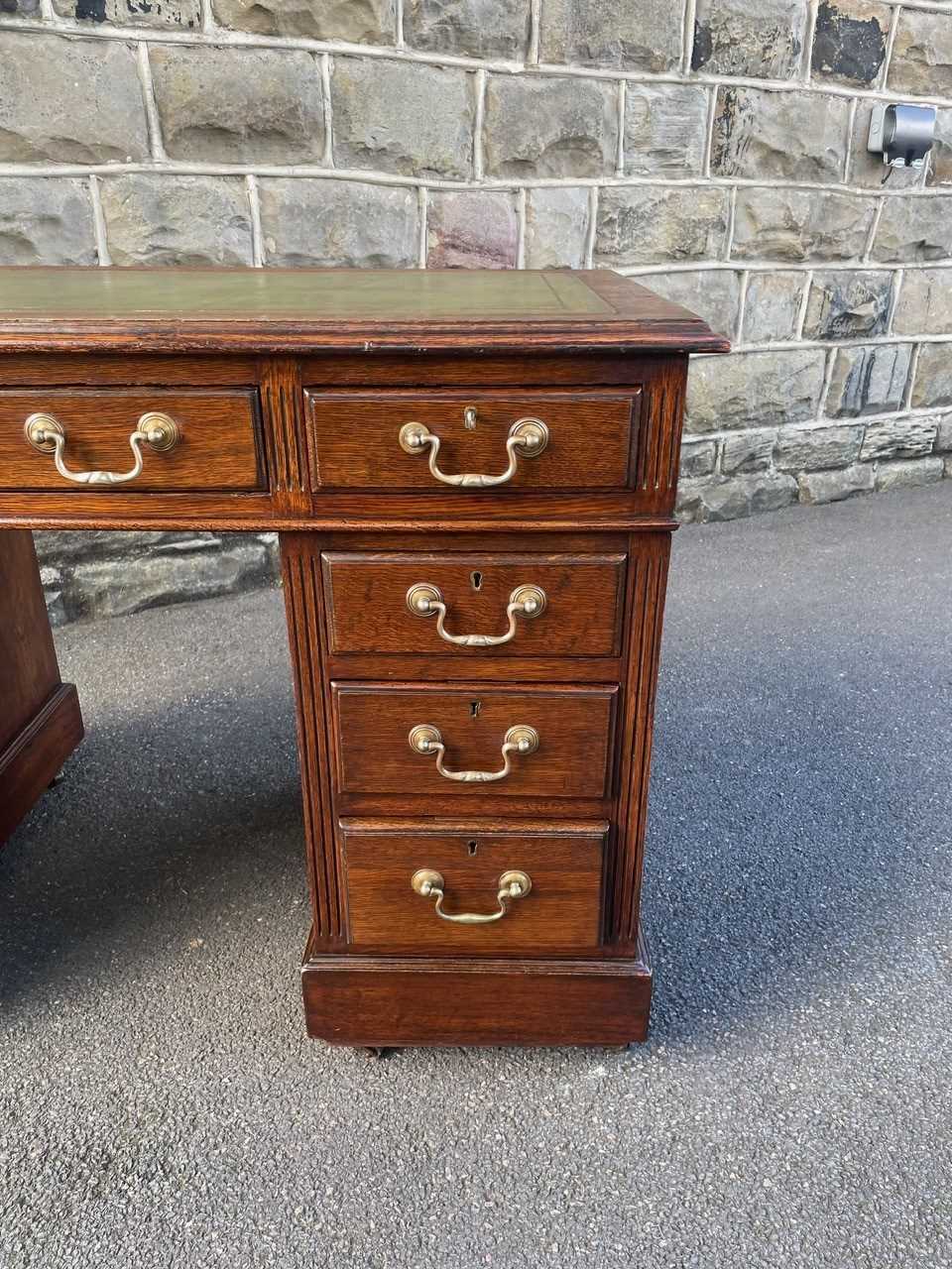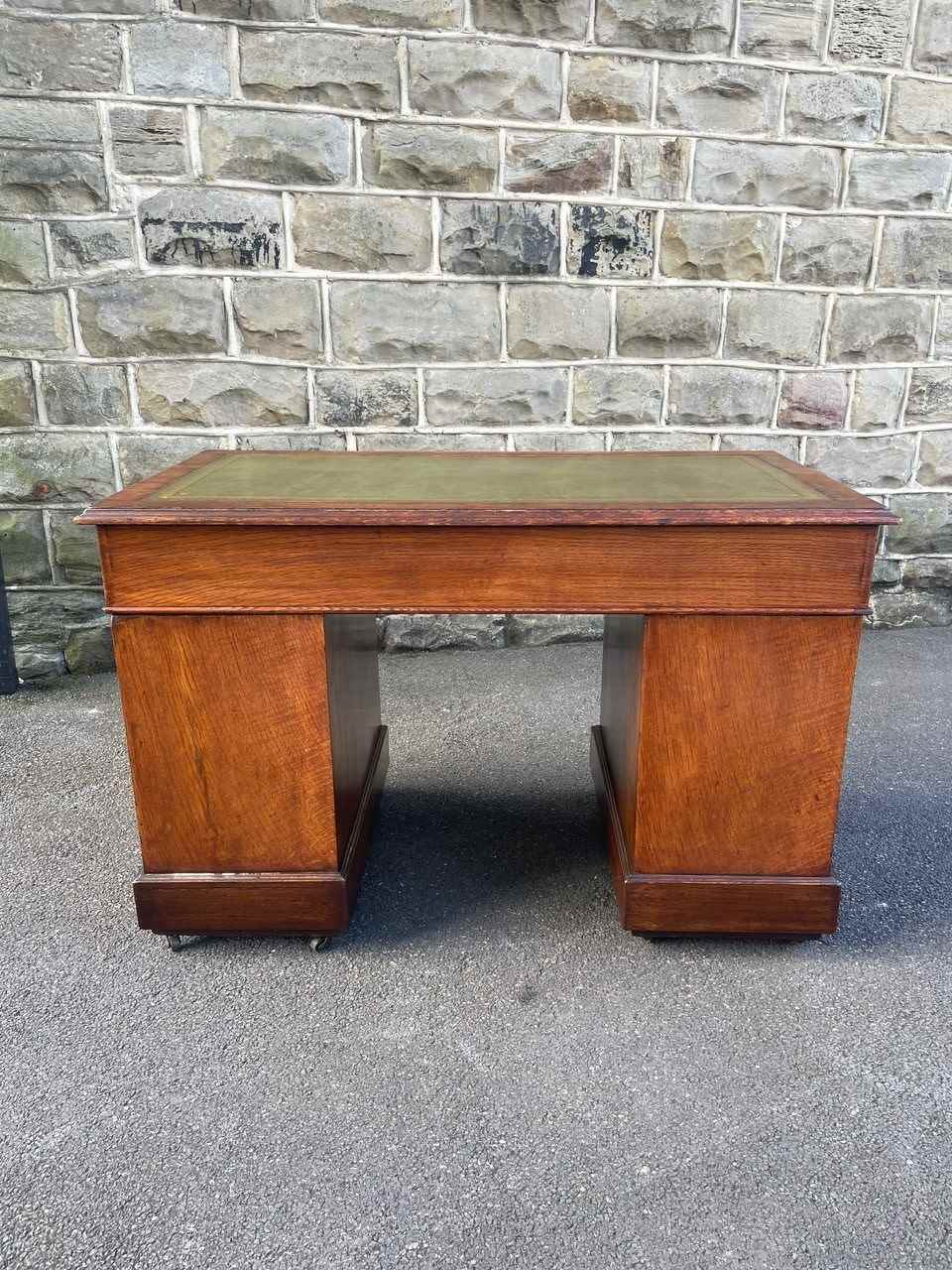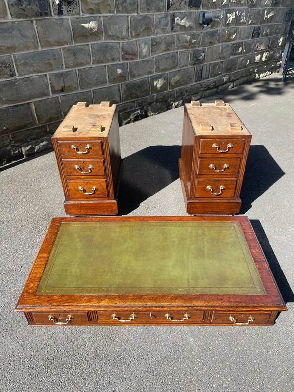 Nice quality having an olive green tooled leather top, 3 draws across the top and 3 graduated draws to each pedestal. All the draws have brass swan neck drop handles, brass locks to all the draws, with a key. Polished oak sides & back standing on a plinth base with castors underneath so easy to move around. The desk splits into 3 parts