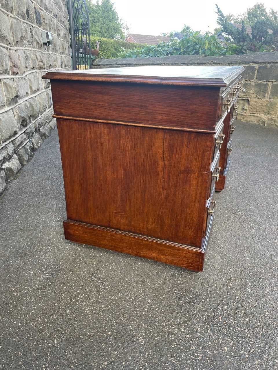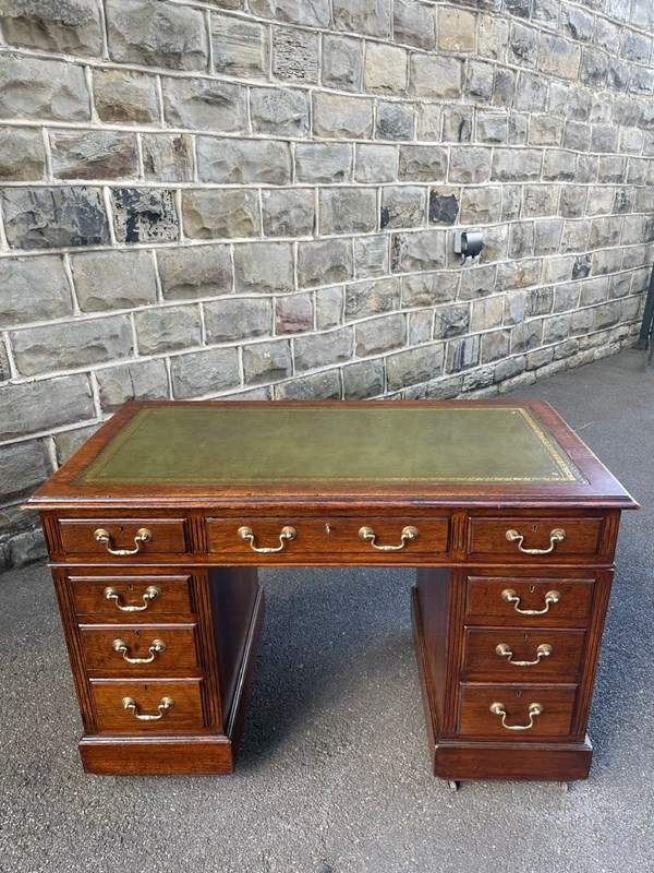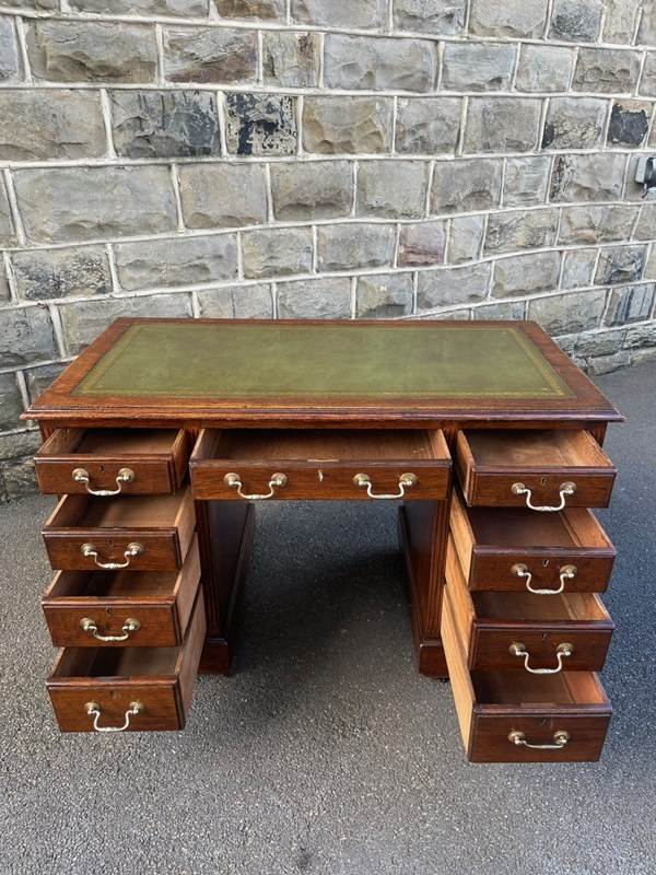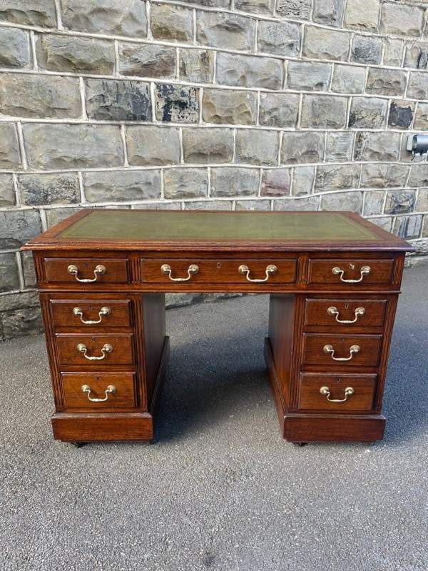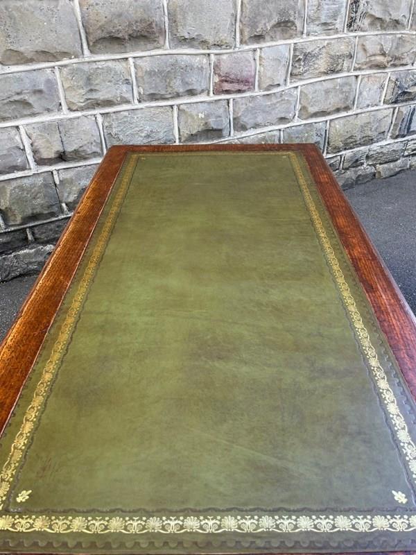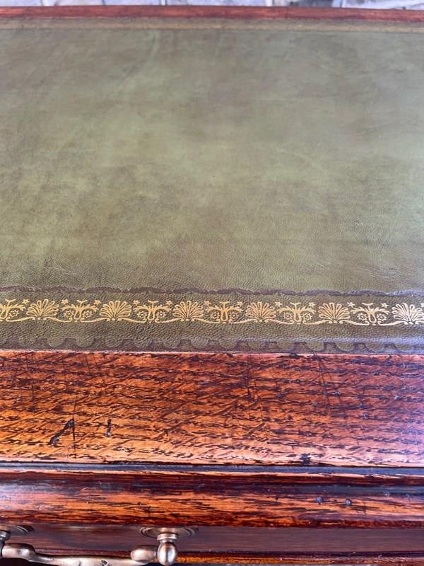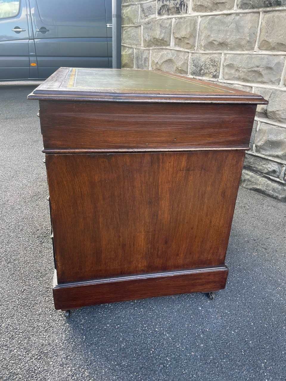 Nice quality having an olive green tooled leather top, 3 draws across the top and 3 graduated draws to each pedestal. All the draws have brass swan neck drop handles, brass locks to all the draws, with a key. Polished oak sides & back standing on a plinth base with castors underneath so easy to move around. The desk splits into 3 parts